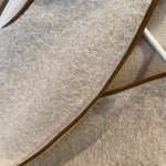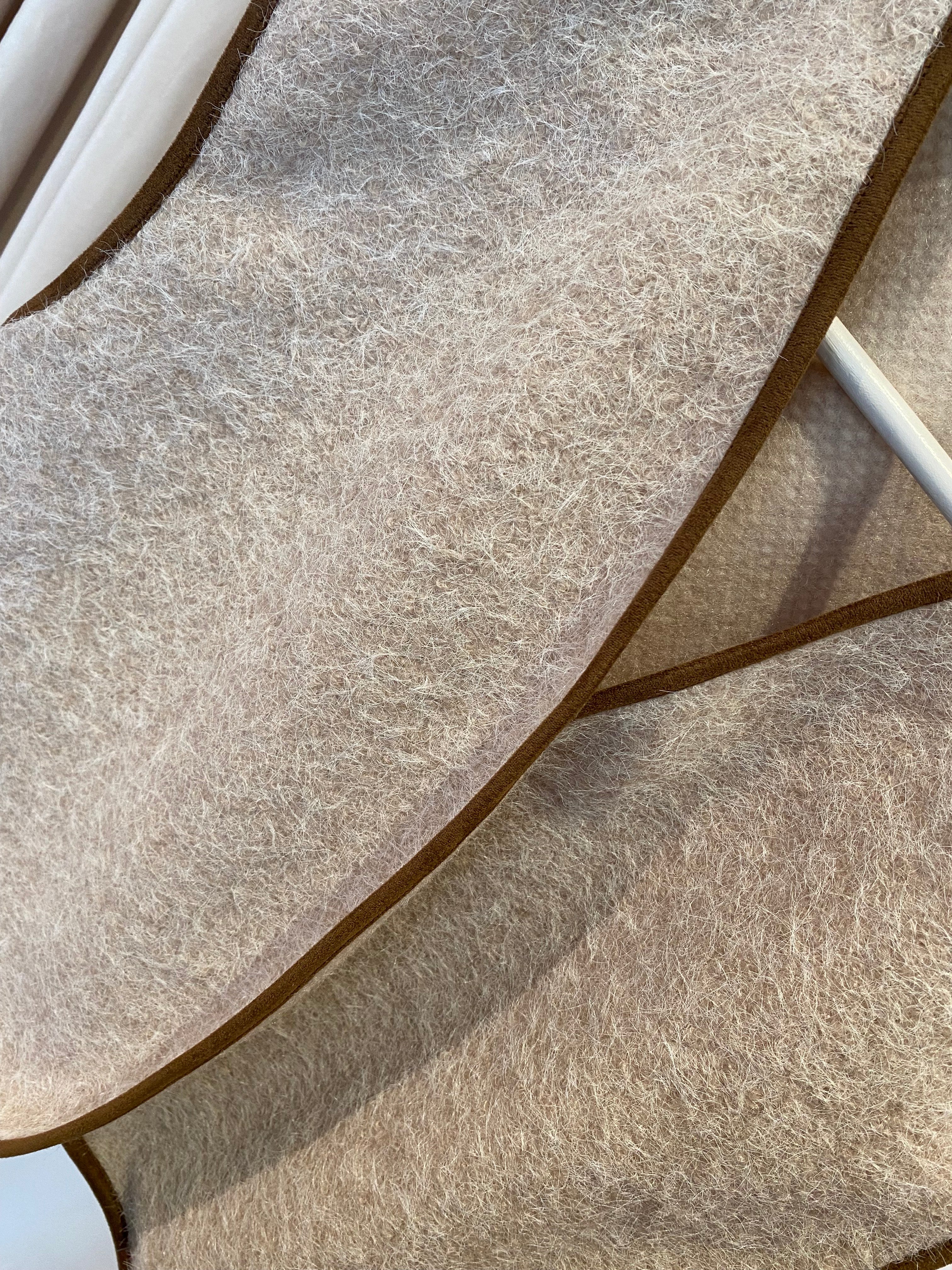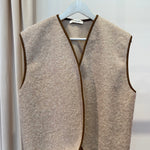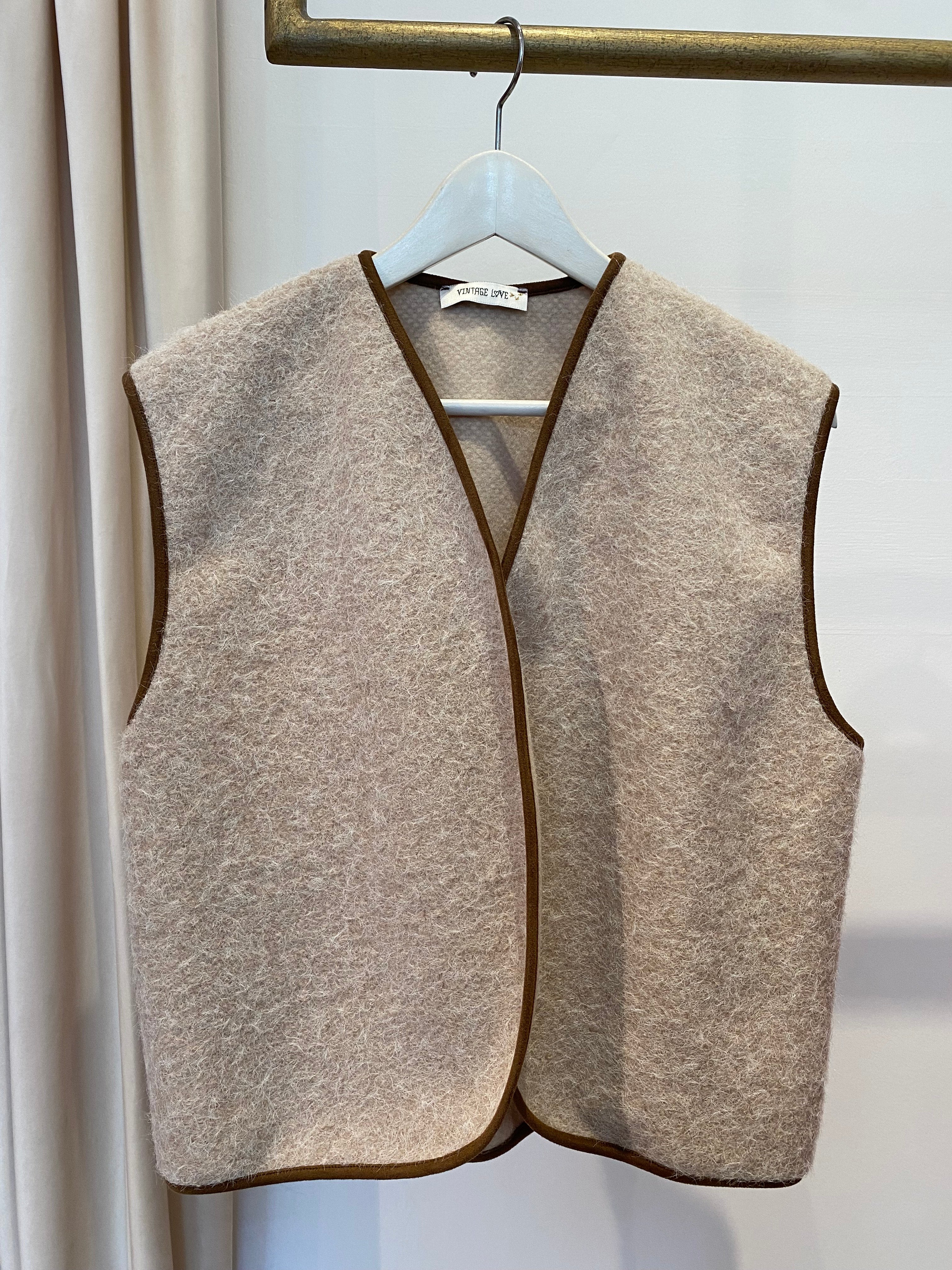 Colete com pêlo em bege e costuras em camel.