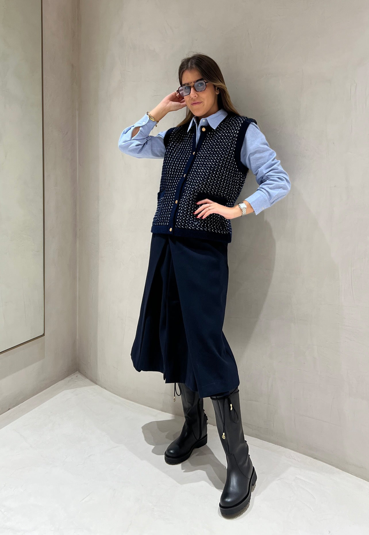 Colete em malha de lã tricotada em azul marinho com fecho de botões e bolsos à frente.