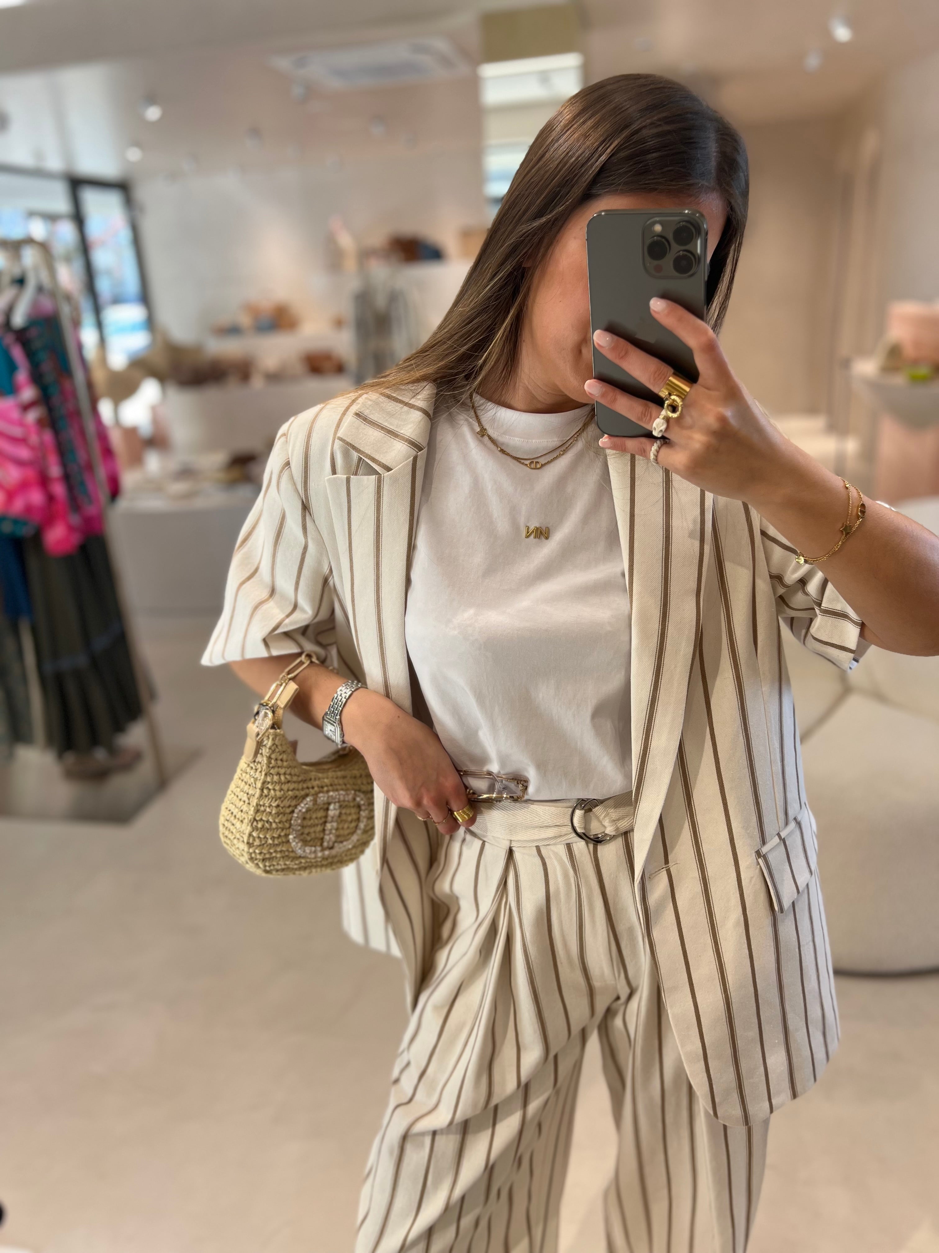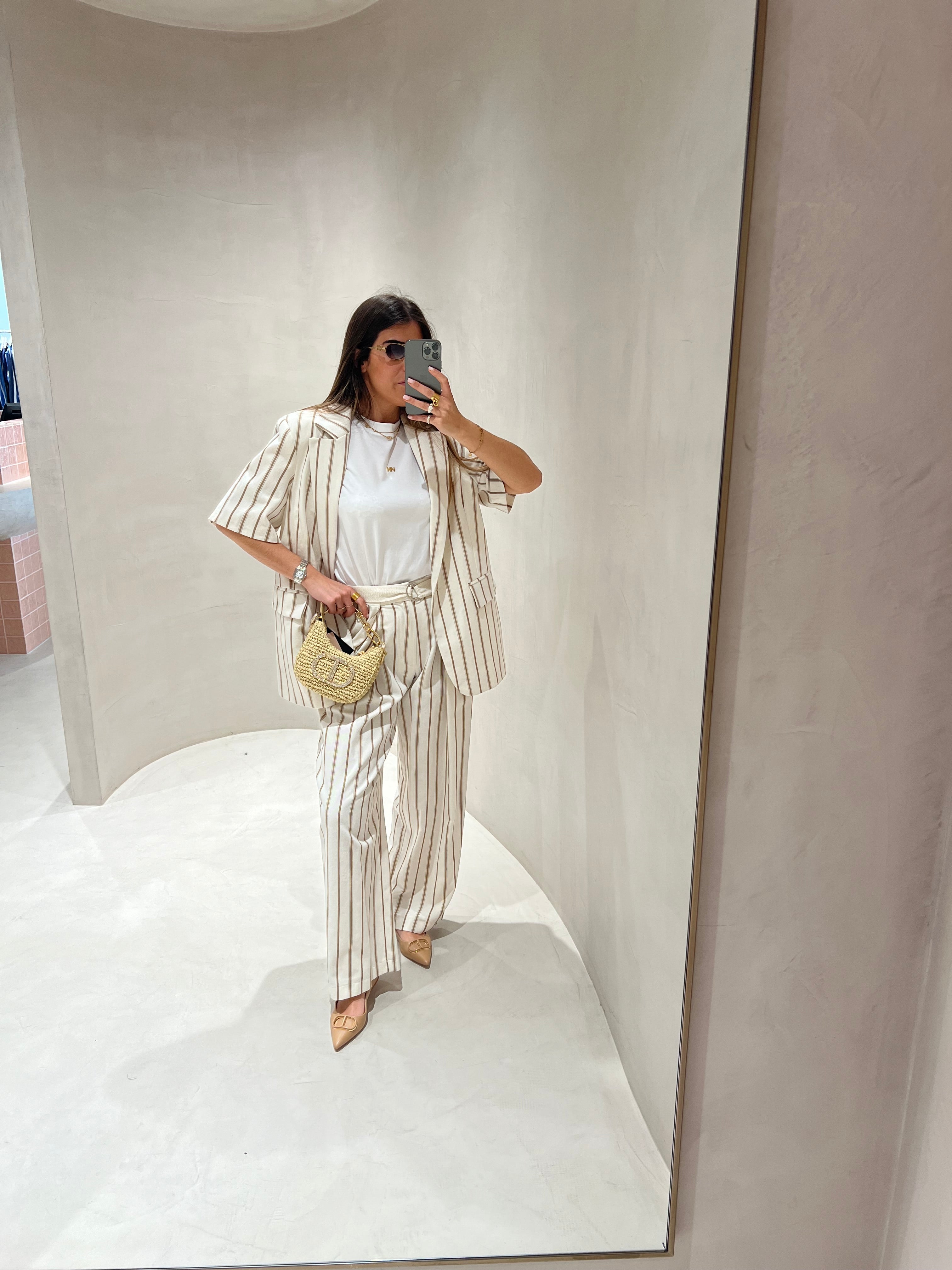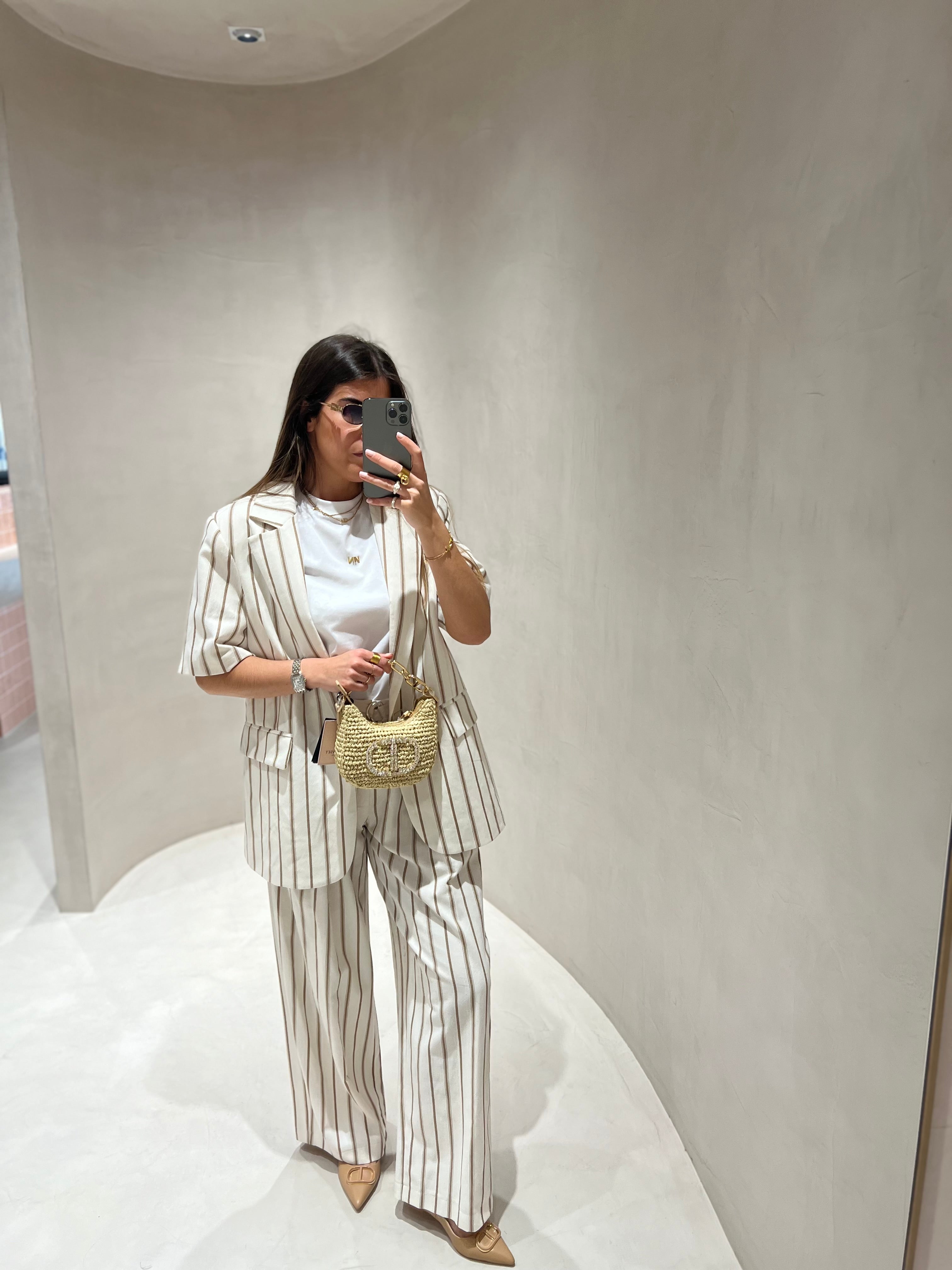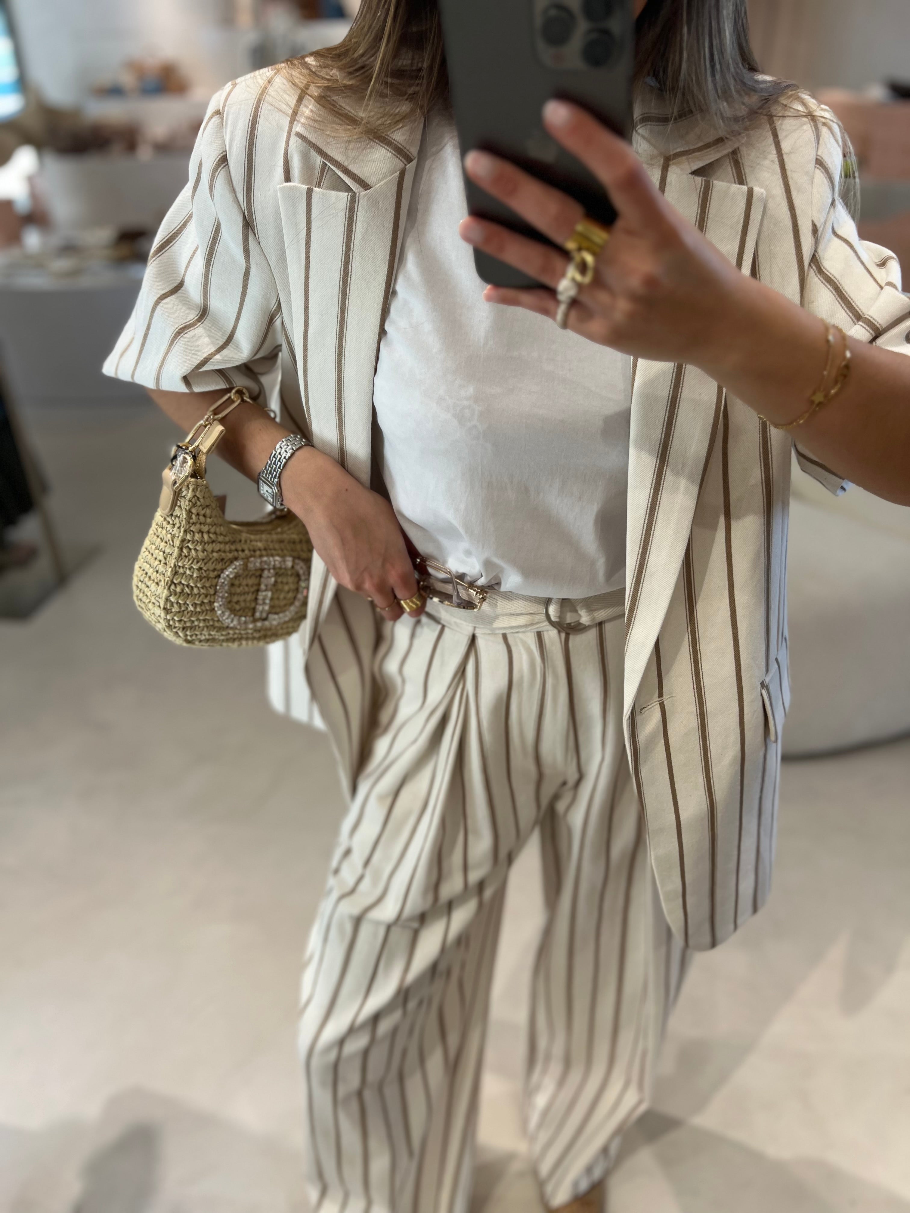 Casaco bege com riscas verticais, golas de lapela fecho de trespasse com botão à frente e bolsos de chapa na lateral.