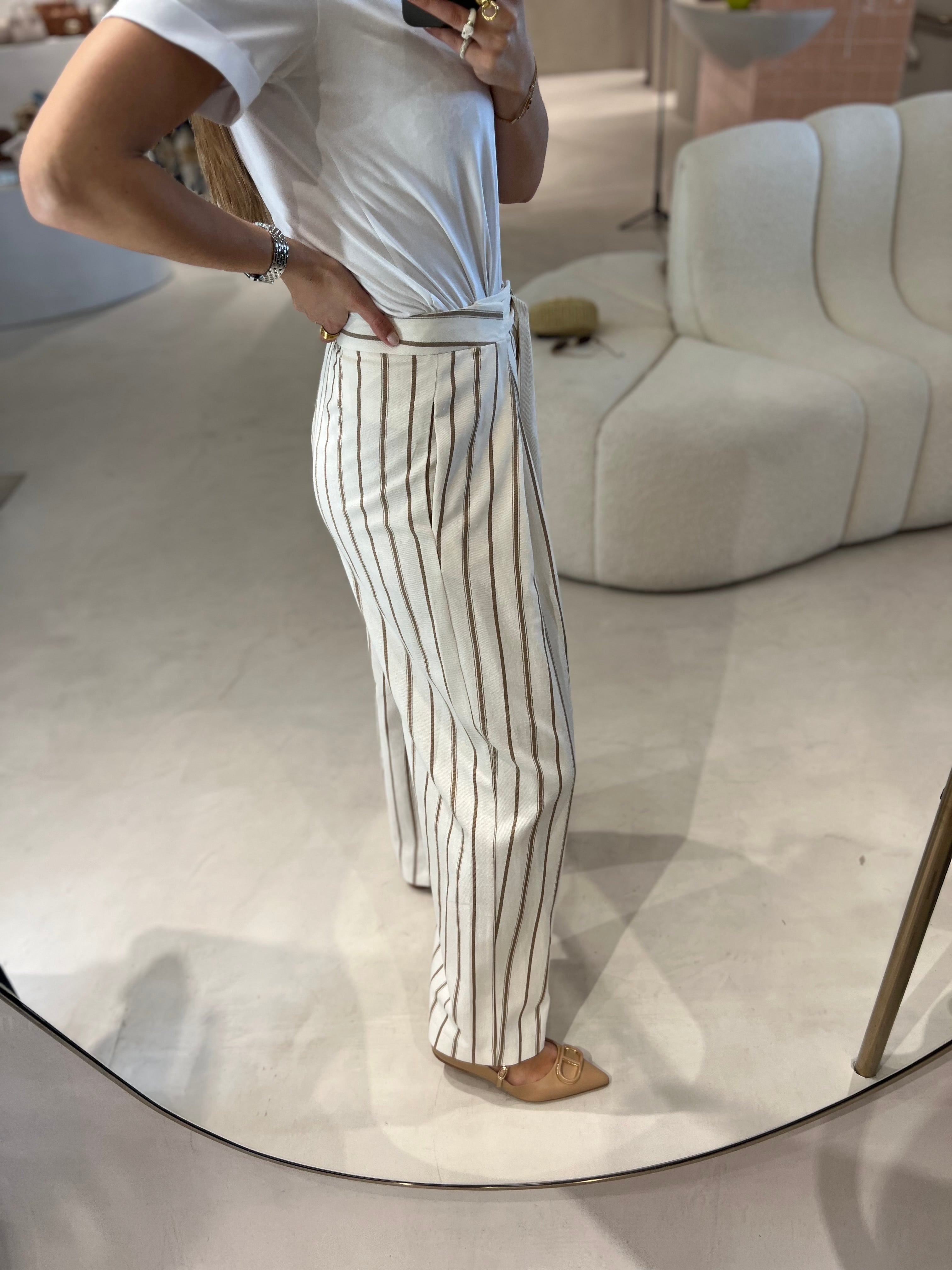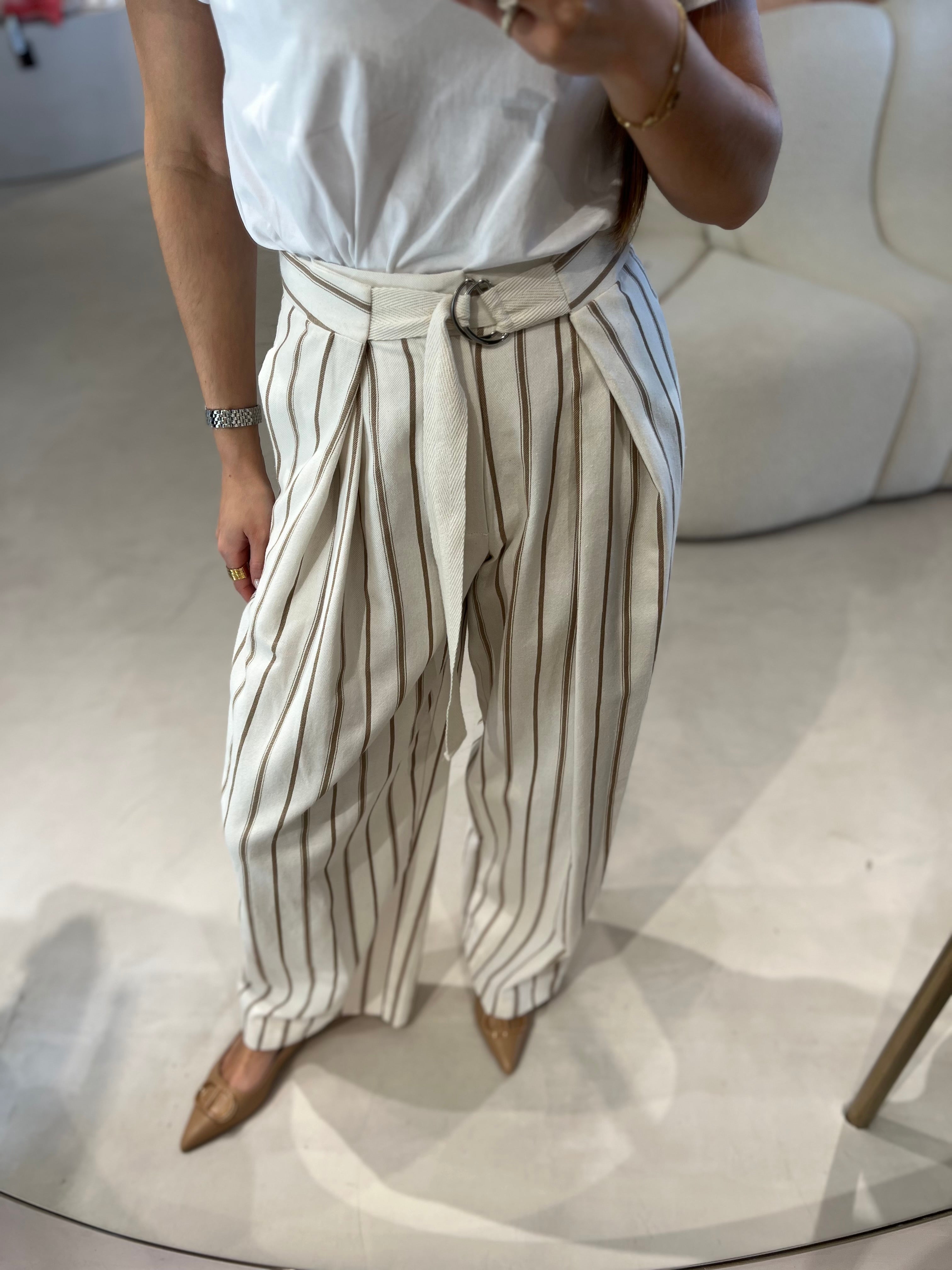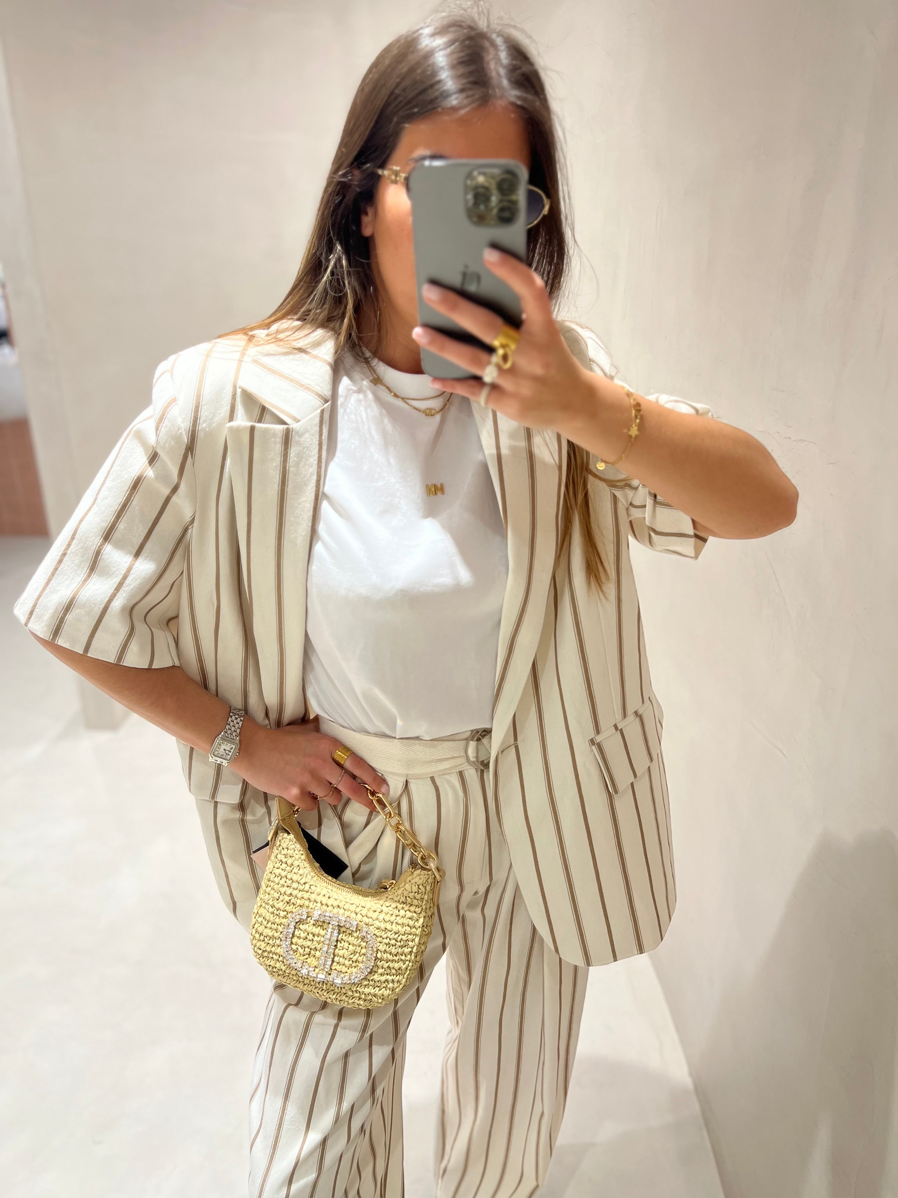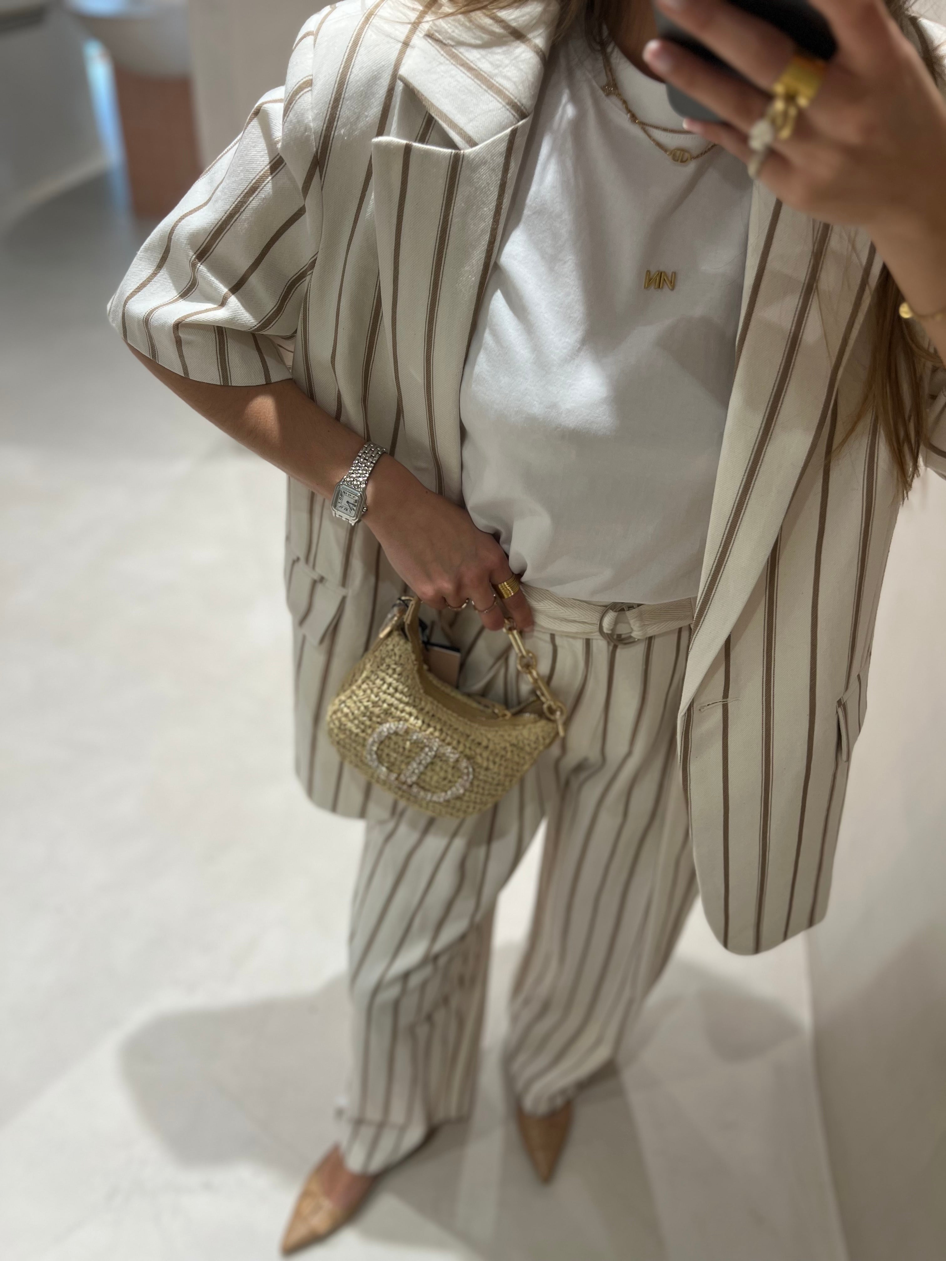 Casaco bege com riscas verticais, golas de lapela fecho de trespasse com botão à frente e bolsos de chapa na lateral.