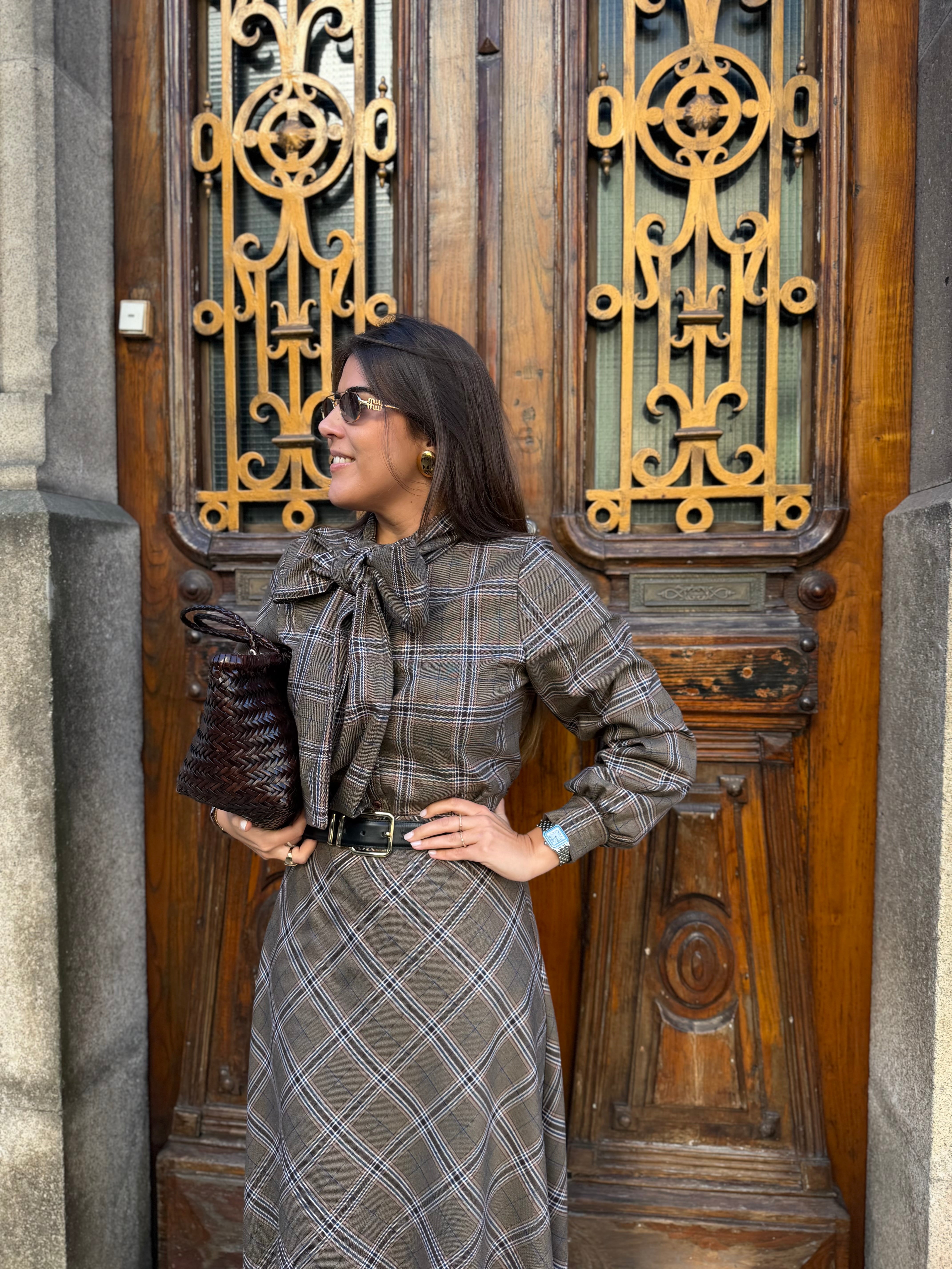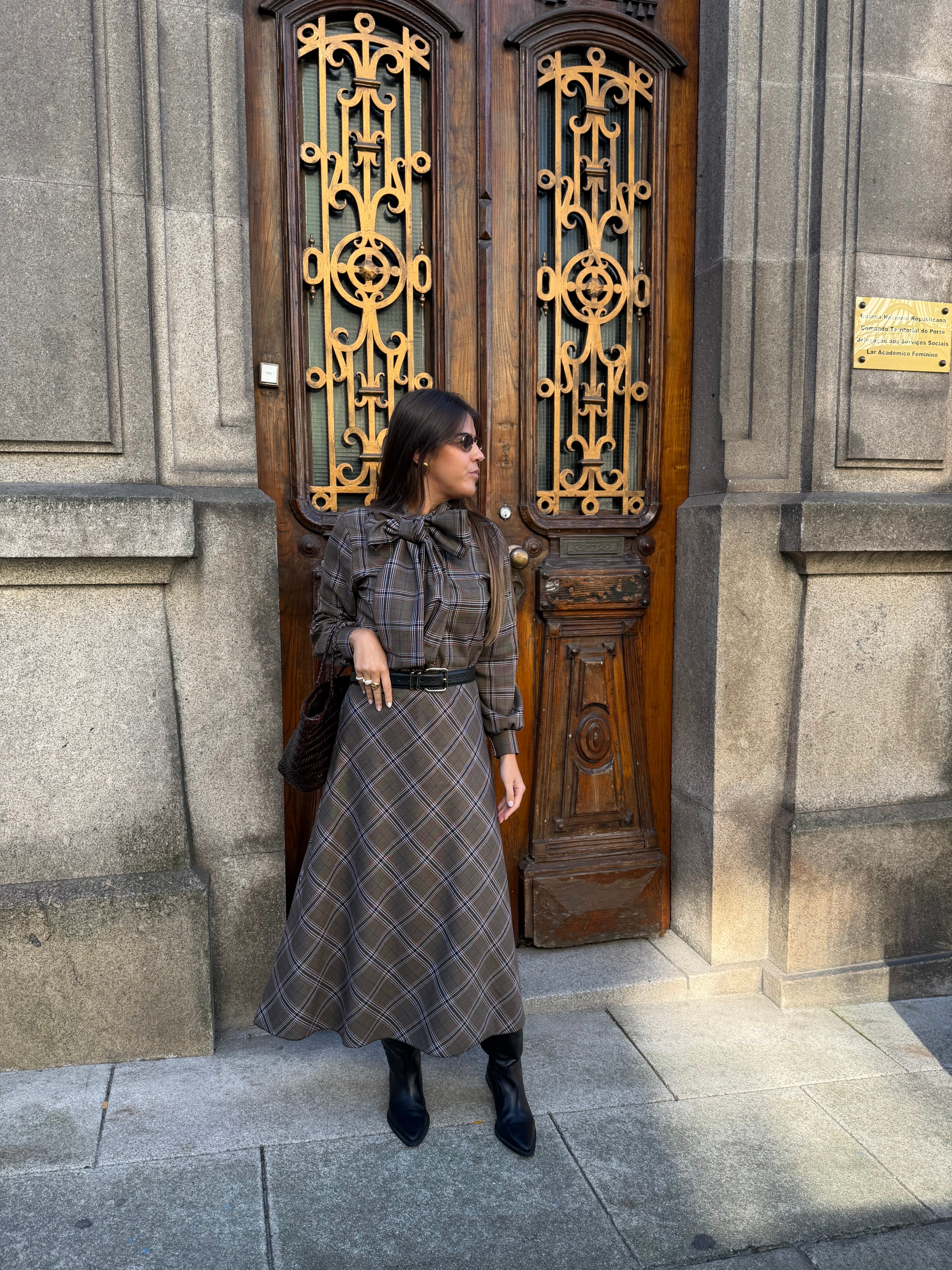 A blusa complementa perfeitamente com o mesmo padrão de quadrados em tons castanhos, sendo feita num tecido misto de poliéster e algodão que oferece aconchego. O seu detalhe principal é um laço frontal oversized que adiciona feminilidade e charme, enquanto as mangas compridas com ligeiro volume equilibram a silhueta e o corte recto adapta-se bem ao corpo.