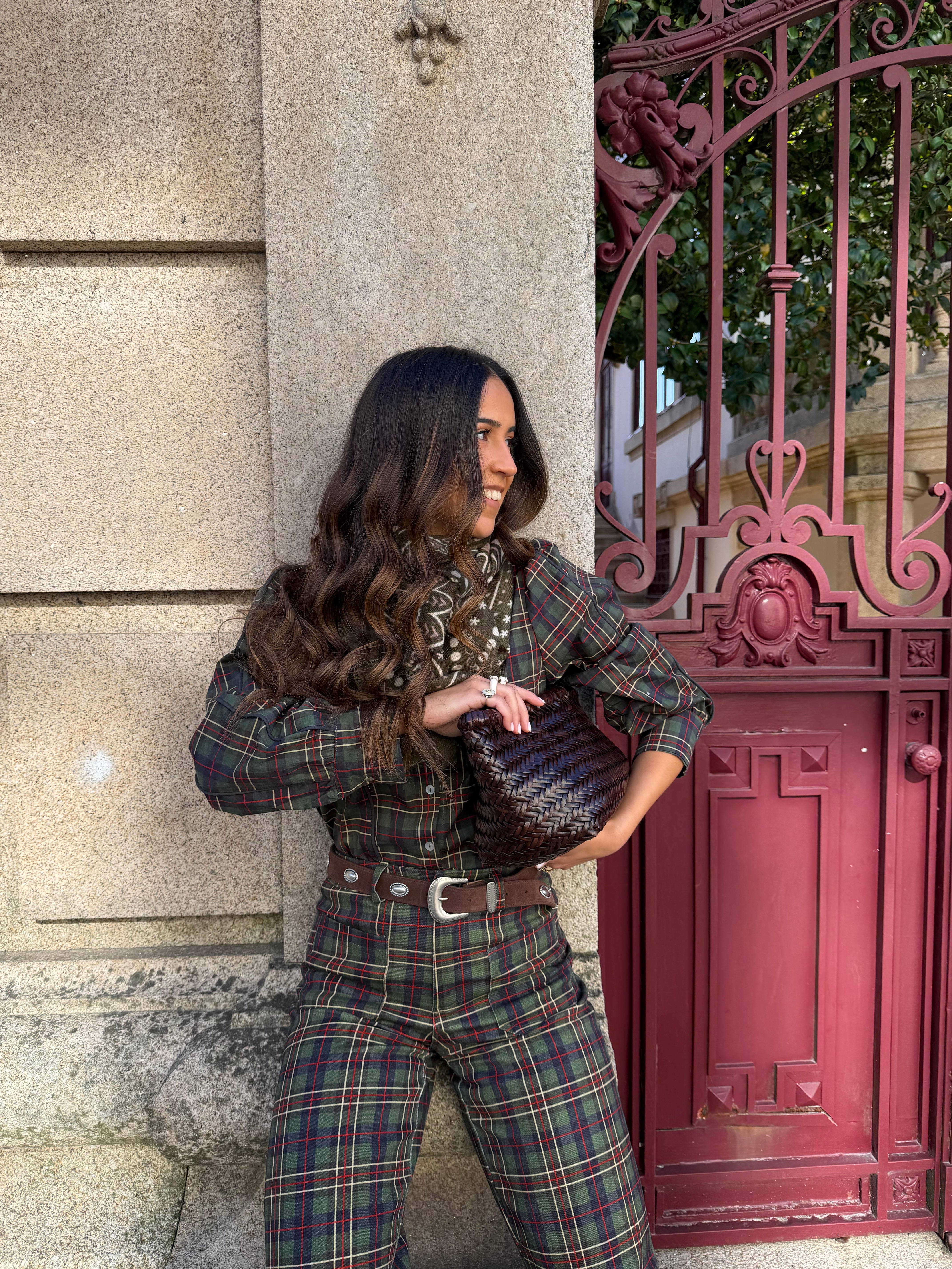 O conjunto Liora Escocês combina as calças de corte direito em denim com padrão de quadrados escoceses e uma blusa de manga comprida no mesmo padrão, criando um coordenado harmonioso e cheio de personalidade. As calças apresentam uma linha limpa e favorecedora que valoriza a silhueta sem comprometer o conforto, sendo ideais para usar com botins, mocassins ou ténis, consoante o look que pretendas.
