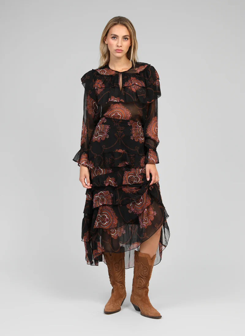 Esta saia longa aposta num corte fluido e largo, com cintura parcialmente elástica atrás e frente lisa, confeccionada em tecido leve com estampado “Bohemia” e detalhe com folhos, conferindo movimento e sofisticação. Ideal para dias mais frescos ou look de transição, combina com blusas justas ou camisas soltas para um visual romântico e contemporâneo.