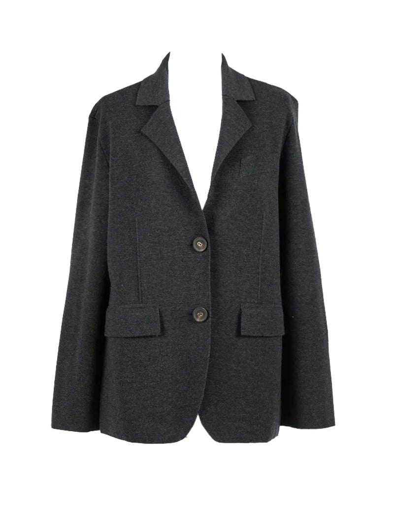 Blazer TWINSET em malha de lã cinza com golas de lapela, fecho de botões à frente e bolsos de lapela.