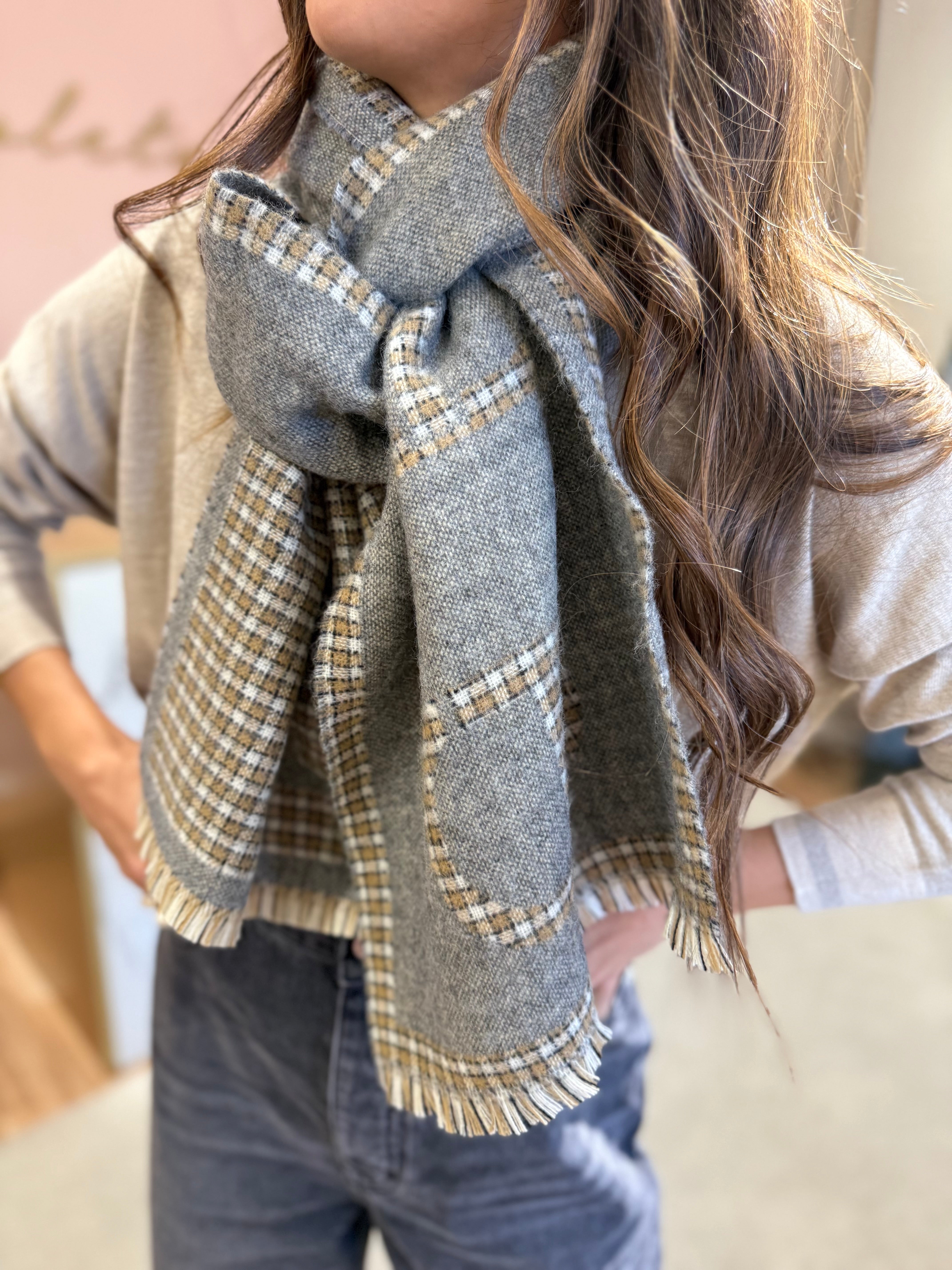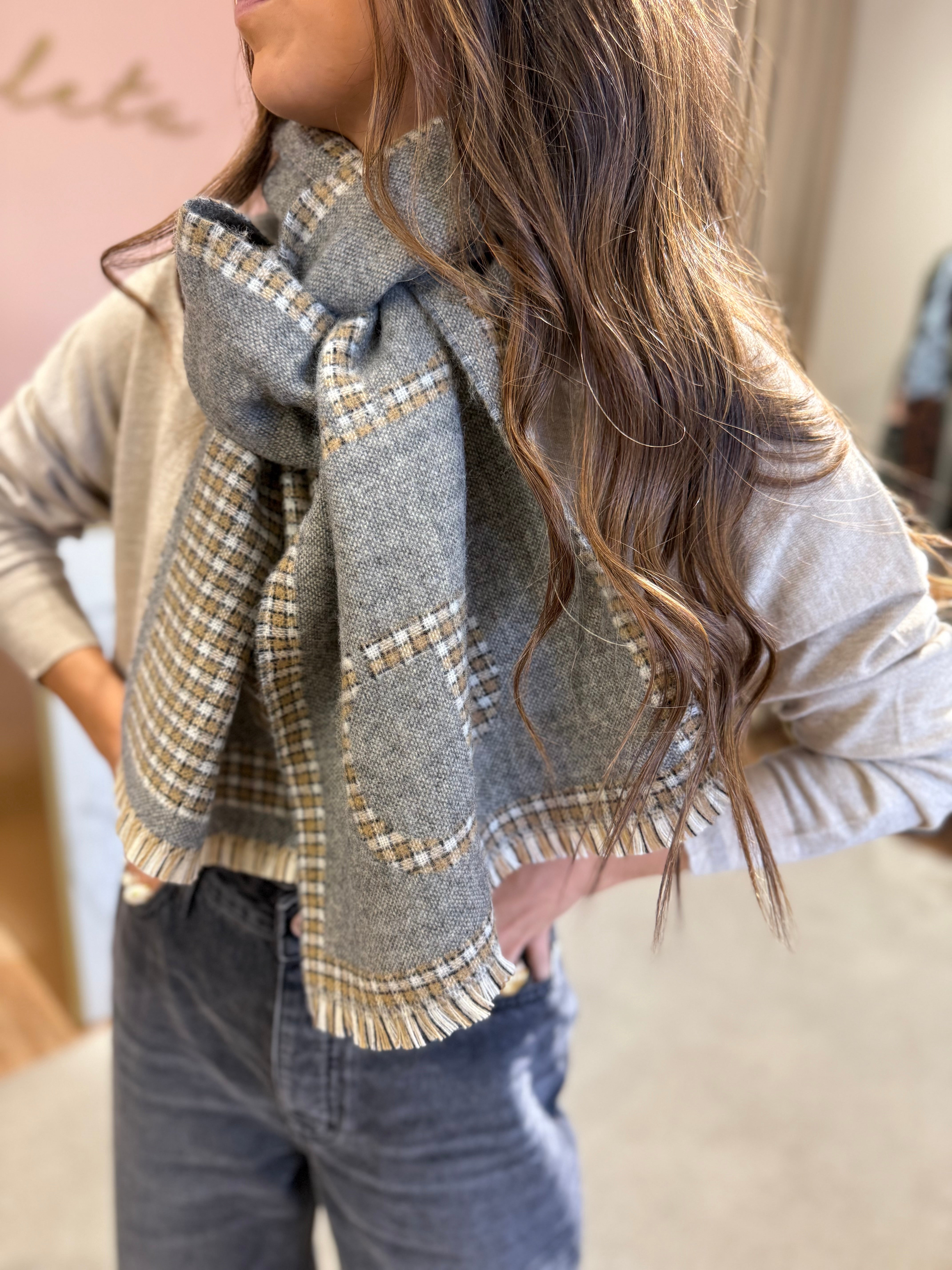Estola em jacquard com padrão xadrez e logotipo Oval T, perfeita para dar um toque sofisticado ao look. O acabamento desfiado nas pontas traz leveza e modernidade, ideal para usar solta, como cachecol ou com cinto para um efeito fashion.