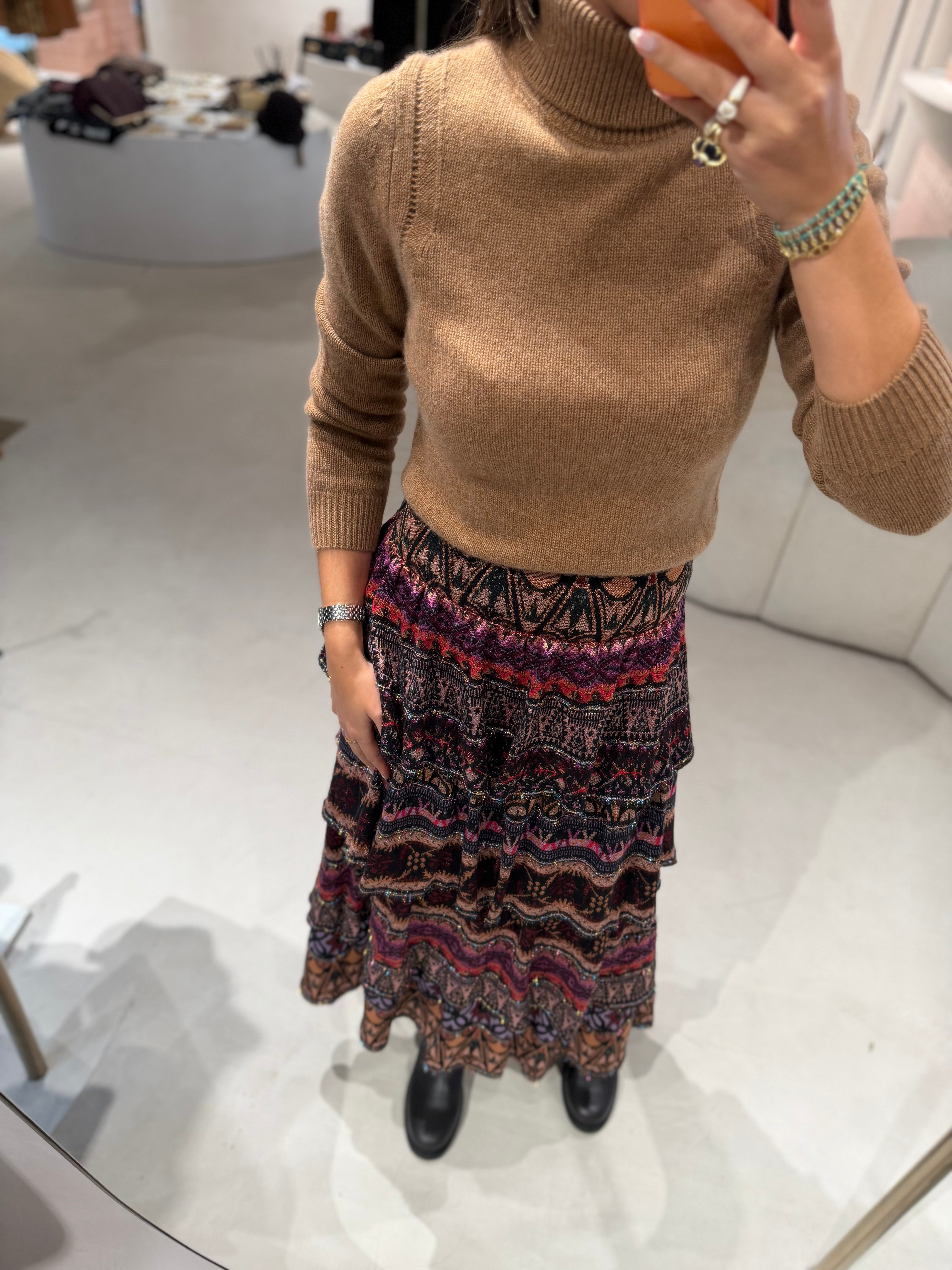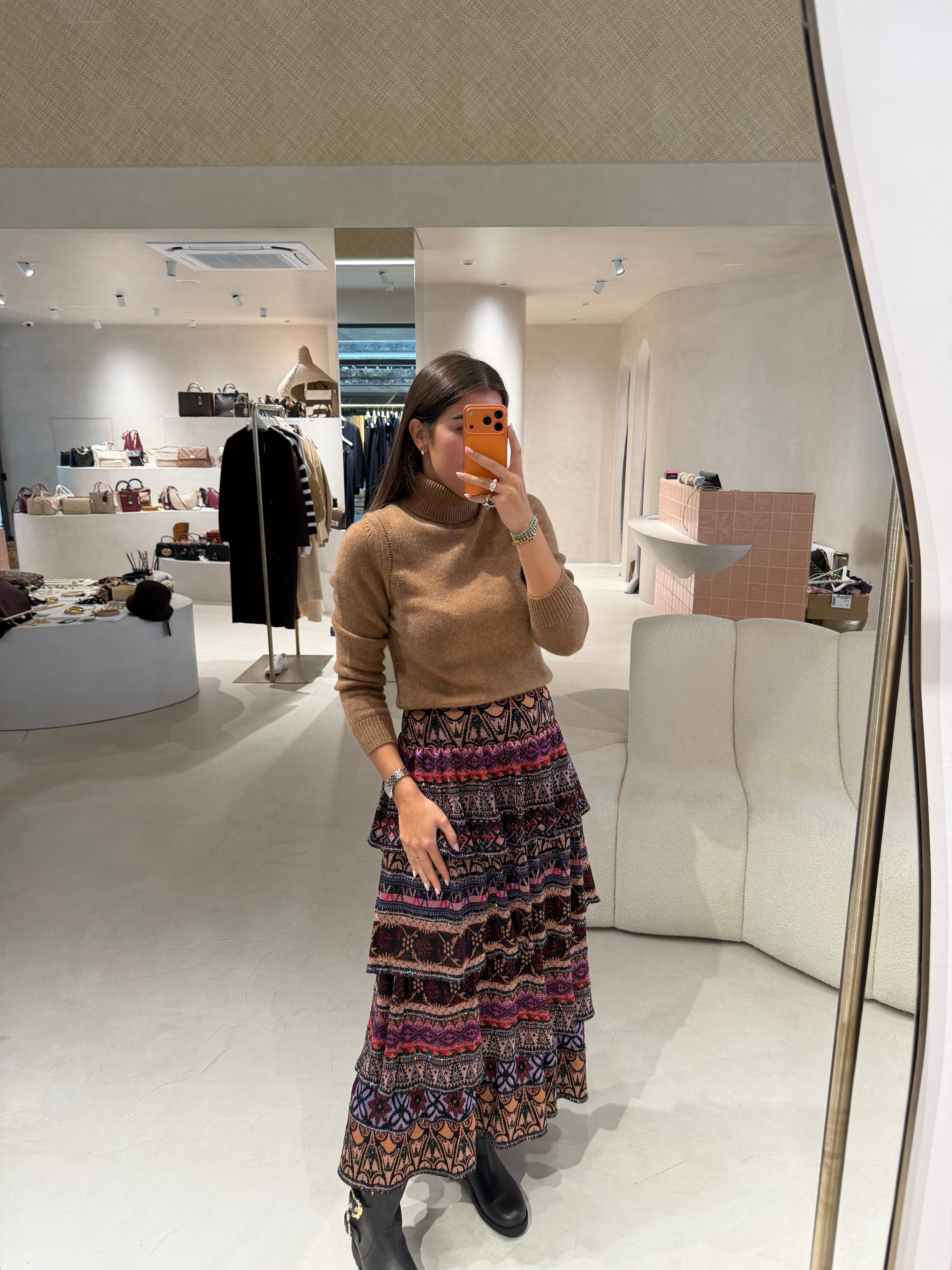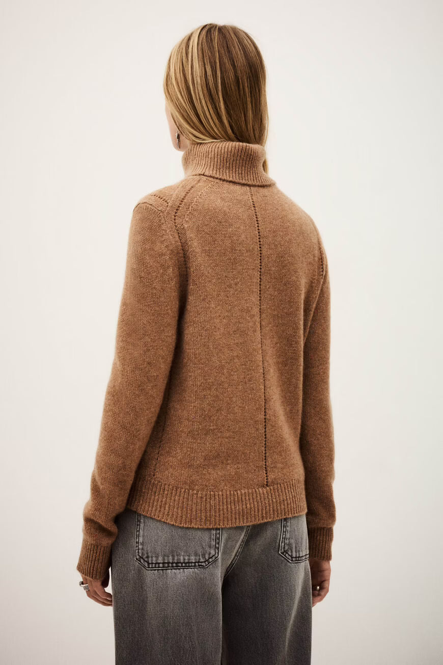 O jumper CHALIE da ba&sh é a personificação do casual chic parisiense. Confeccionado em 100% caxemira premium, este modelo em tom camel quente e versátil envolve o corpo com suavidade e conforto inigualável. O corte ligeiramente solto, o decote redondo e os ombros caídos criam uma silhueta moderna e descontraída, perfeita para looks de outono e inverno com um toque de sofisticação natural.