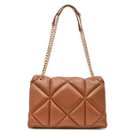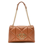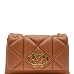 Mala acolchoada Love Moschino camel com logo metálico à frente, compartimento interior com fecho de correr, alça em corrente e fecho com aba magnética.