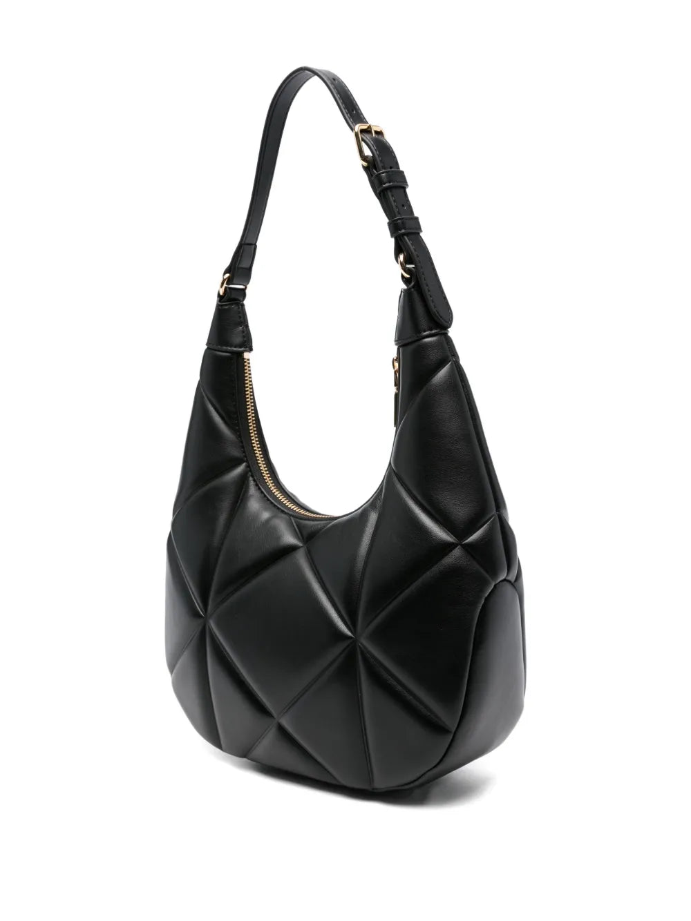 Mala de mão Love Moschino em camel com formato de meia lua, acolchoada com logo metálico à frente, fecho de correr e alça a tiracolo amovível.