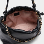Bolsa versátil com design moderno e detalhes elegantes: efeito de impressão em relevo, logo metálico, alça de corrente trançada confortável + alça removível. Fecho com cordão (“drawstring”) e bolso interno. Pode ser usada ao ombro, crossbody ou de mão.