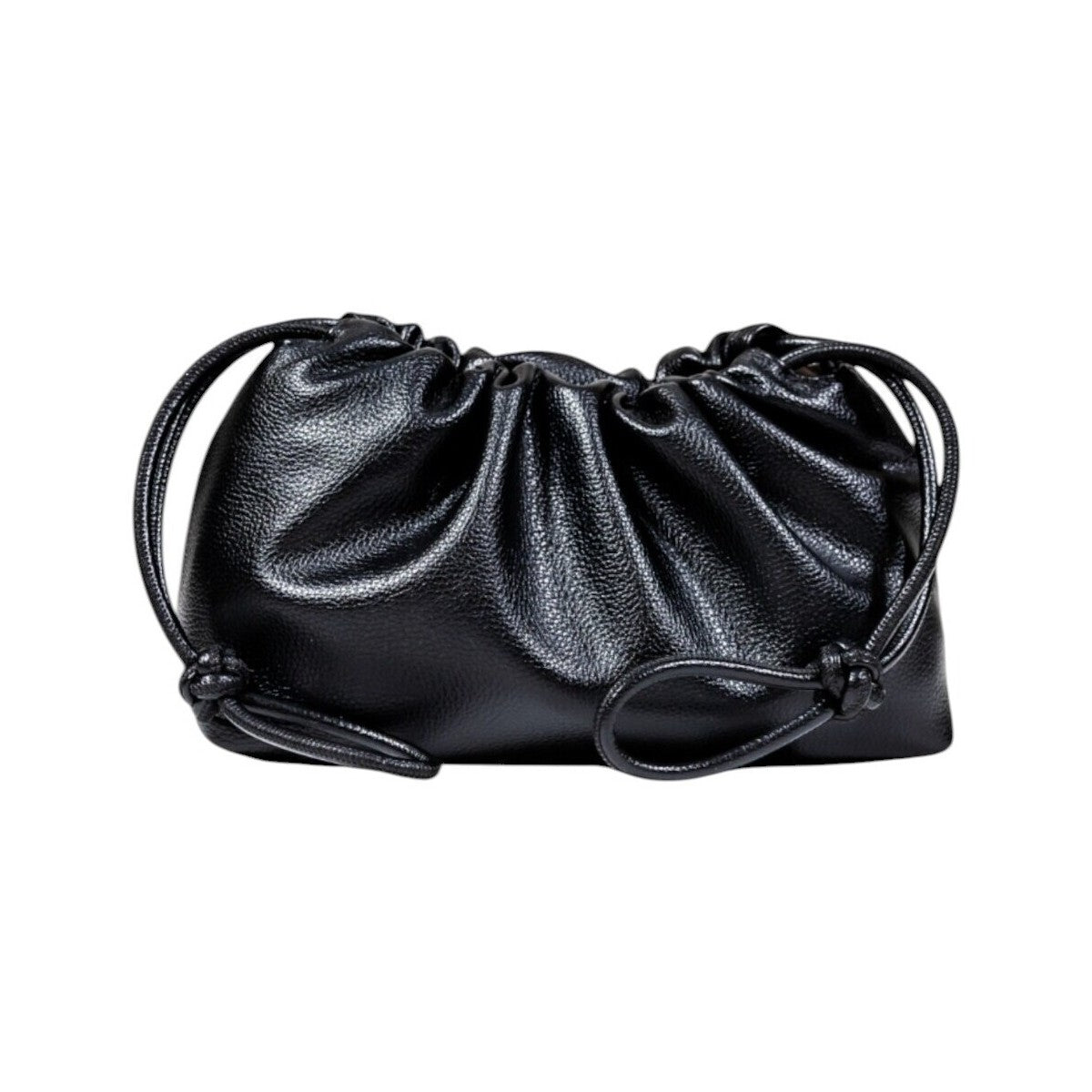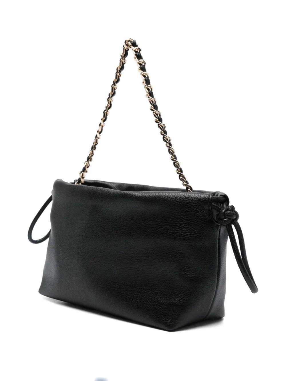 Bolsa compacta, elegante e versátil, ideal para o essencial do dia‑a‑dia ou uma saída à noite. Apresenta alça com corrente entrelaçada removível, bolso interior, logo metálico decorativo e fecho tipo cordão (“drawstring”).
