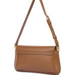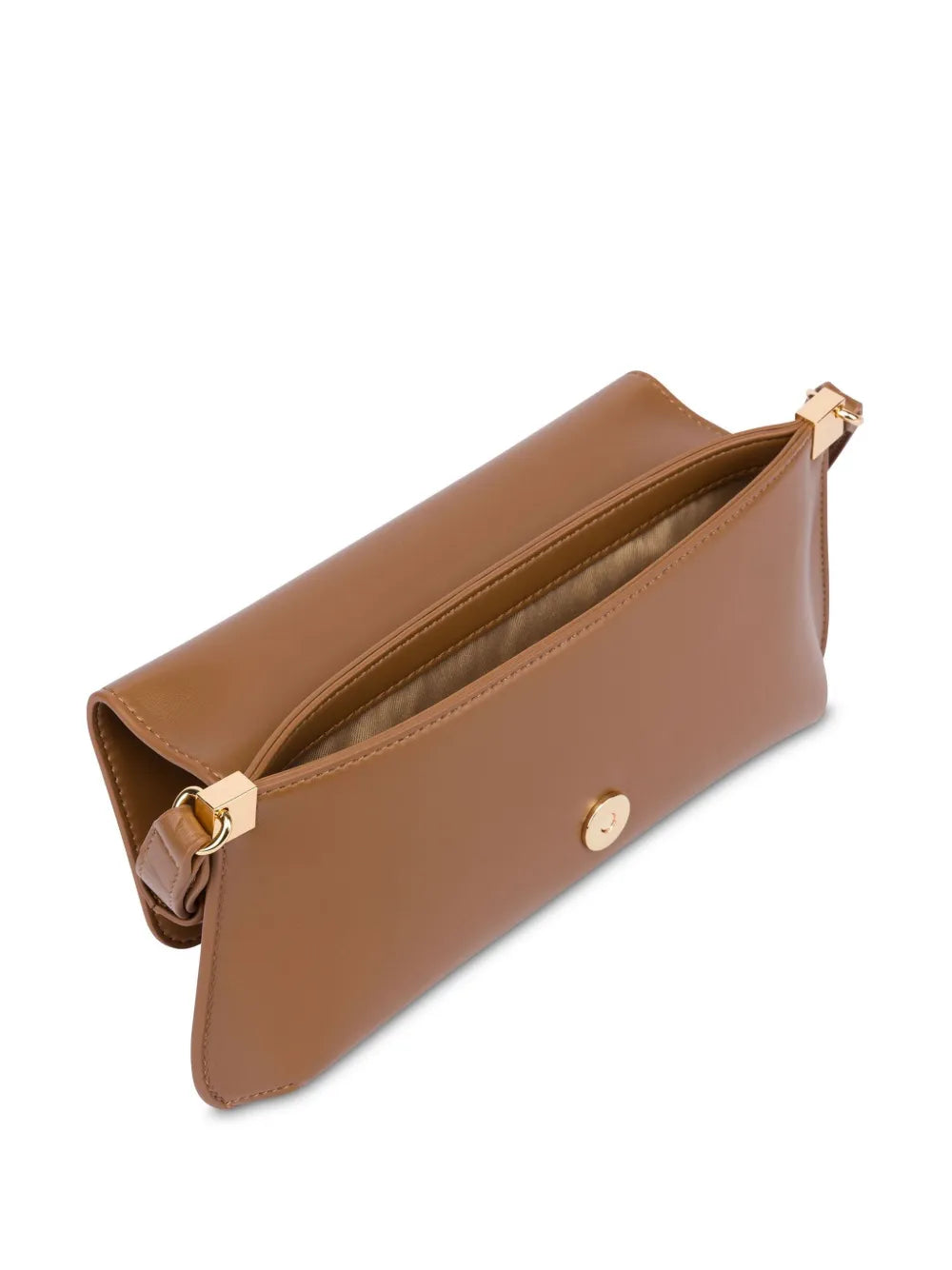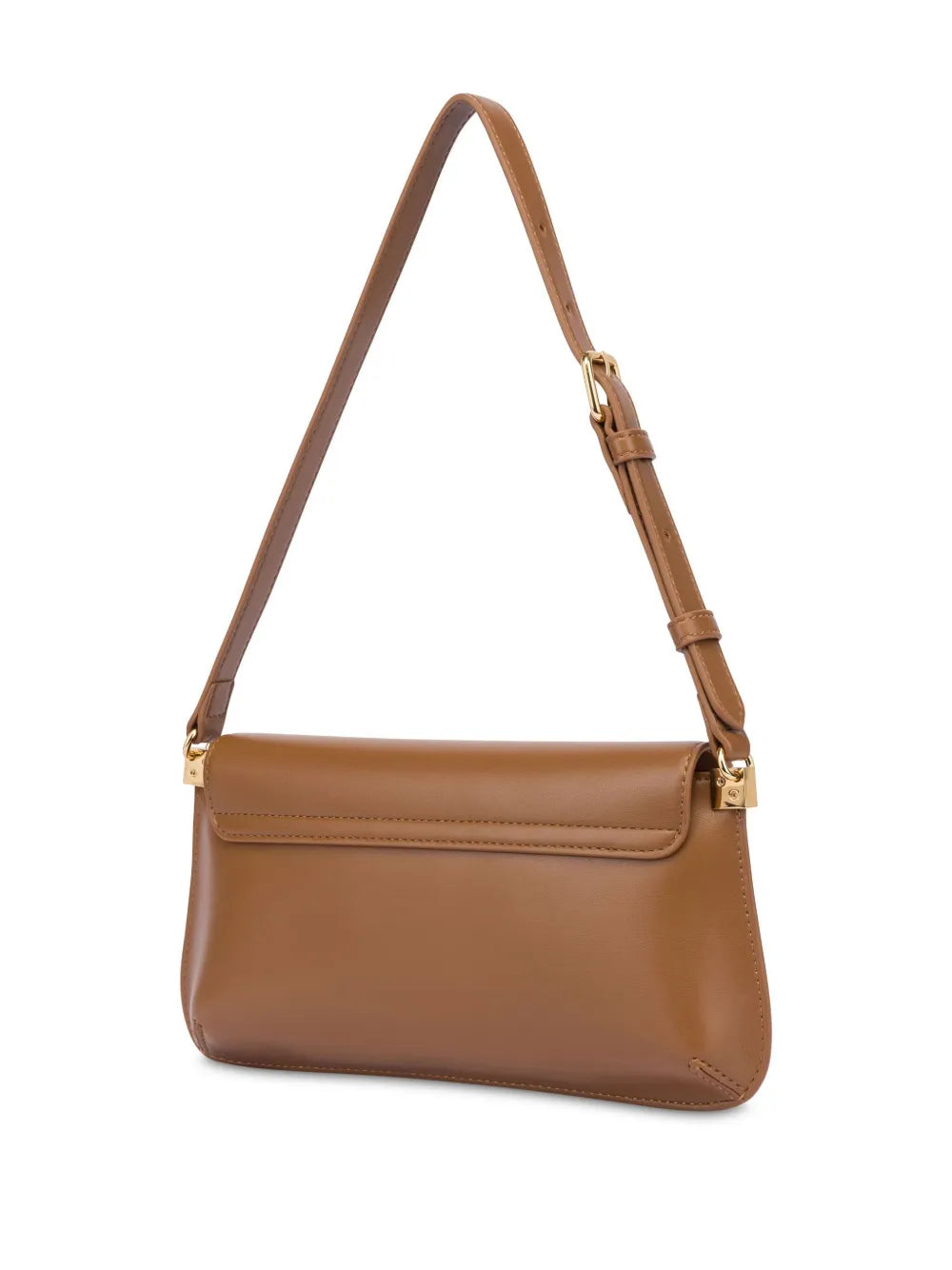 Mala de ombro Love Moschino camel com logo metálico à frente e fecho com aba magnética.