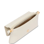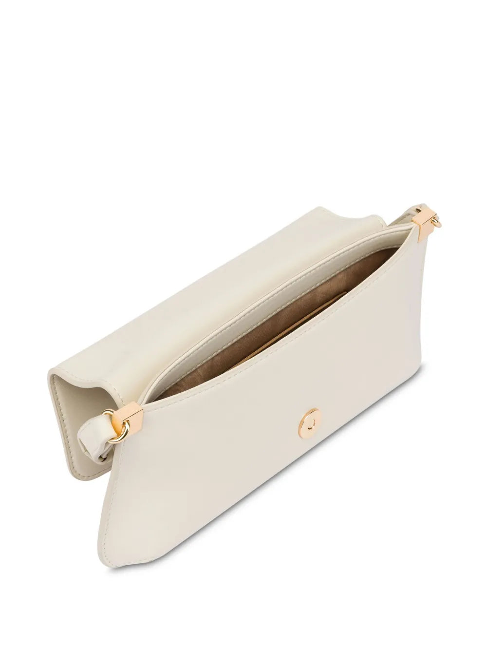Mala de ombro Love Moschino camel com logo metálico à frente e fecho com aba magnética.