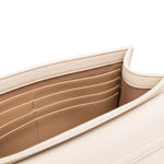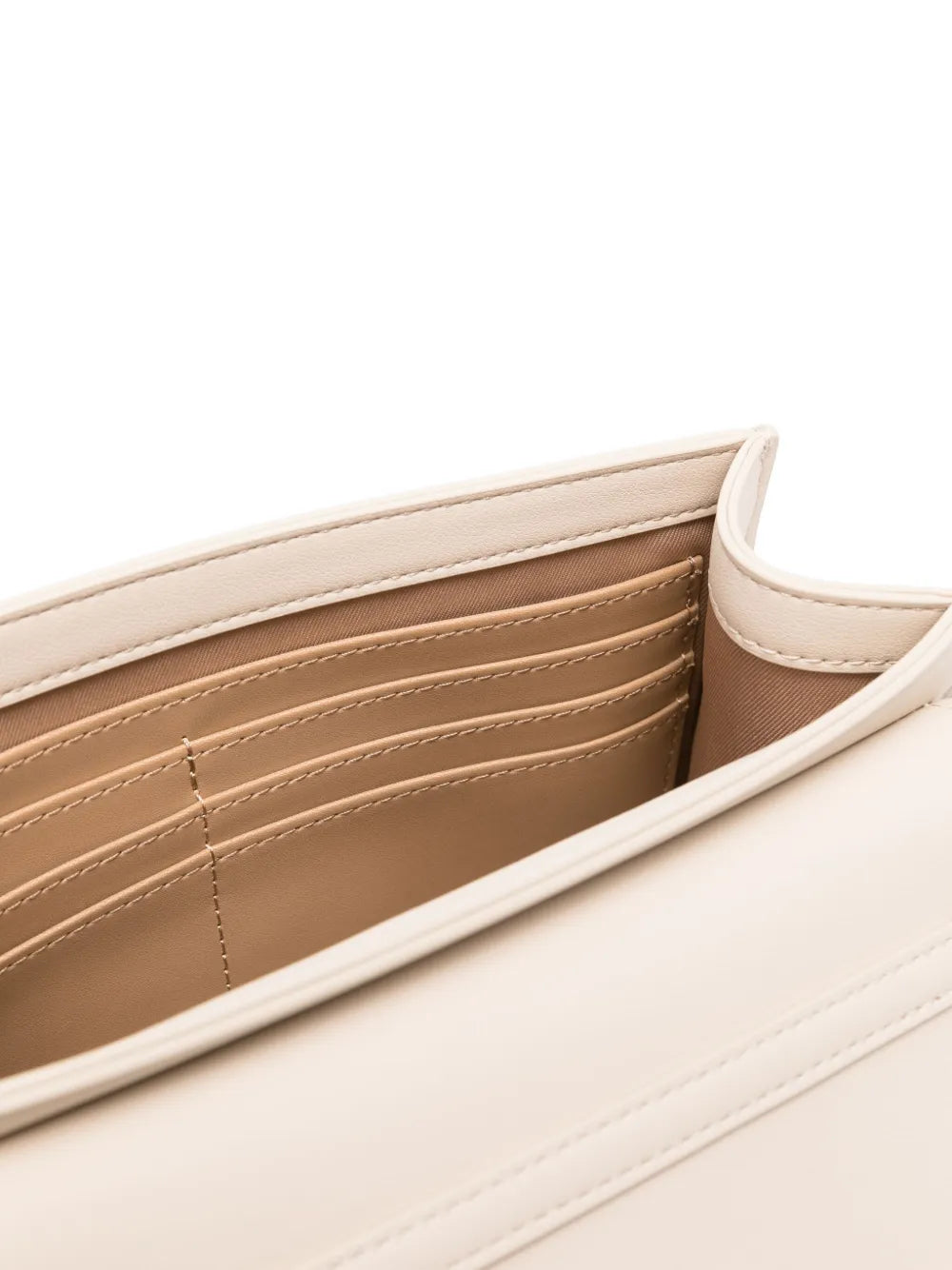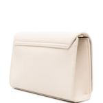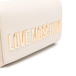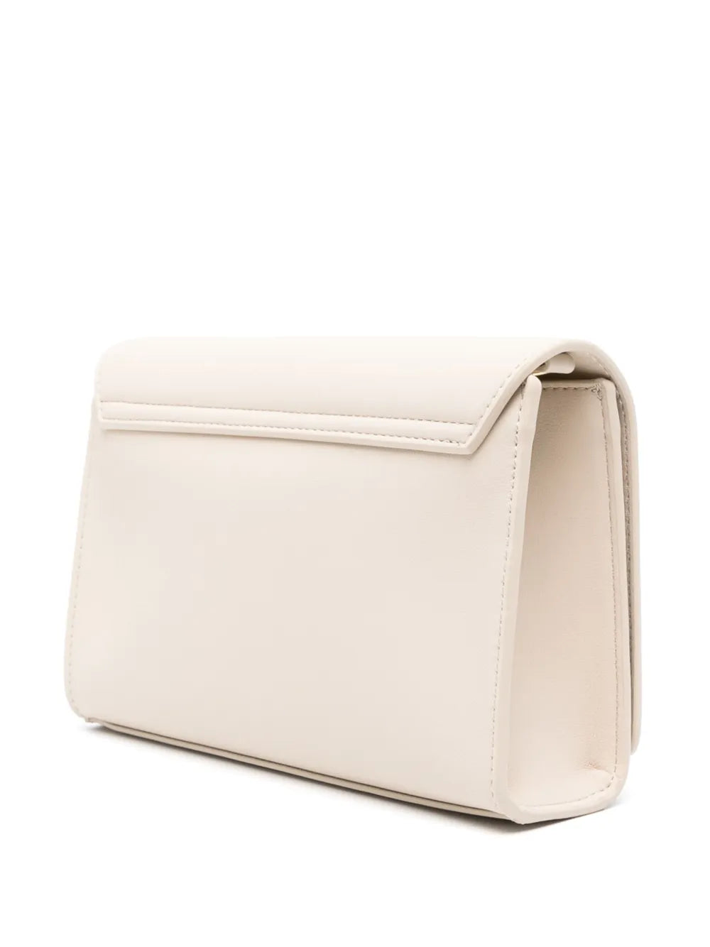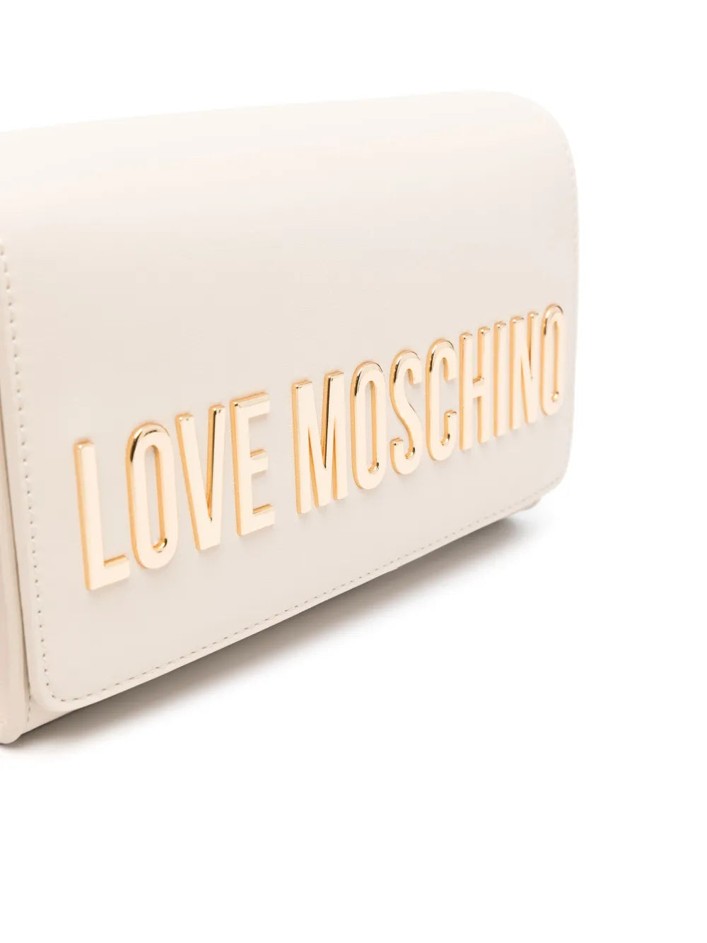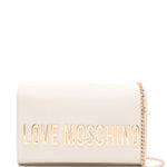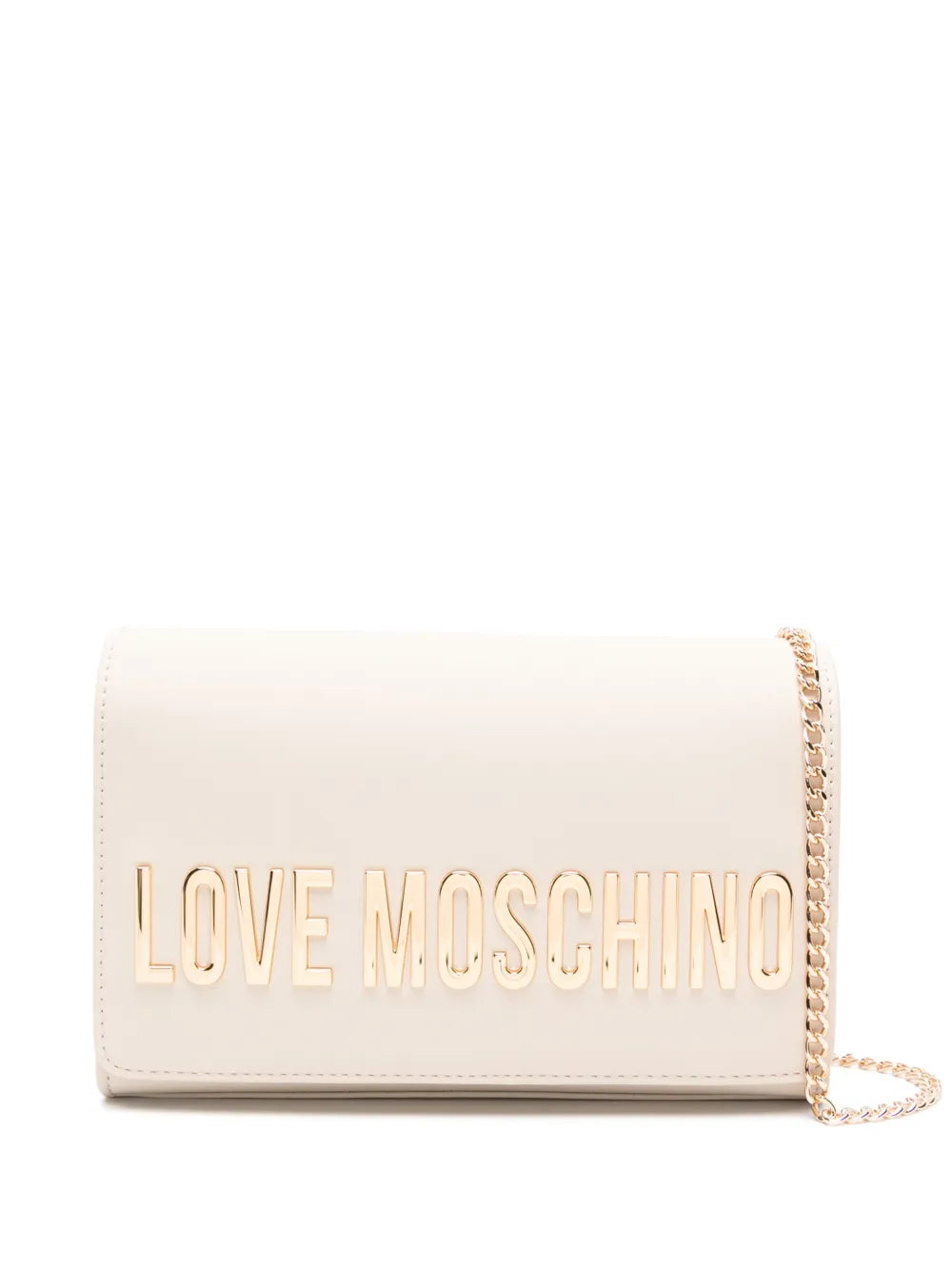 Mala de ombro Love Moschino ecru com alça de corrente fixa, logo metálico à frente e fecho com aba magnética.