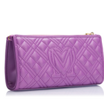 Mala de ombro Love Moschino em roxo com design acolchoado, letras douradas com o logotipo e fecho de correr na parte superior.