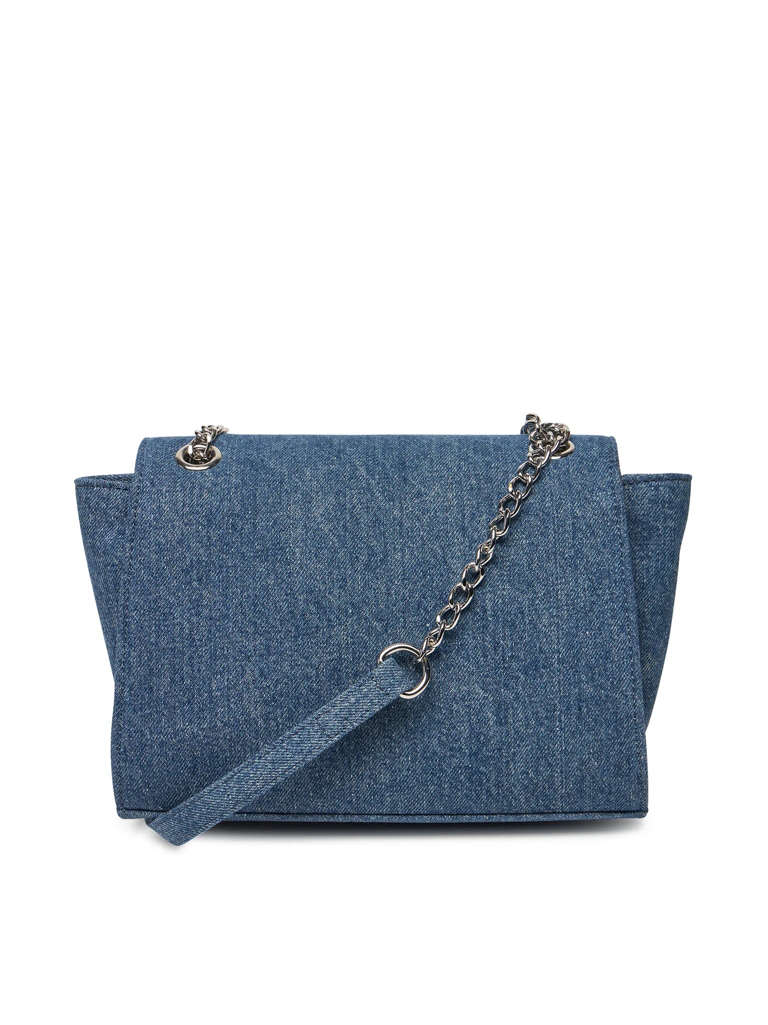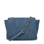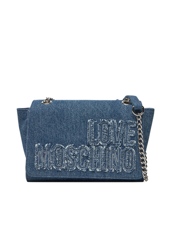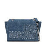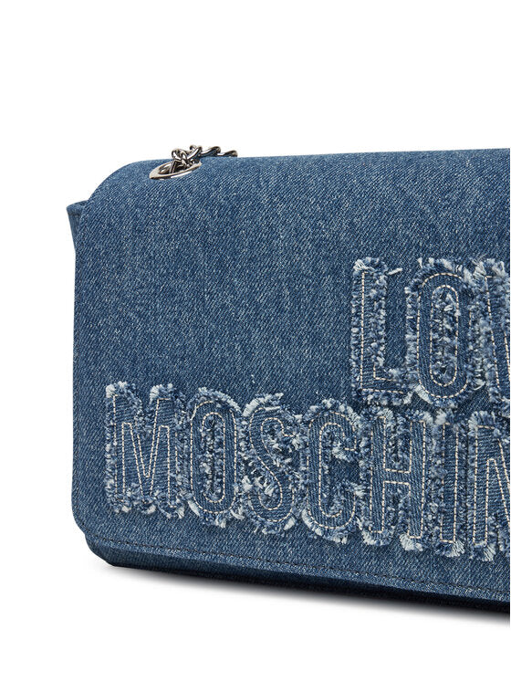Mala de ombro Love Moschino em tecido jeans com logo bordado à frente e fecho com aba magnética.