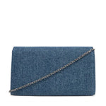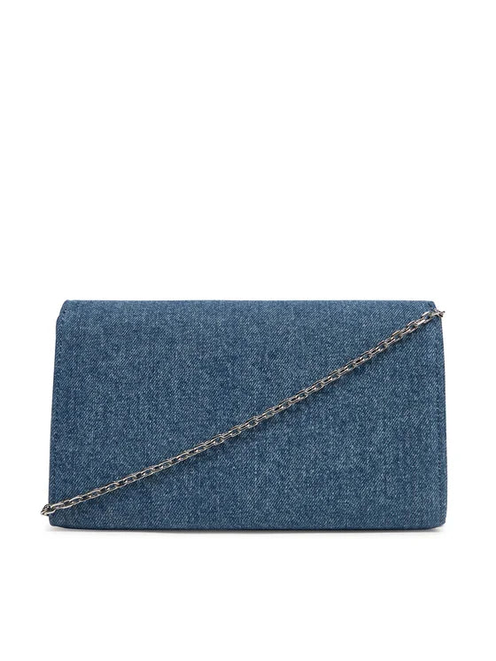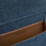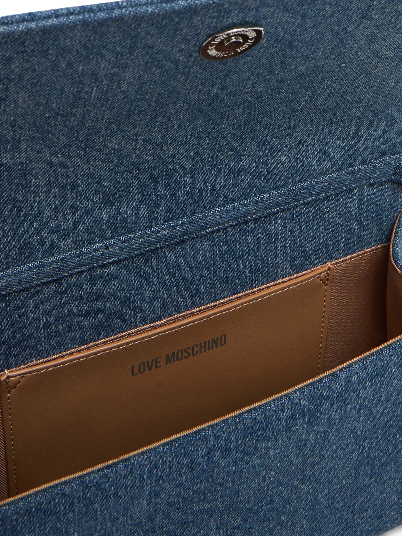 Mala de ombro Love Moschino em tecido jeans com logo bordado à frente e fecho com aba magnética.