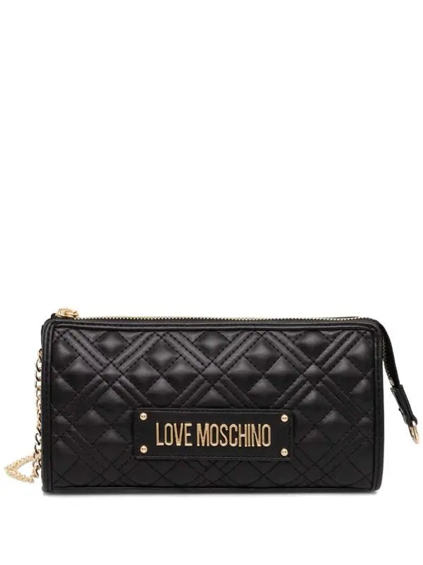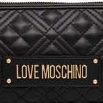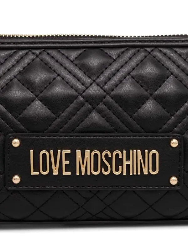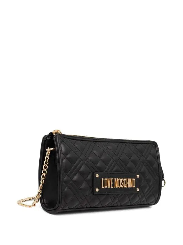 Mala de ombro Love Moschino em preto com design acolchoado, logotipo dourado e fecho de correr na parte superior.