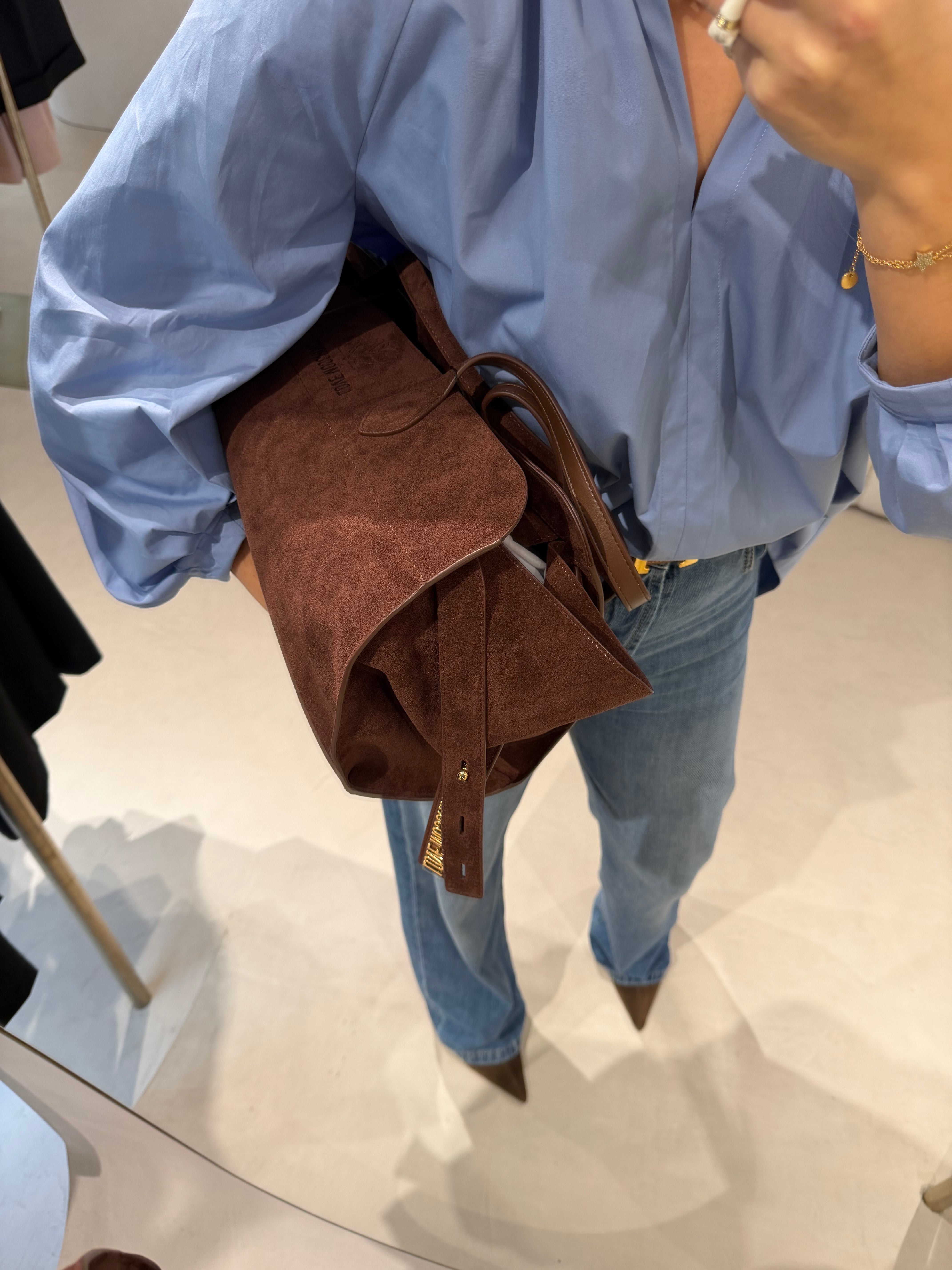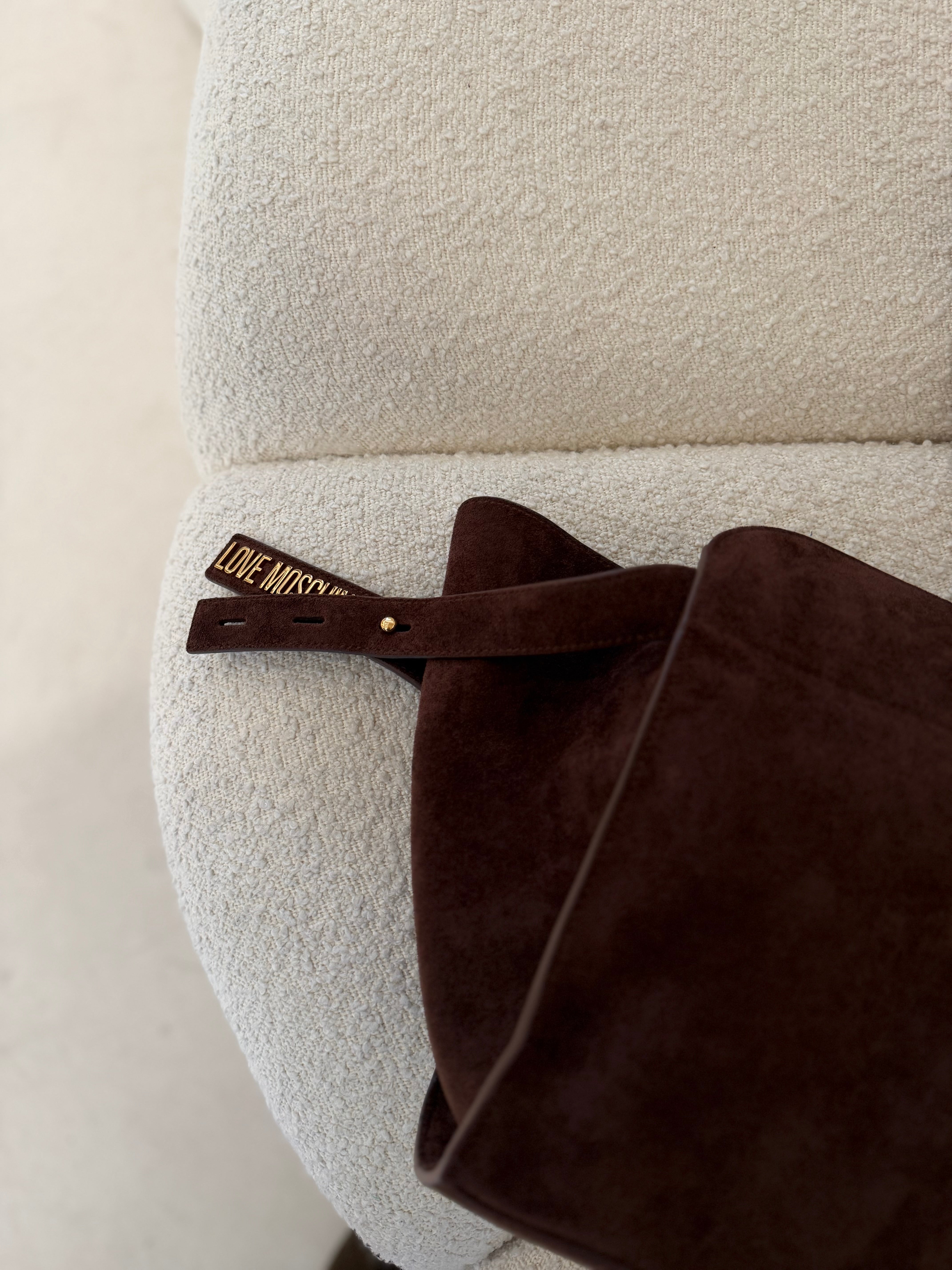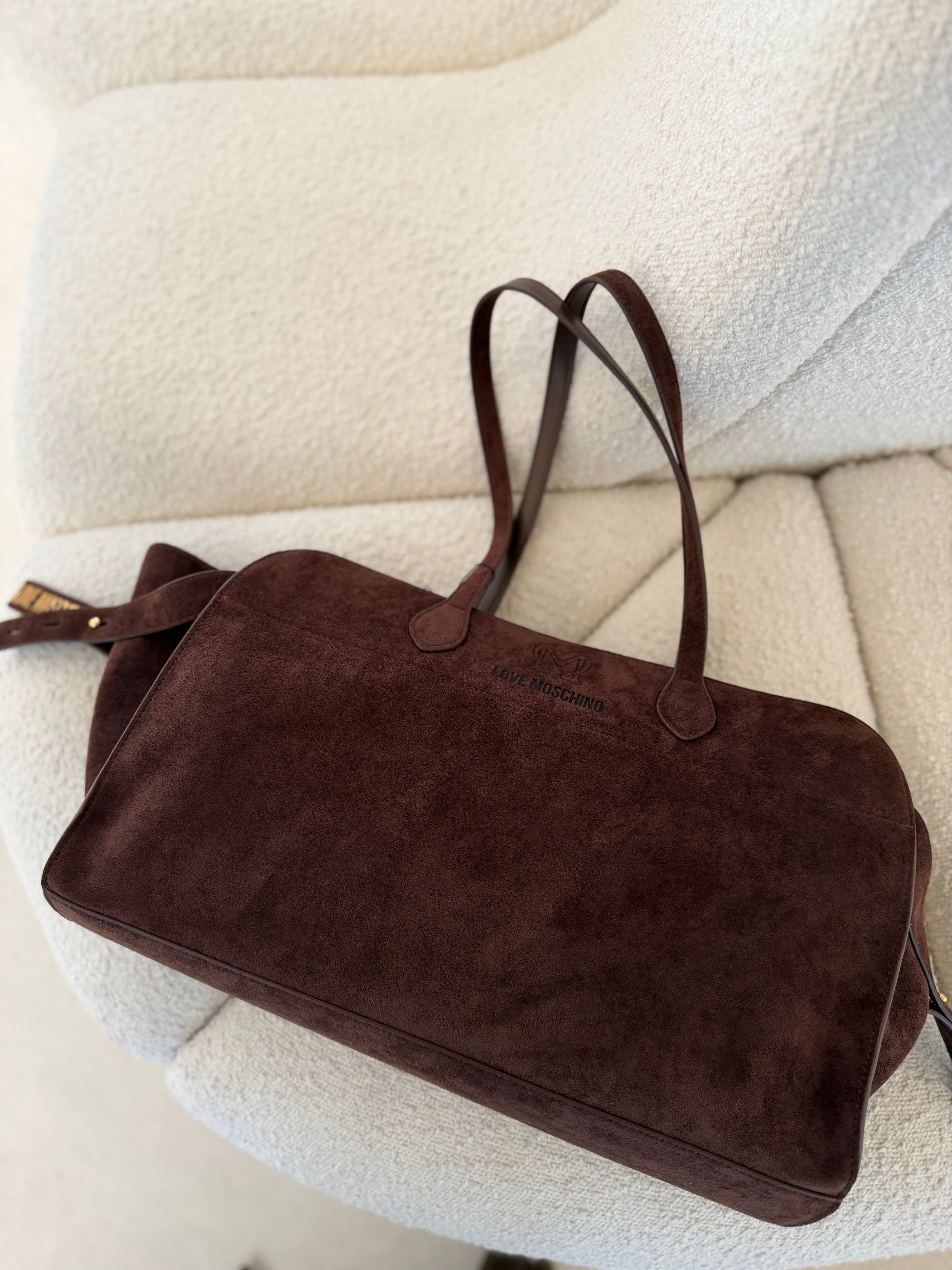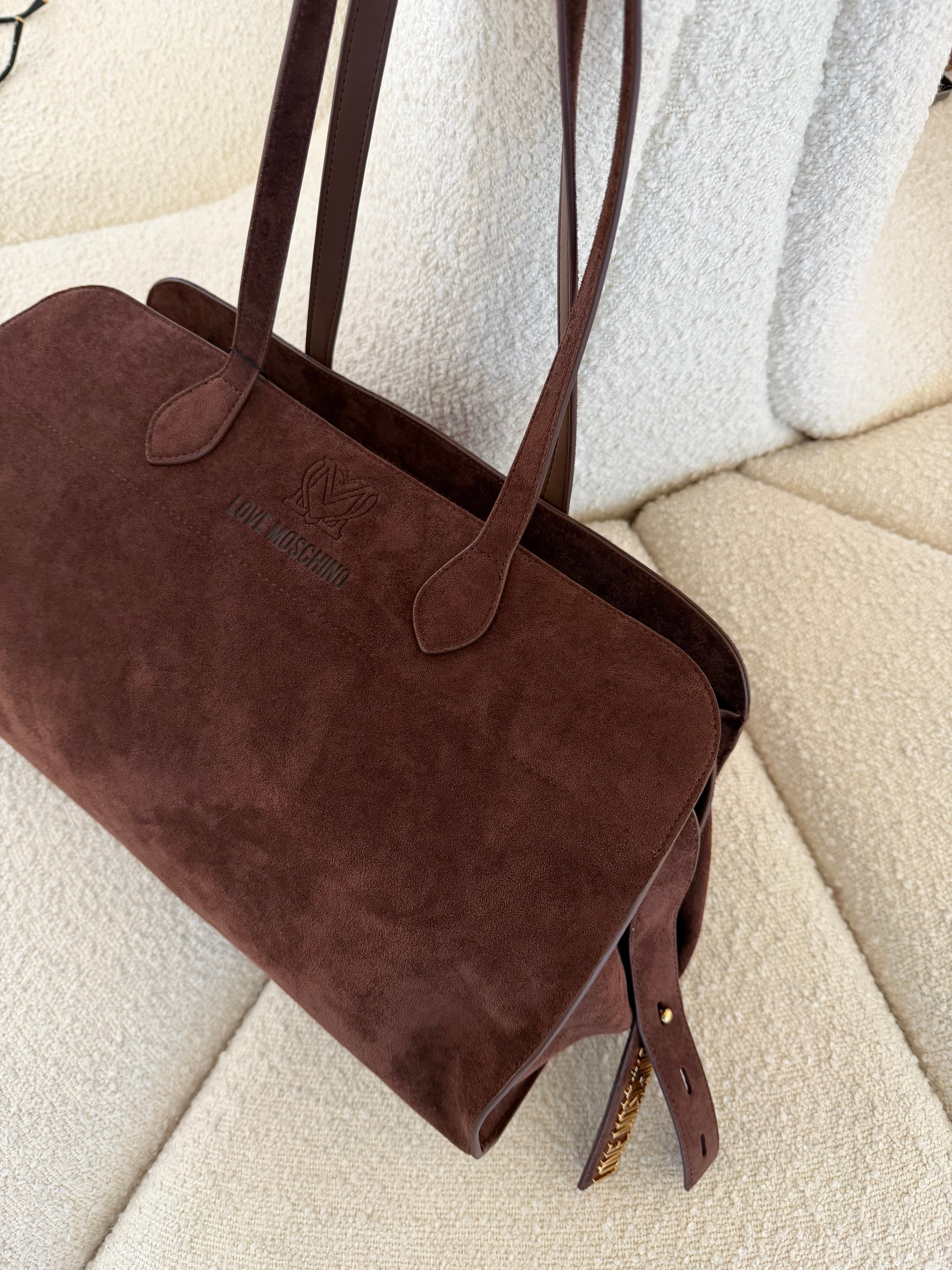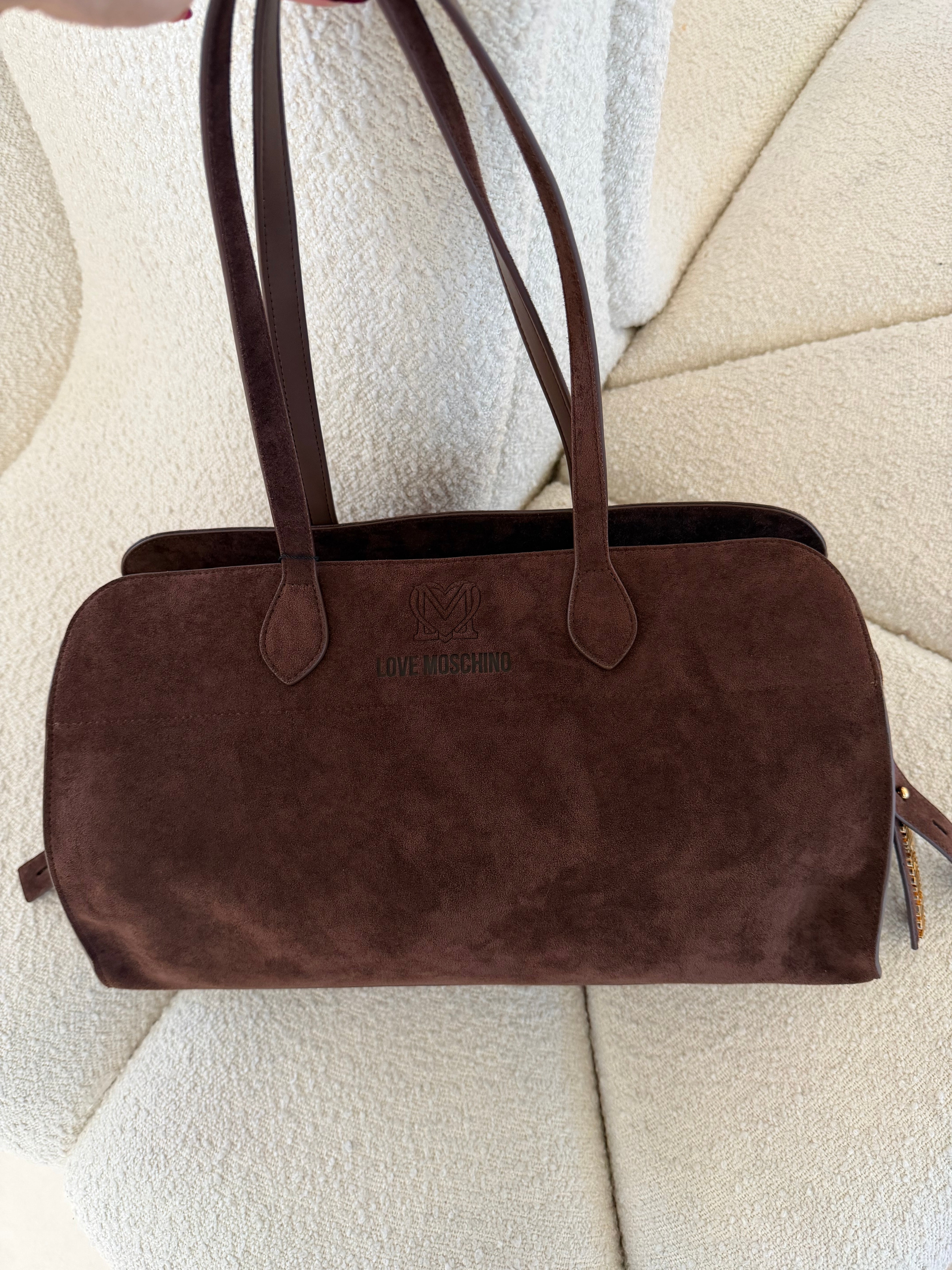 Sofisticação intemporal e funcionalidade moderna. A tote bag Love Moschino em camurça castanha destaca-se pela sua textura suave e acabamento elegante, criando um visual quente, luxuoso e naturalmente chic.