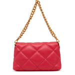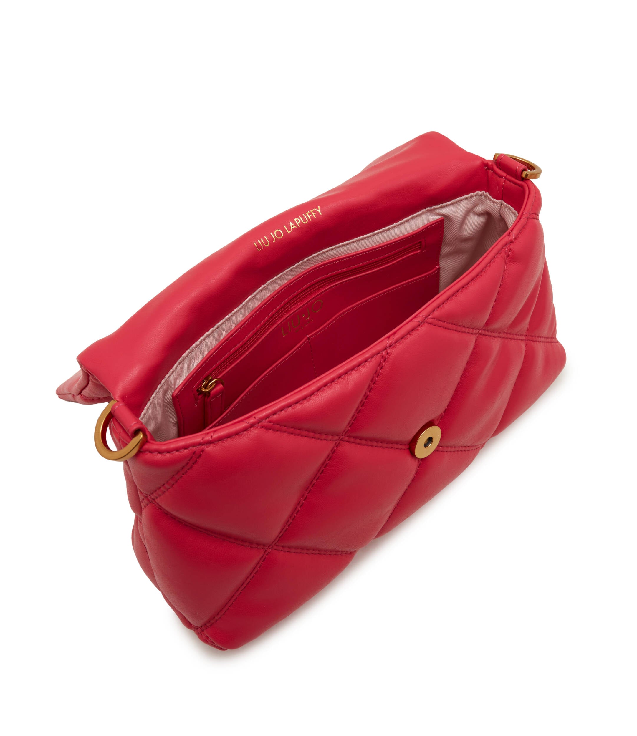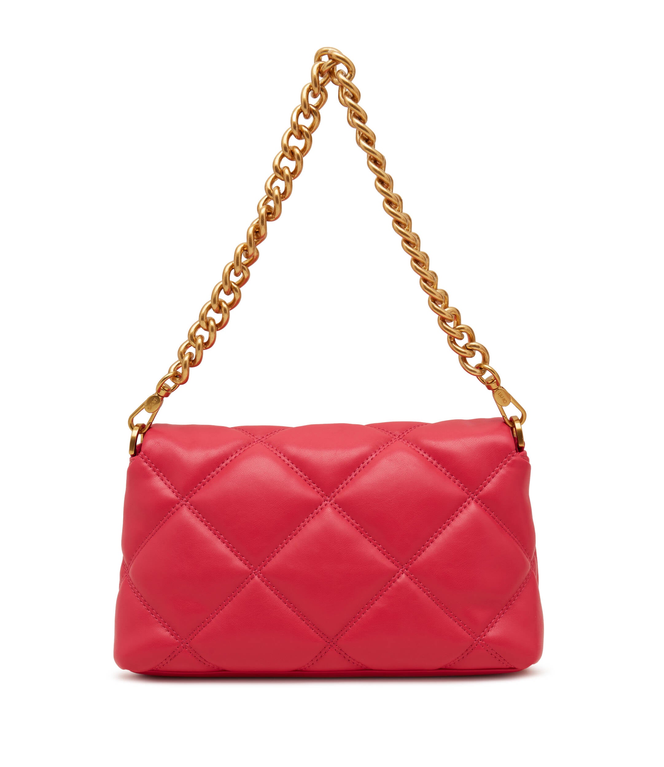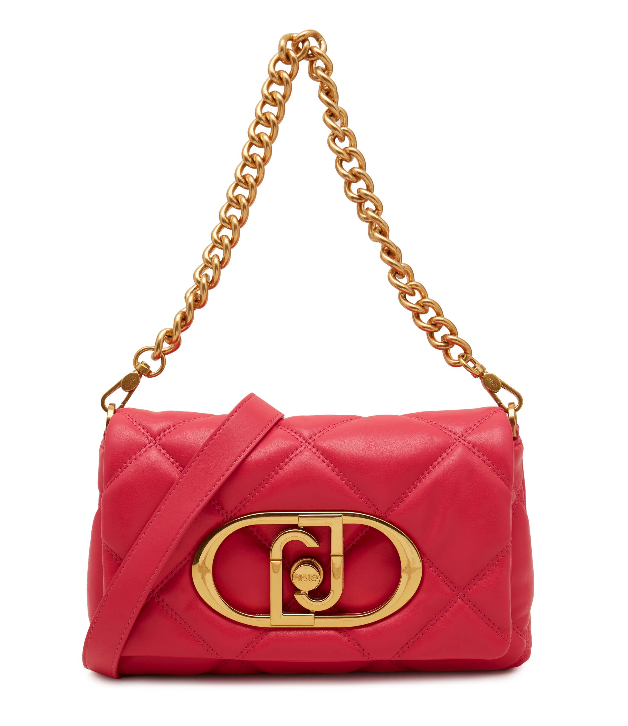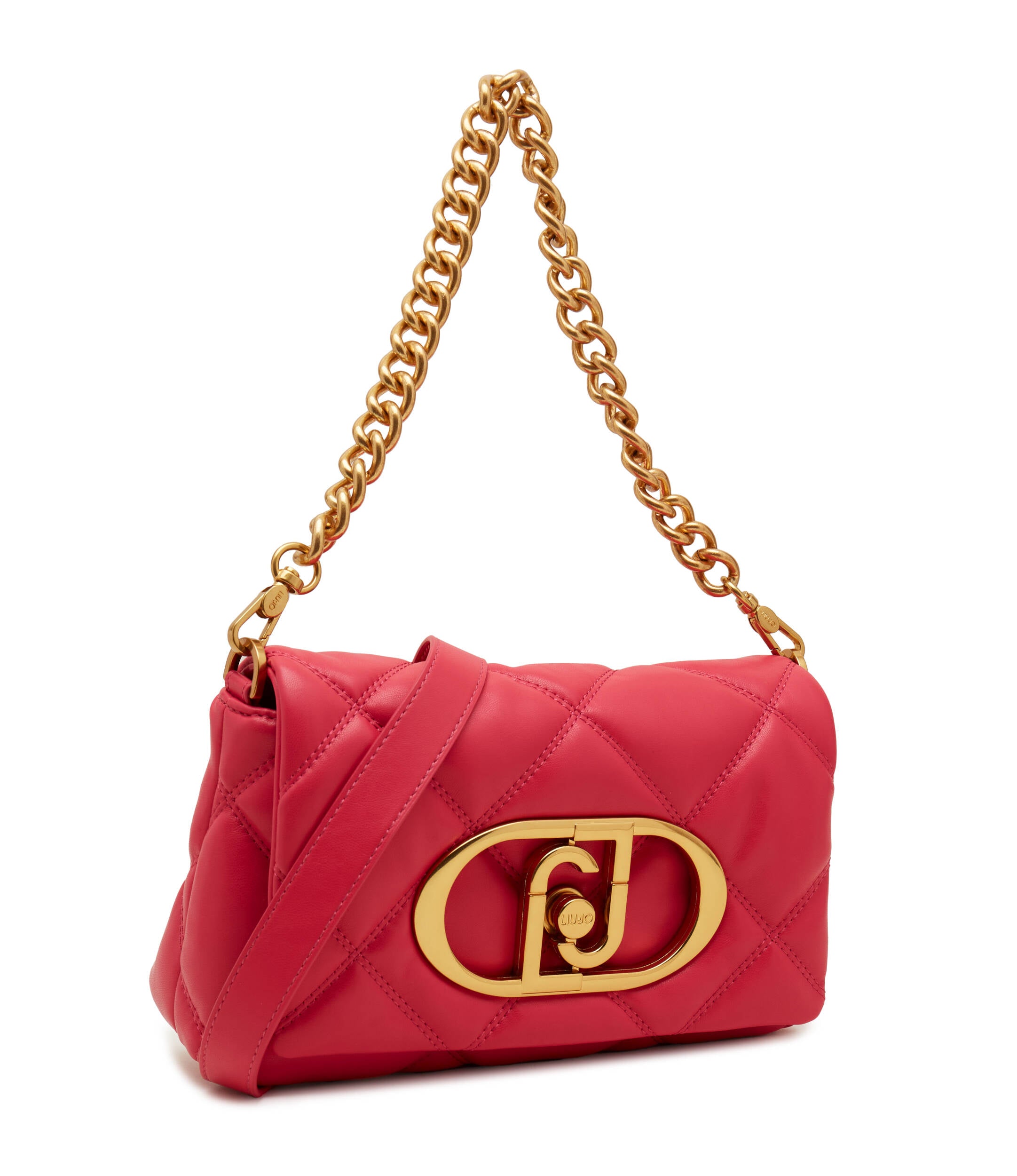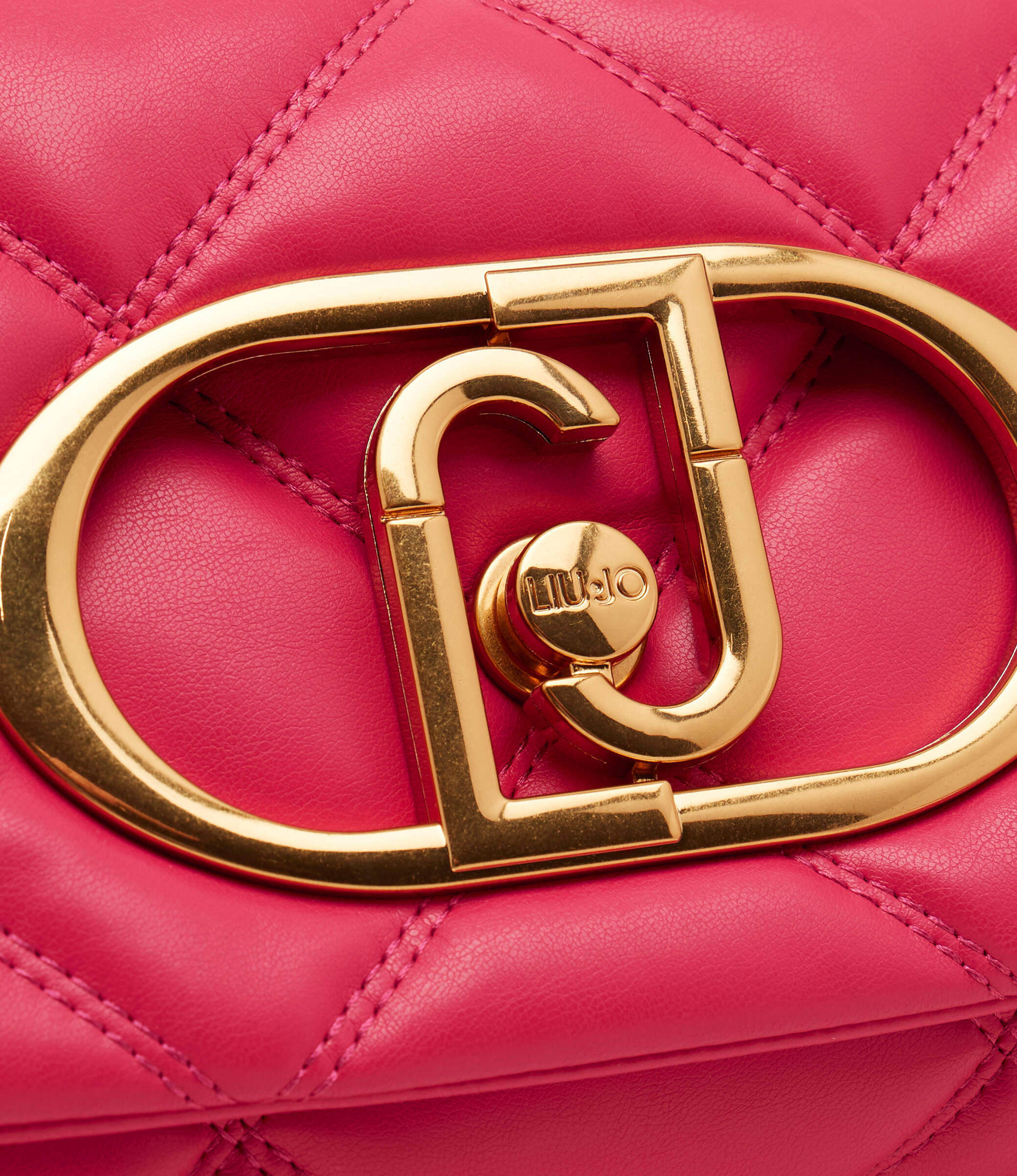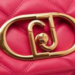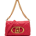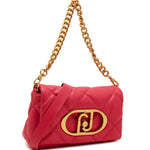 Carteira Liu Jo Lapuffy em rosa com corrente de ombro amovível e alça a tiracolo ajustável e amovível, logotipo metálico na frente e fecho magnético.