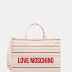 Mala tote Love Moschino em tecido com riscas, fecho de correr, alça de tiracolo e logo bordado à frente.