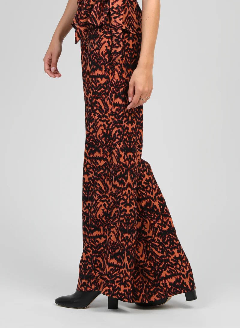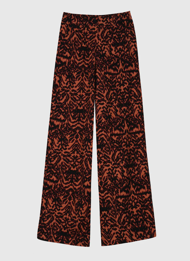 Pantalona feminina com corte direito, tecido estampado “graphie bordeaux”, cintura normal com elástico atrás e acabamento tipo jeans com duplo pesponto. Confeccionado em 100% viscose para um toque fluido e confortável.