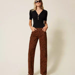 Esta t-shirt canelada da Twinset é uma peça sofisticada com um toque moderno: o decote em V profundo e os botões tipo joia elevam-na do quotidiano a um look elegante. A modelagem justa e o logótipo Oval‑T nas costas conferem um detalhe minimalista e refinado. Confeccionada numa mistura macia de viscose, poliamida e elastano, oferece um caimento confortável e estruturado. Ideal para coordenar com calças de alfaiataria ou saias fluidas — um verdadeiro must-have com assinatura italiana.