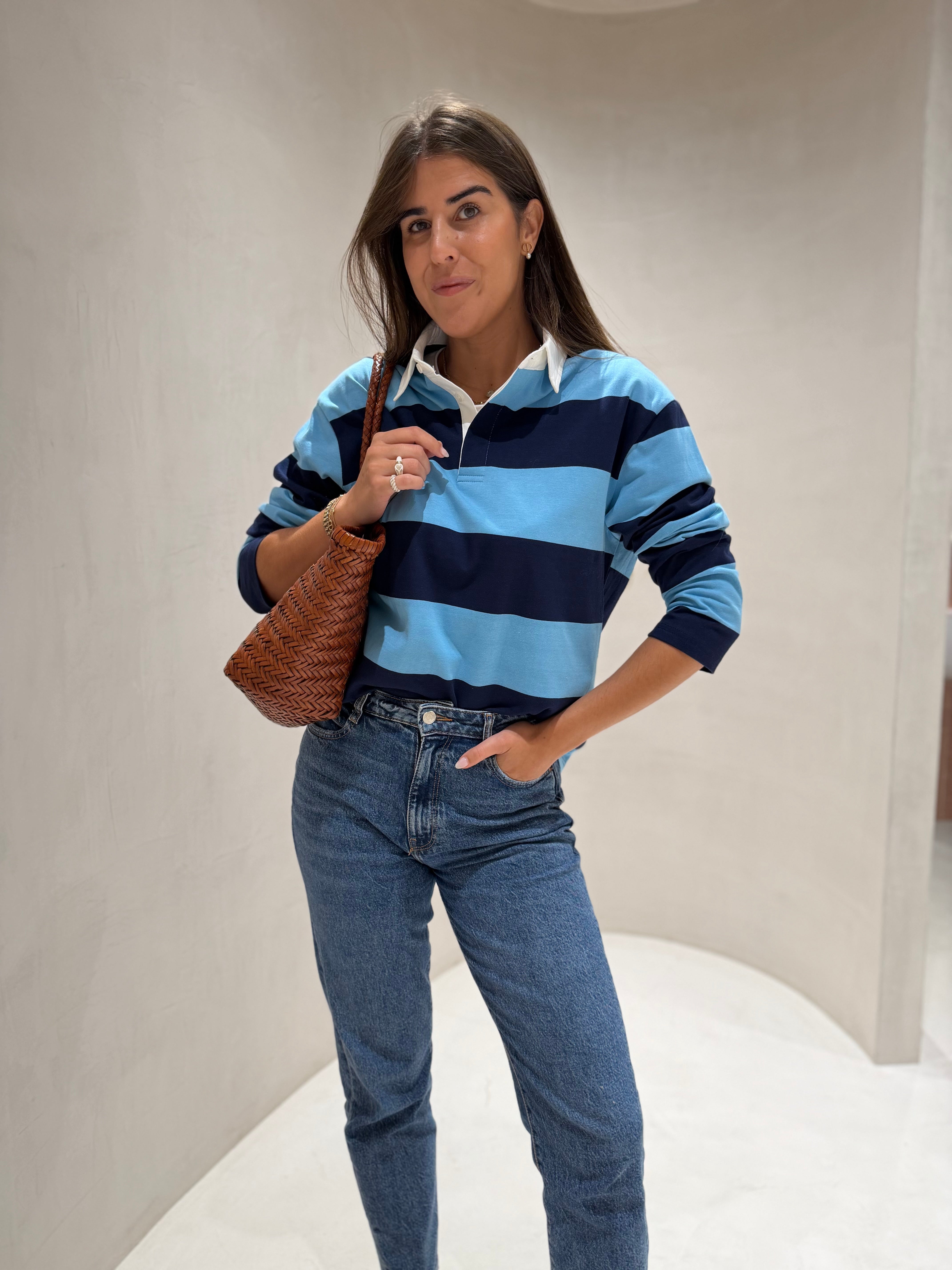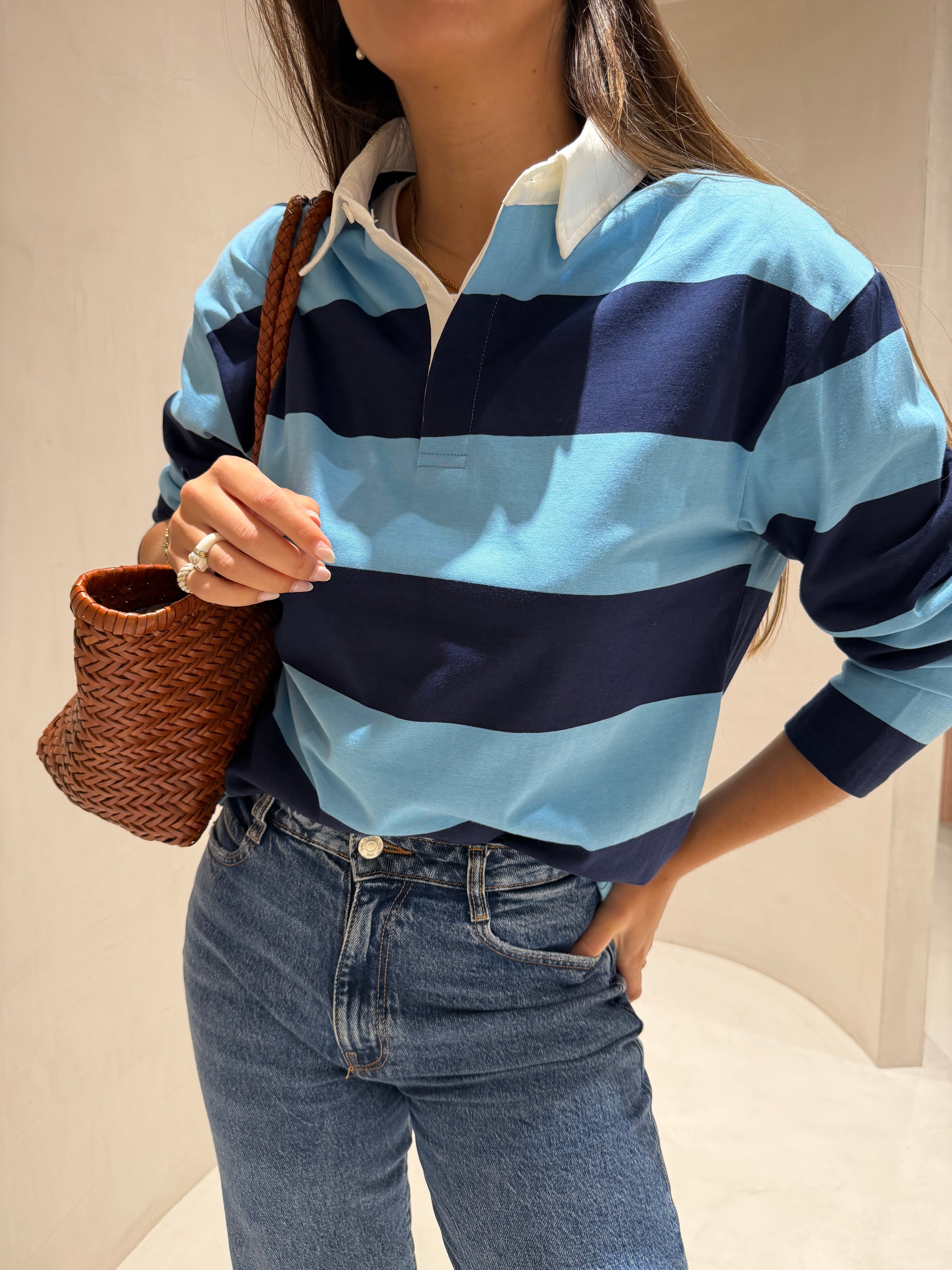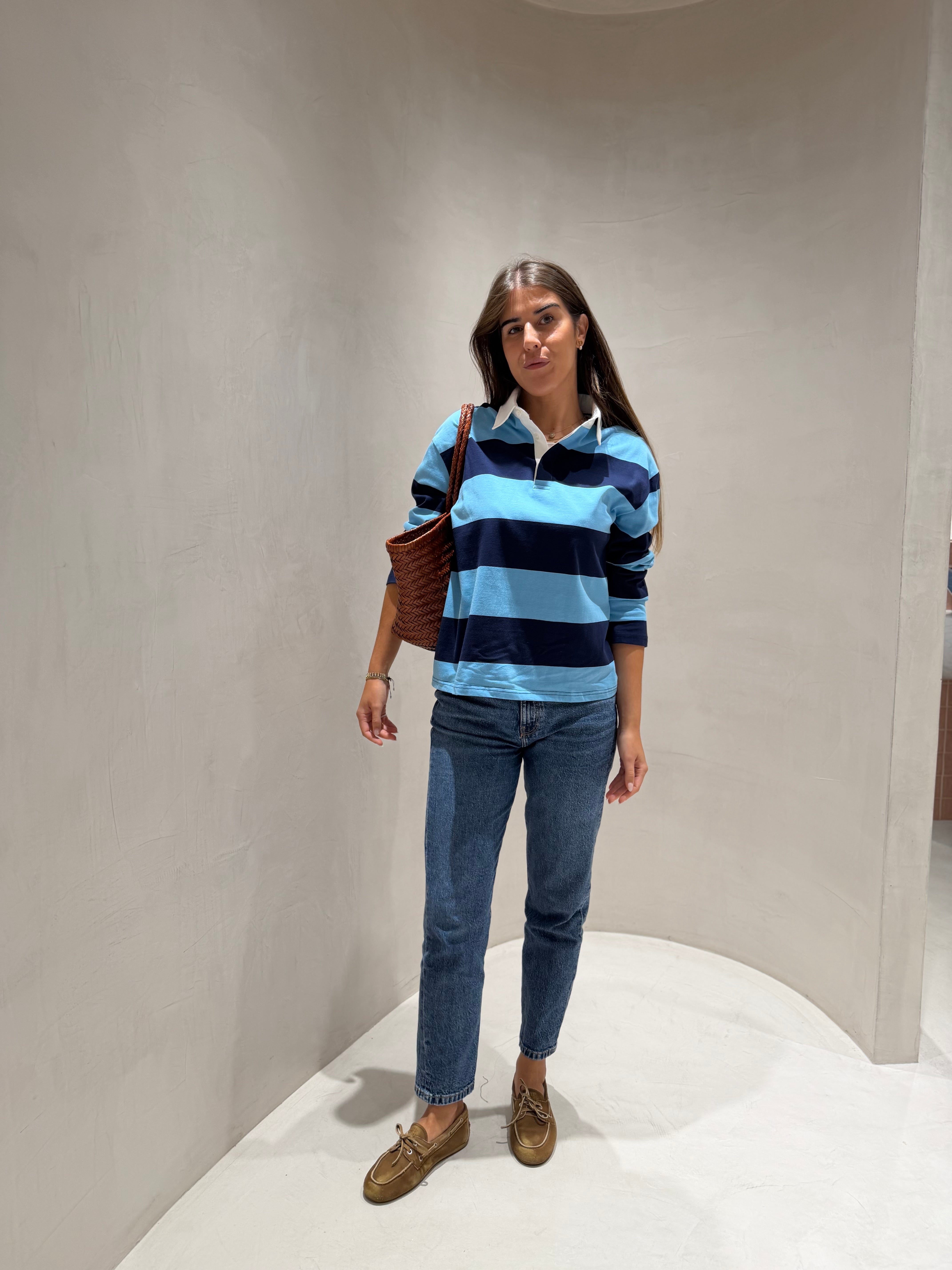 Polo confeccionado em malha fina e suave ao toque, que garante conforto e leveza ao vestir. Apresenta um padrão de riscas que adiciona um toque moderno e versátil à peça. O corte ligeiramente oversized confere um caimento descontraído e atual, mantendo a elegância característica do modelo polo. Possui gola clássica com abotoamento frontal curto, ideal para composições casuais ou smart-casual.