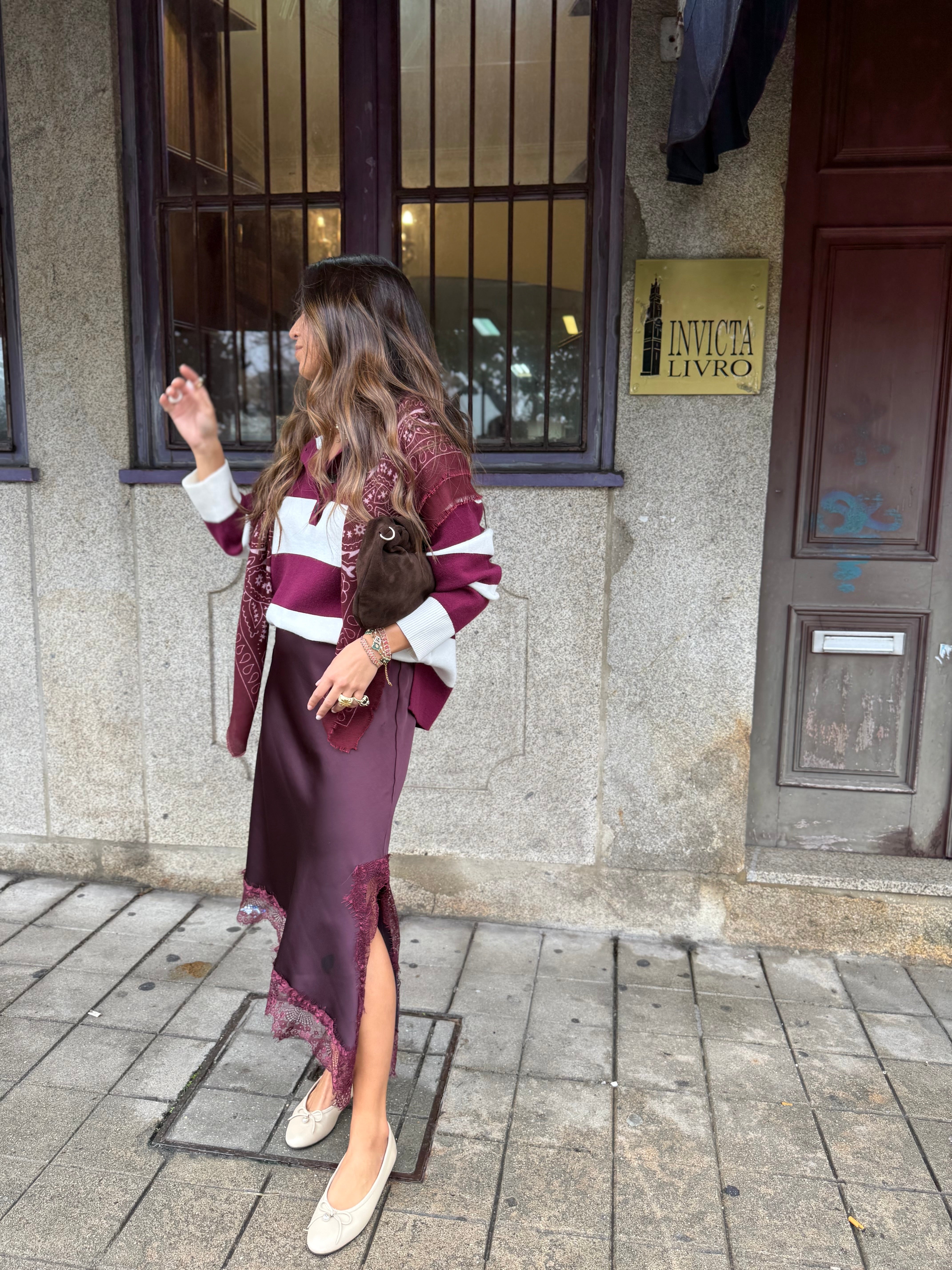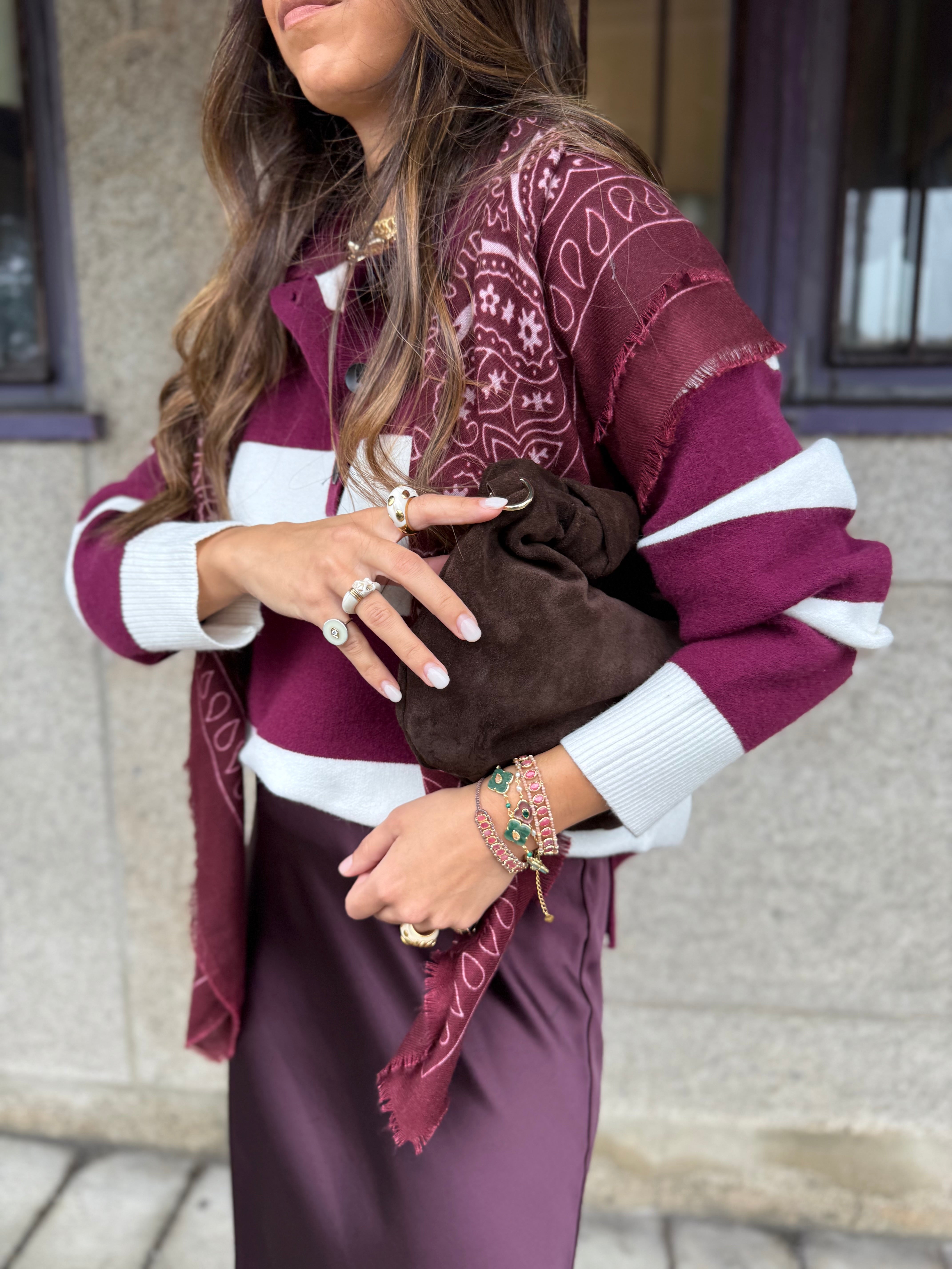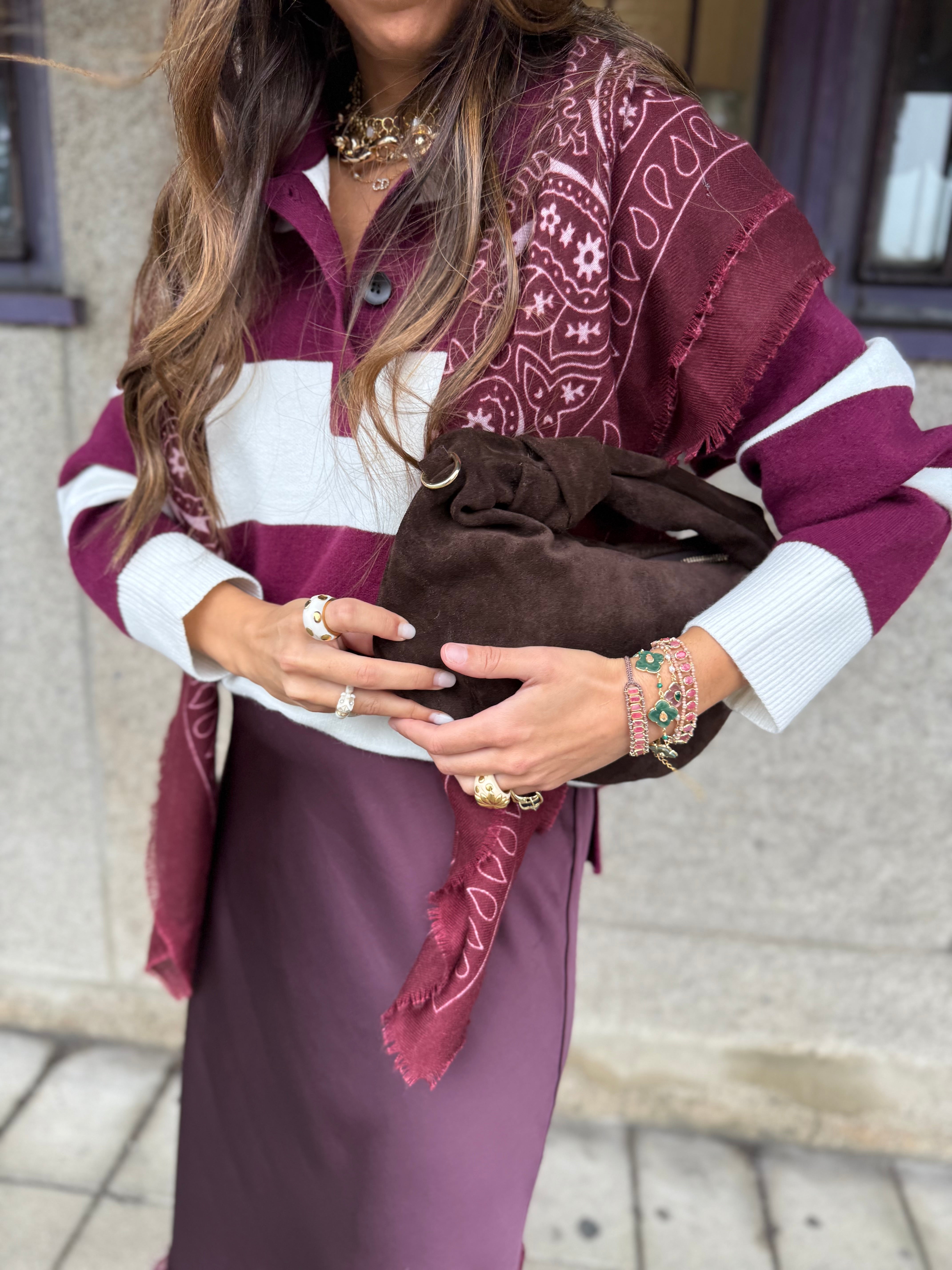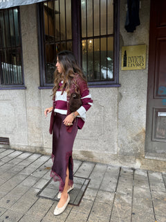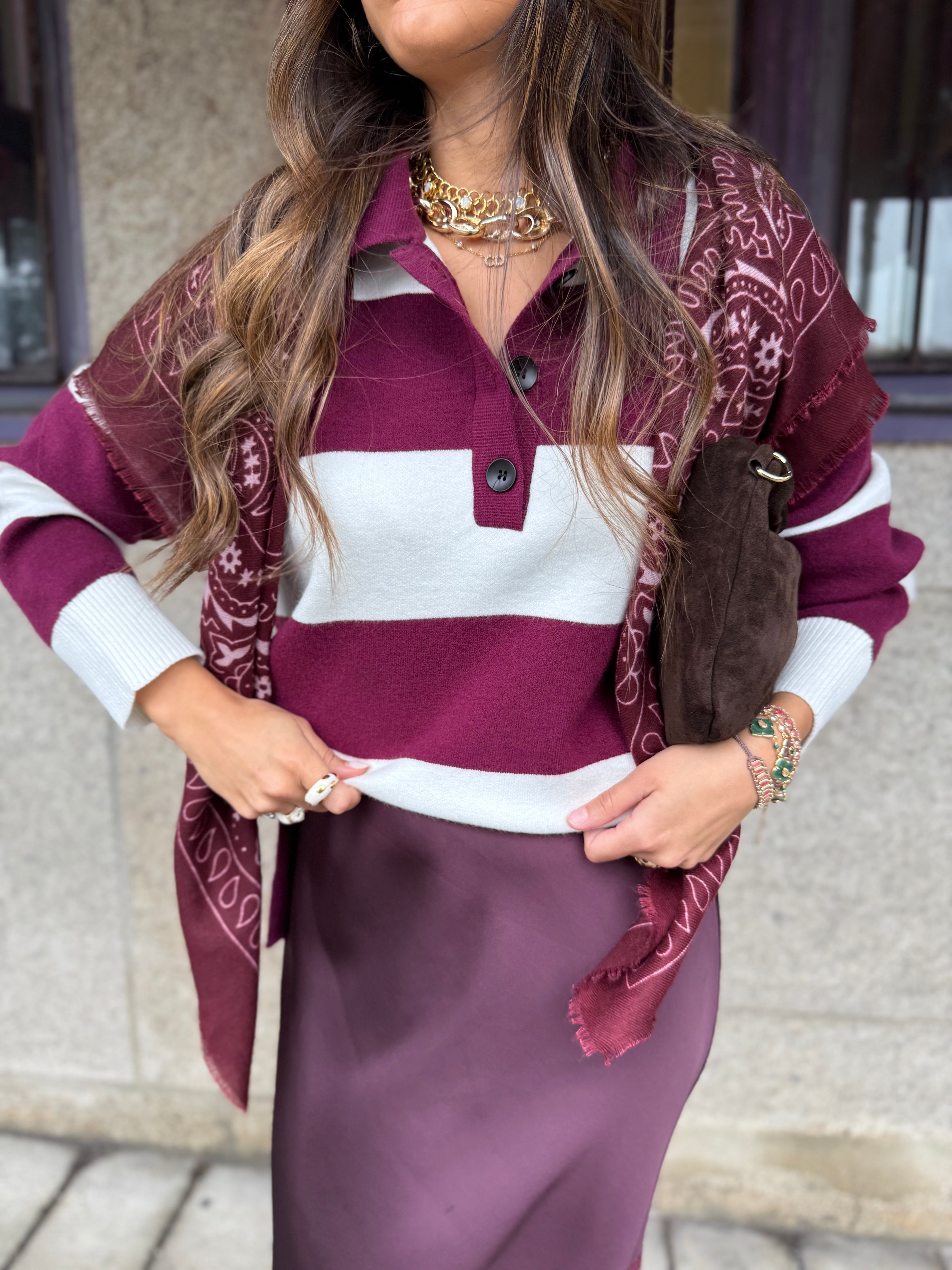 A Malha Luka combina conforto casual com um toque sofisticado. Feita em malha leve e macia, apresenta riscas largas em tons de bordeaux e écru, conferindo um visual moderno e versátil. A gola polo com botões e o corte reto garantem um caimento descontraído e elegante, perfeita para o dia a dia ou para elevar looks básicos.