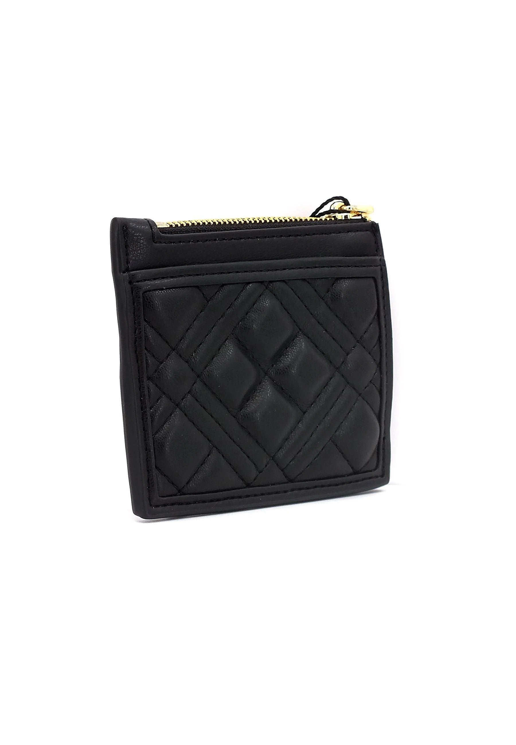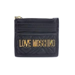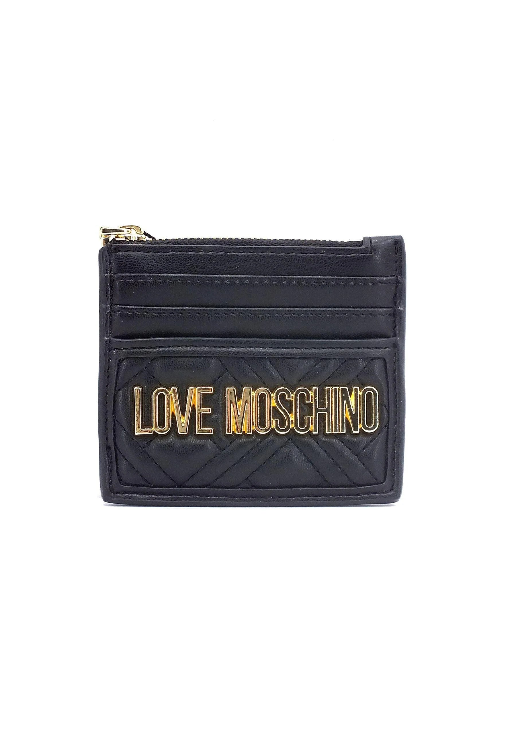 Porta-moedas Love Moschino em preto com design acolchoado, logotipo dourado, fecho de correr na parte superior com espaço para moedas e quatro compartimentos para cartões.