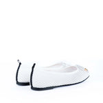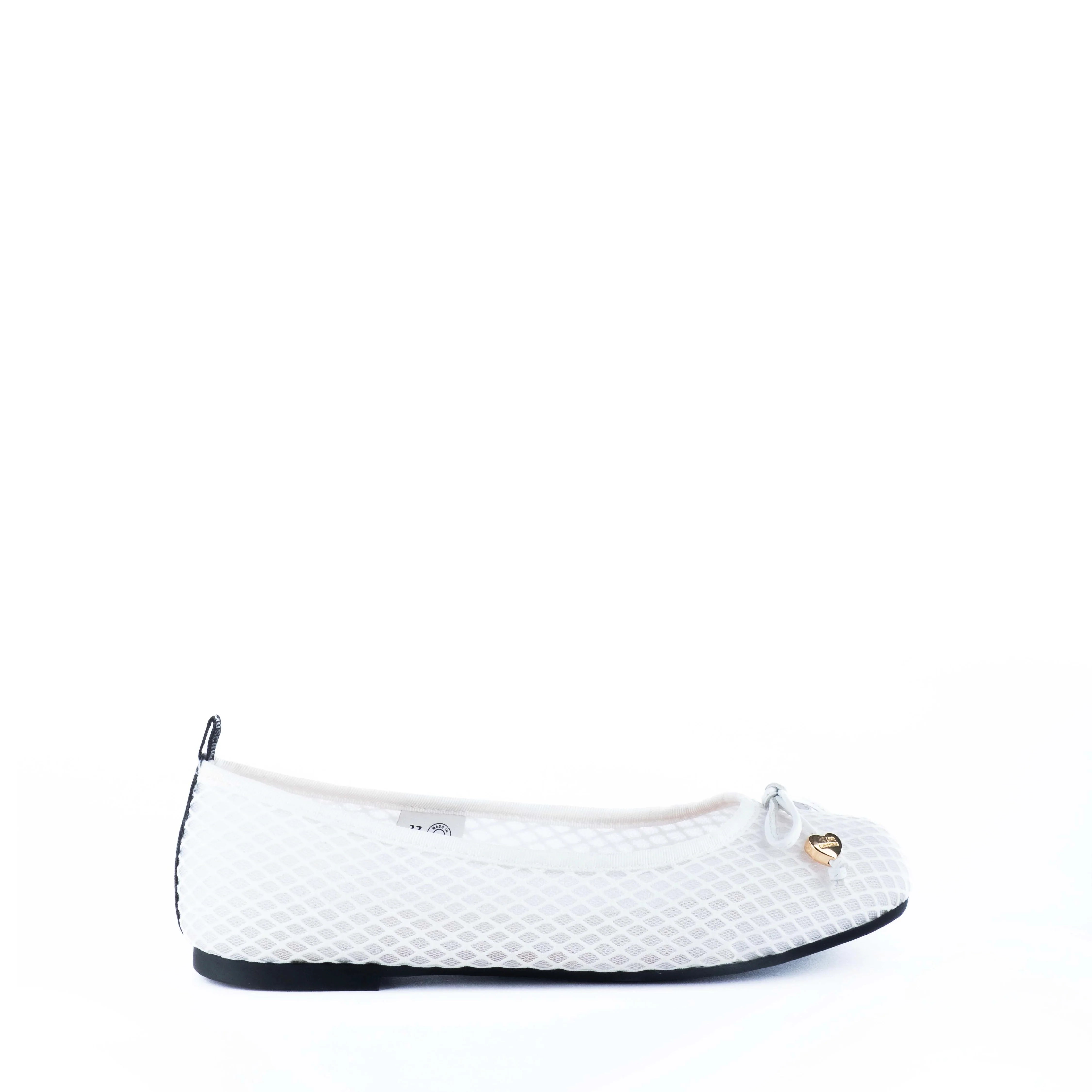 Sabrina Love Moschino em branco e ligeiramente transparente, laço decorativo com medalha dourada Love Moschino na ponta.
