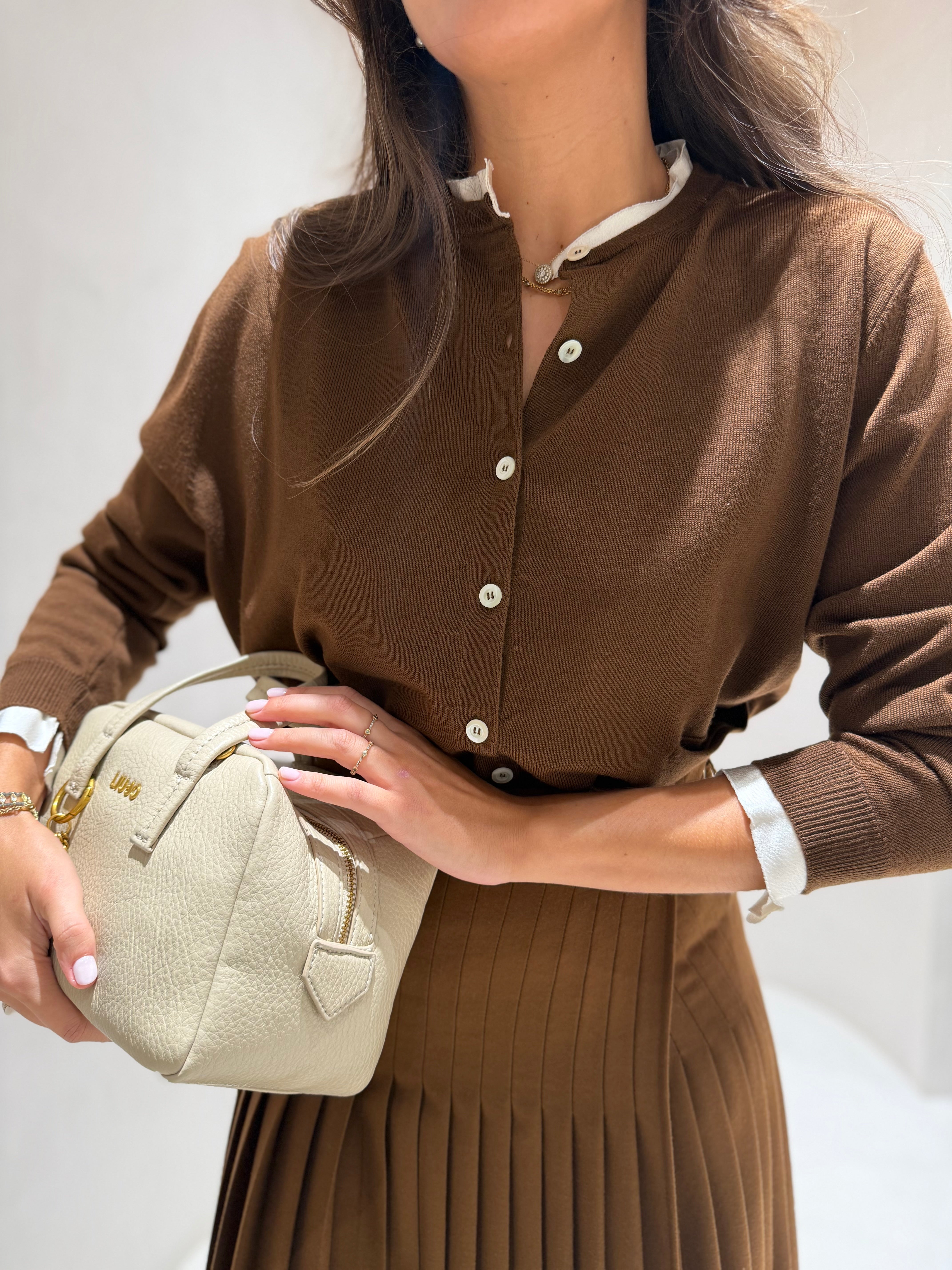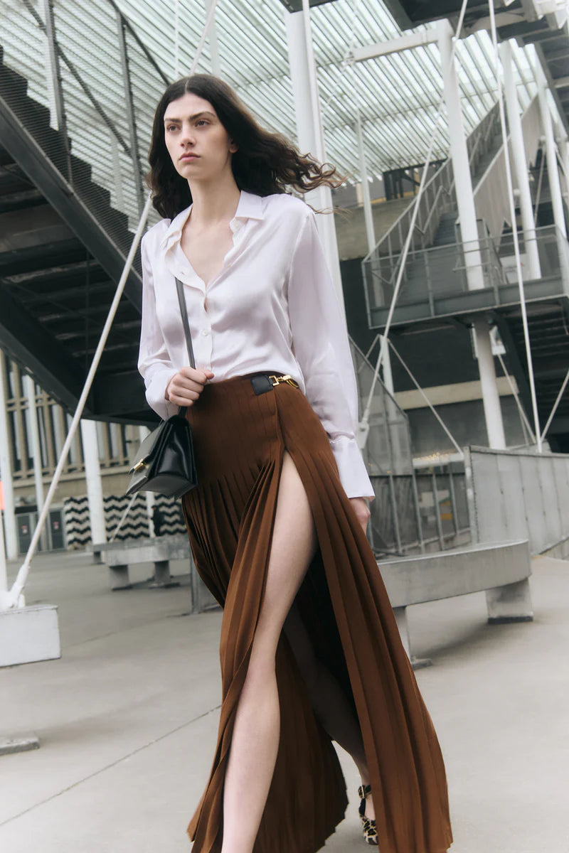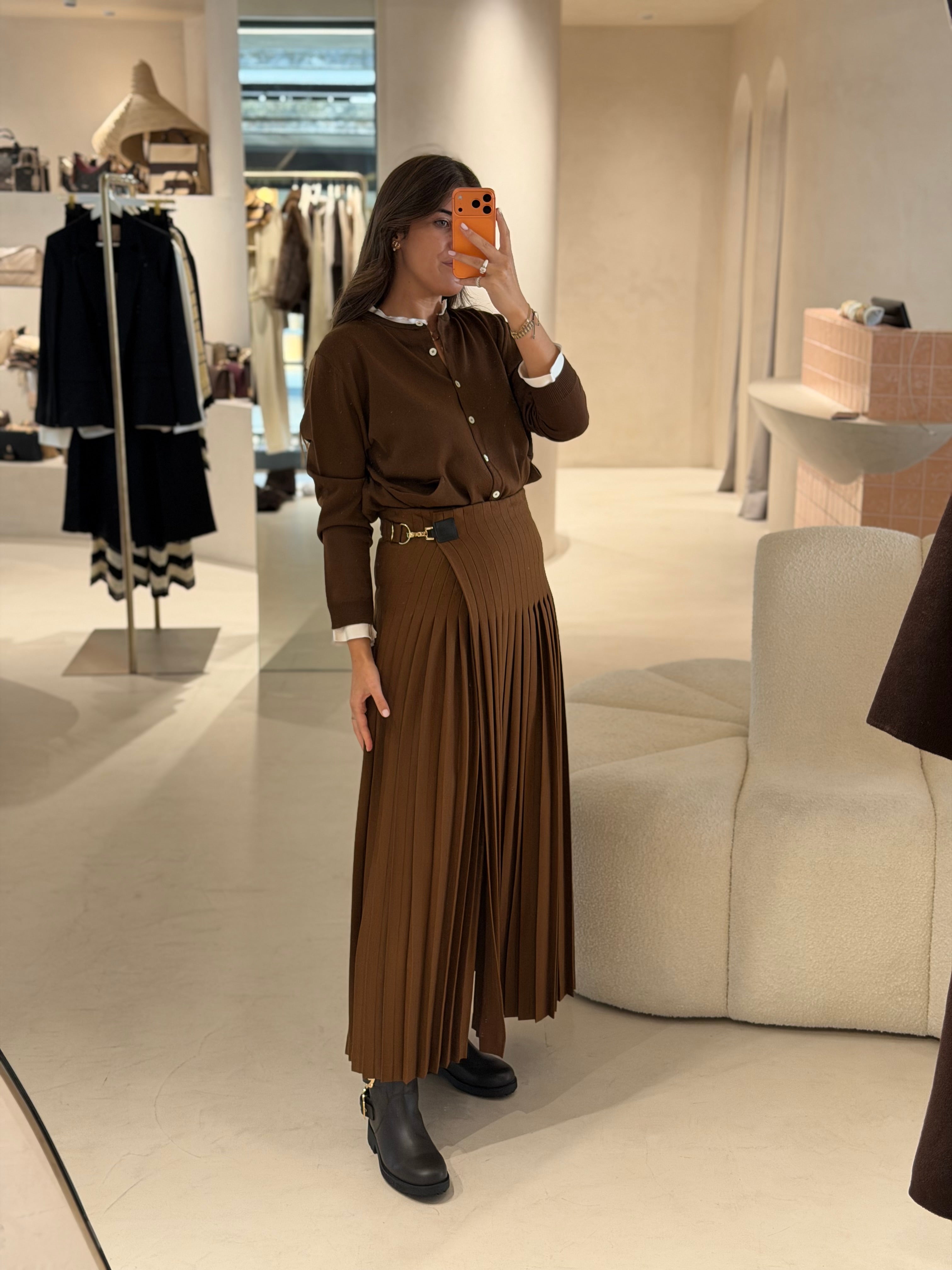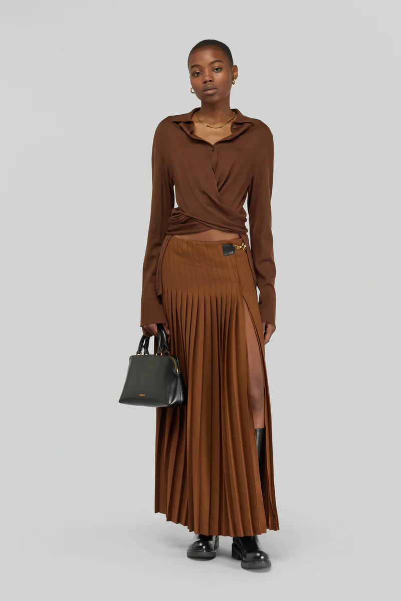 A saia Agueda da Semicouture combina textura rica e design sofisticado. Confeccionada em 98% lã fleece e 2% elastano, apresenta cintura com fecho de fivela e mosquetão e silhueta pregueada. Um modelo versátil, ideal para transitar entre o casual chic e uma produção mais requintada — use com malhas soltas e botas em looks diurnos ou com camisas estruturadas e escarpins para ocasiões especiais.