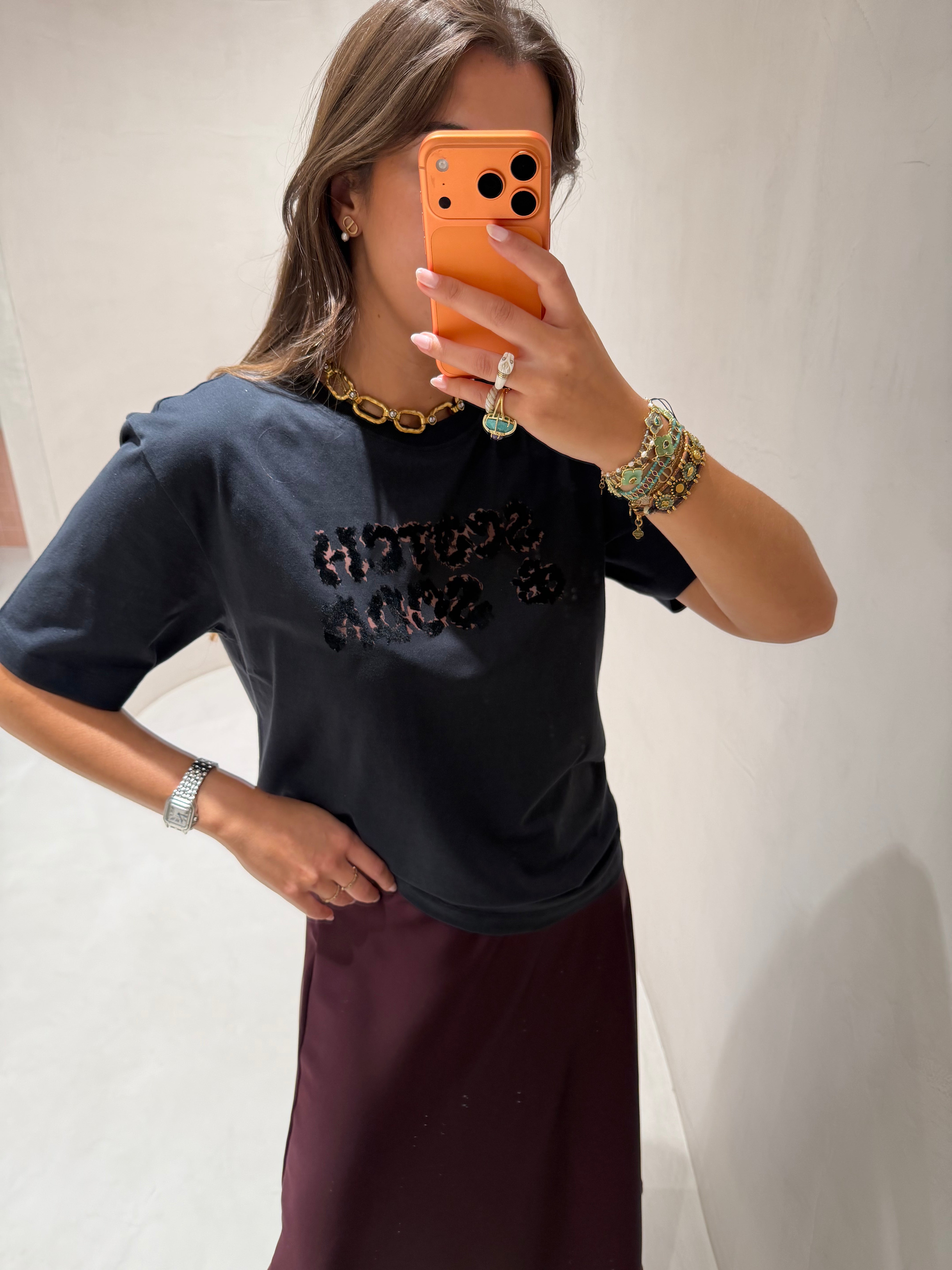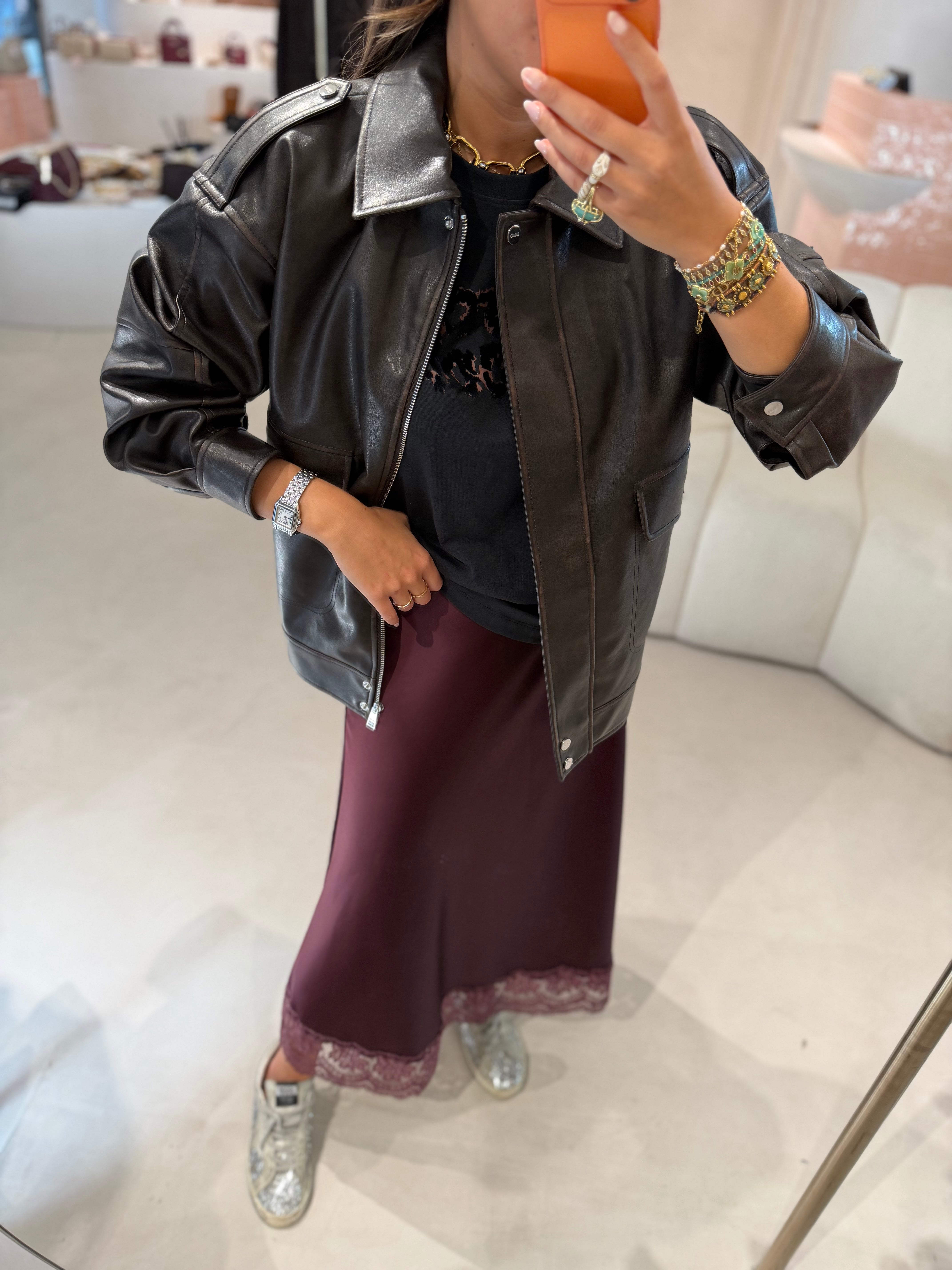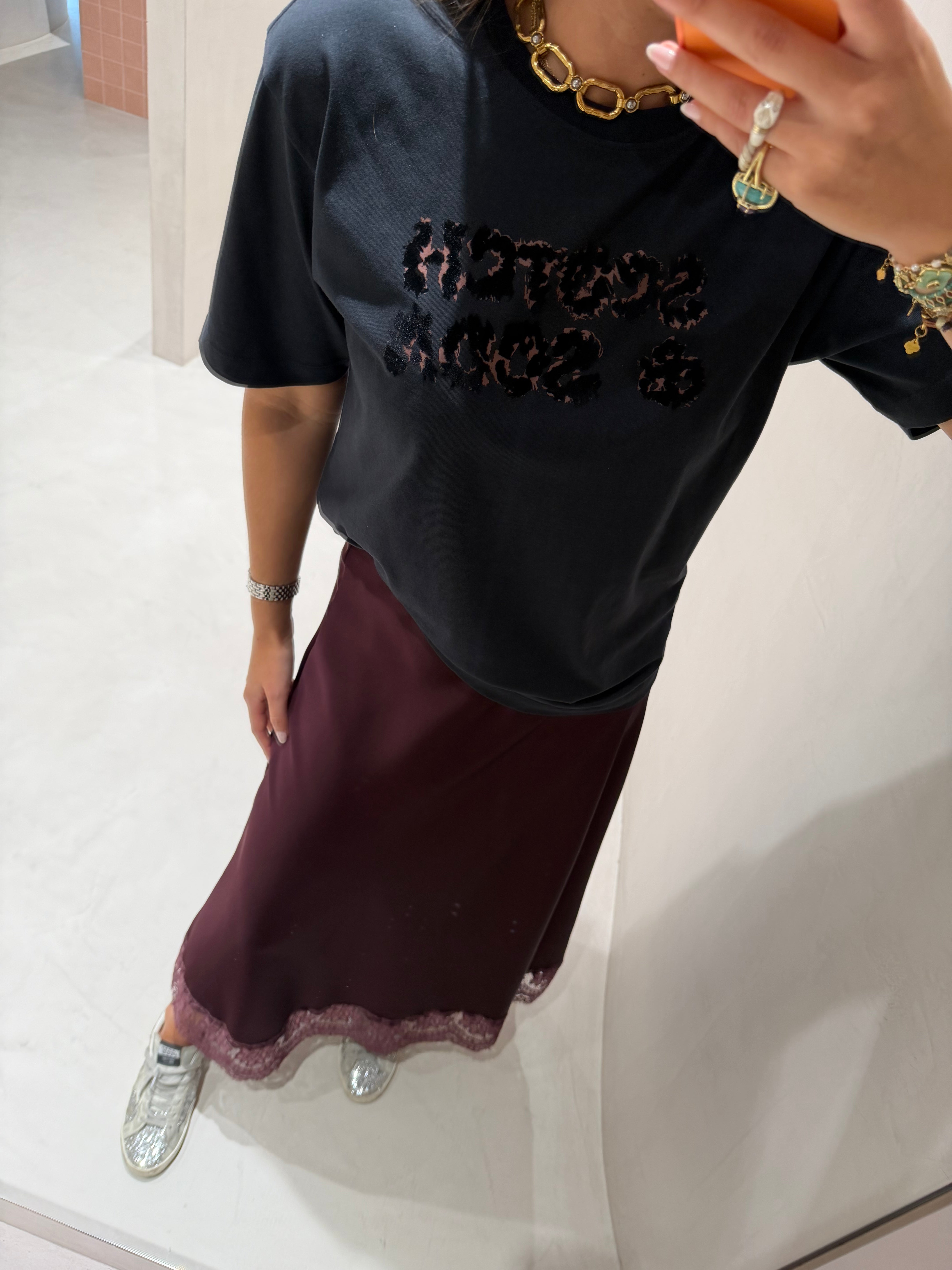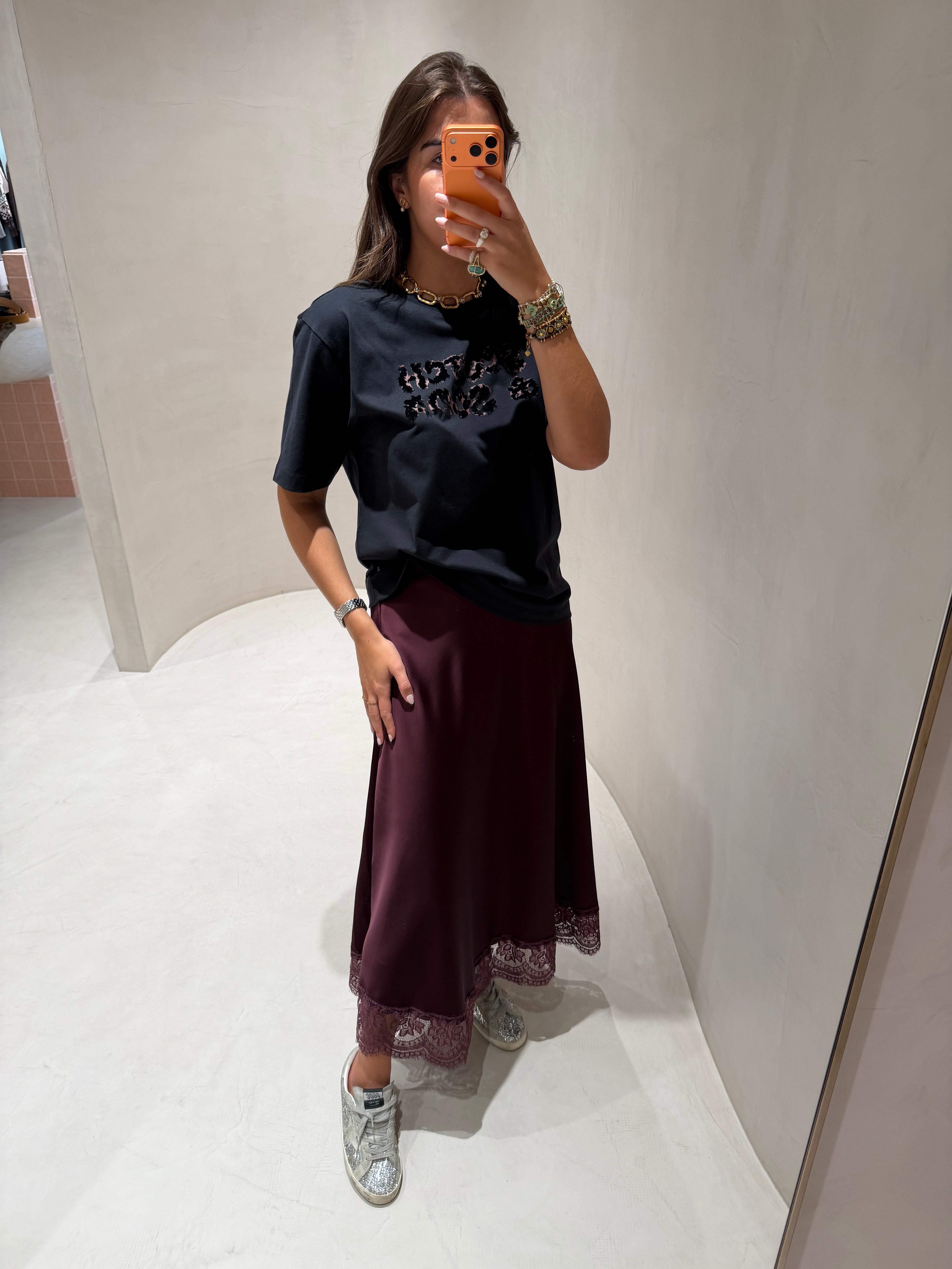 Saia preta acetinada com acabamento em renda na bainha. Modelo elegante com cós elástico para máximo conforto. Fluida e sofisticada, perfeita para looks de dia ou noite.