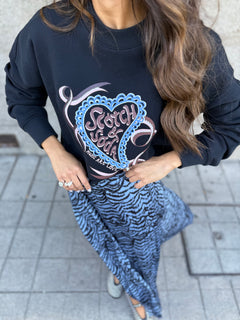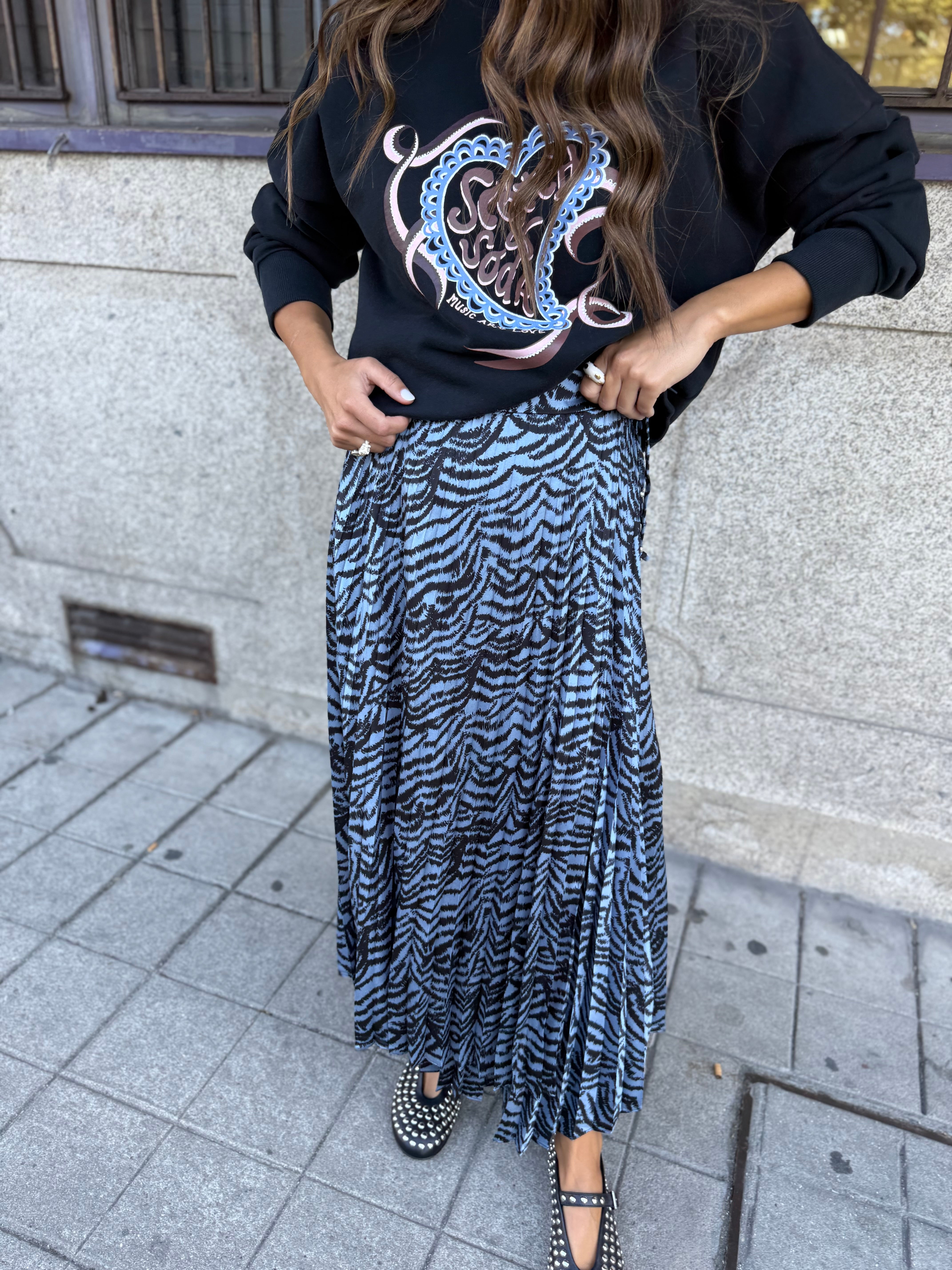 O padrão com inspiração exótica combinado com tons suaves azuis — torna-a uma peça de destaque. O comprimento midi torna-a versátil: fica bem com sandálias ou tacões para ocasiões mais formais, ou com botas e uma camisola para um look urbano descontraído.
