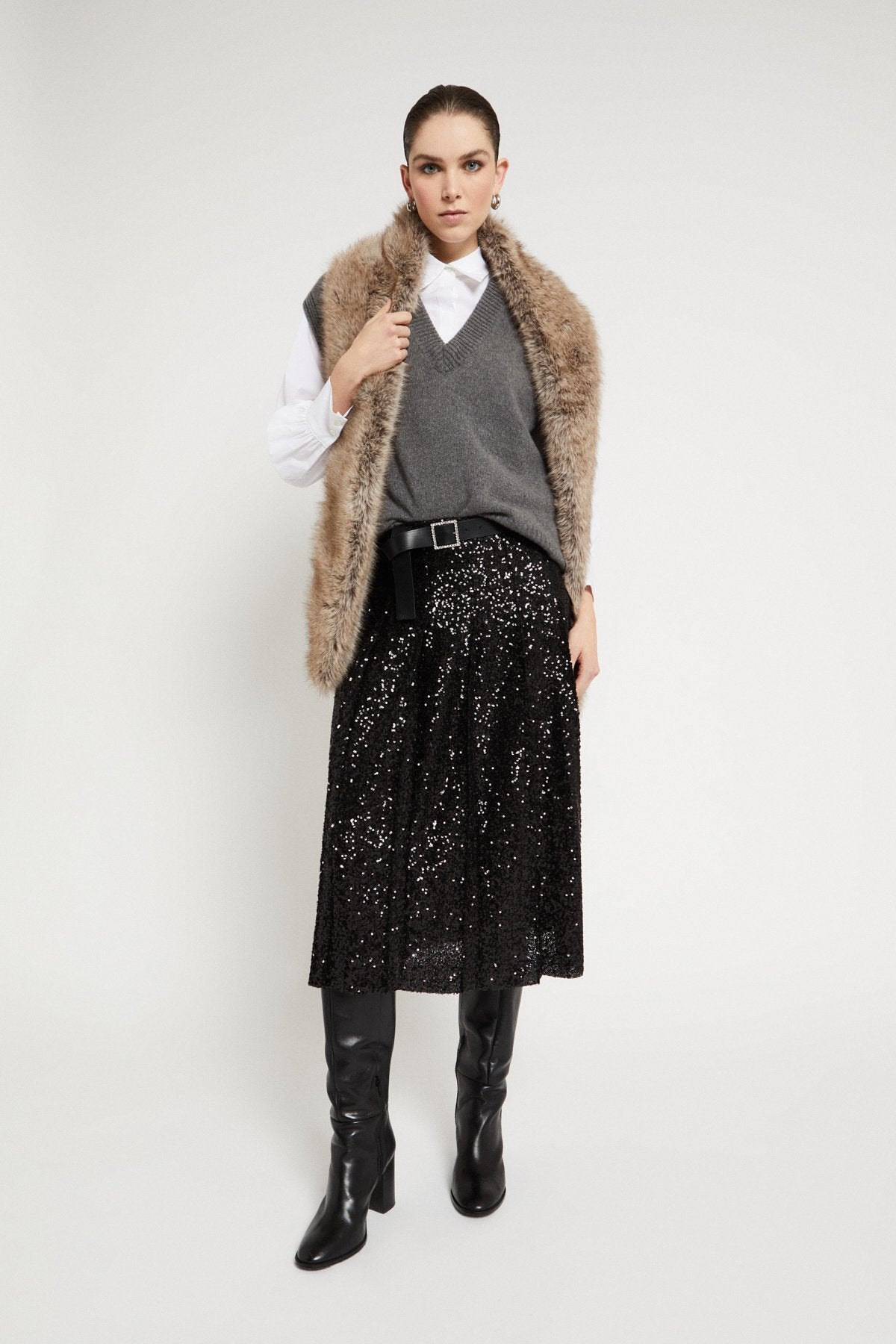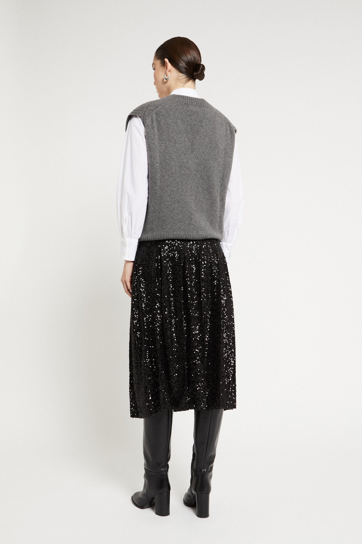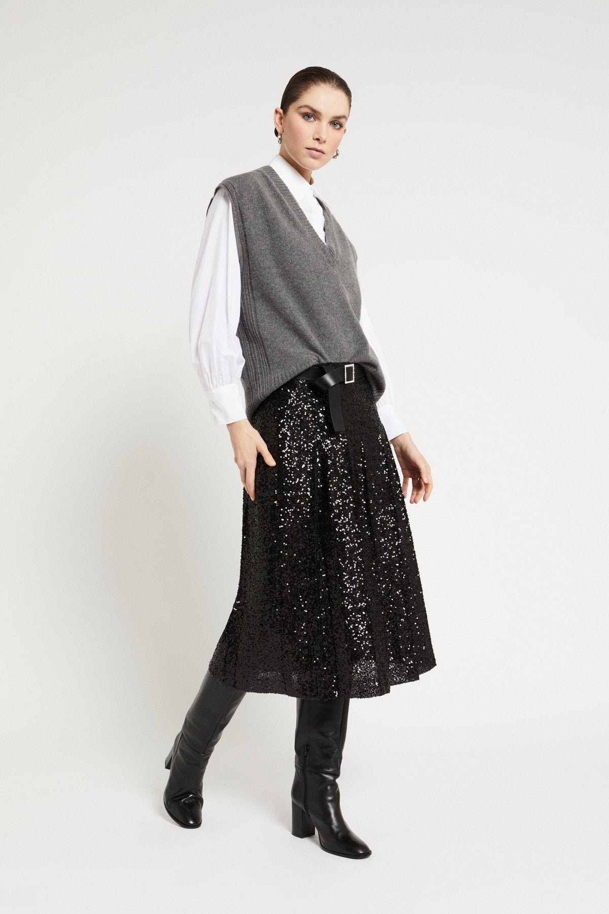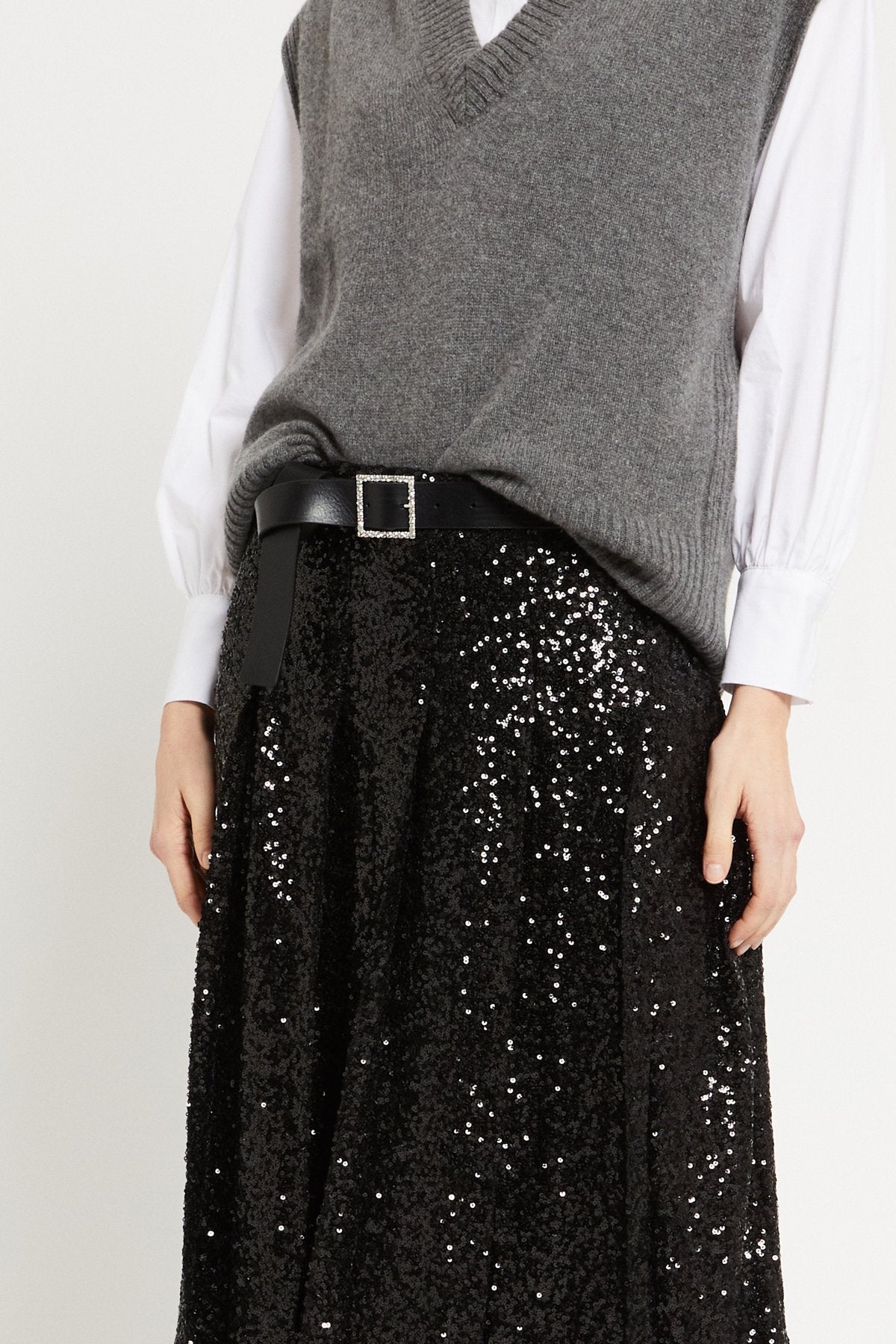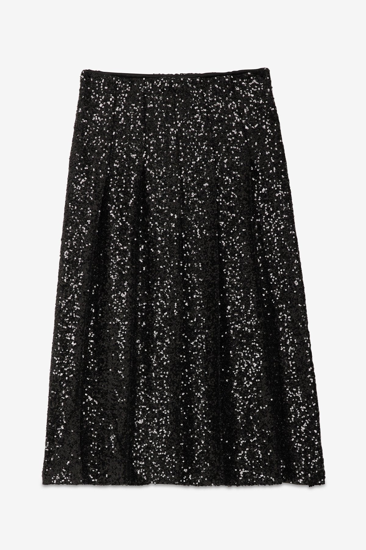 Desta peça sofisticada, a saia midi de paetês irradia brilho e atitude ideal para destacar-se em ocasiões especiais ou dar um toque glamouroso a um look mais descontraído.