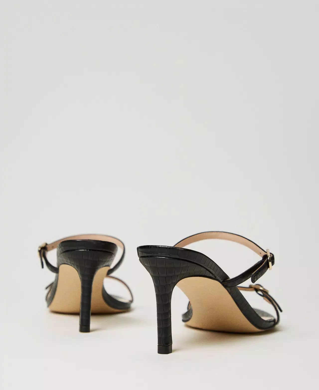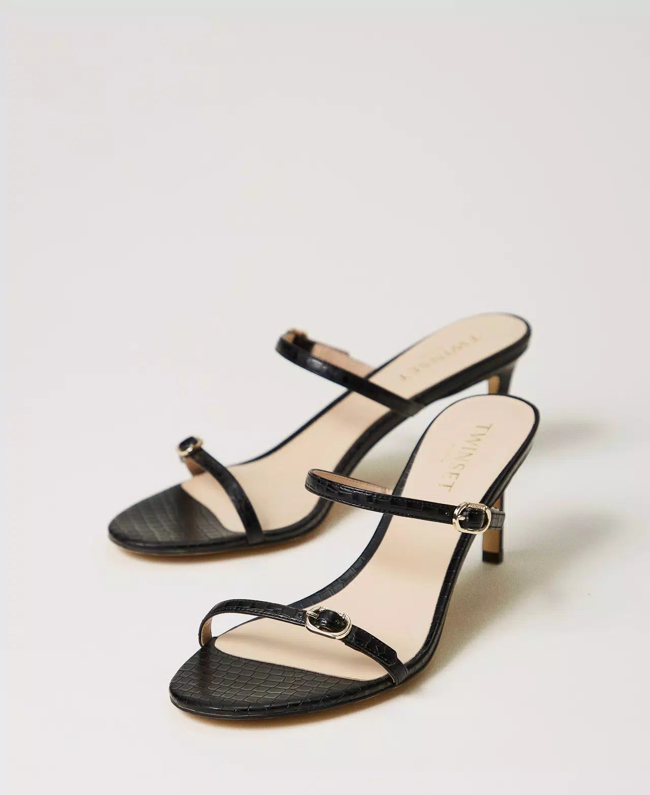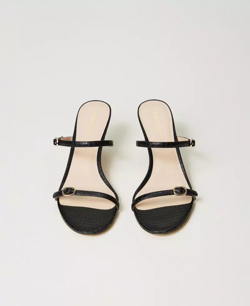 Sandália efeito coco com tira dupla e fivela em metal, salto fino e com altura de 7cm.