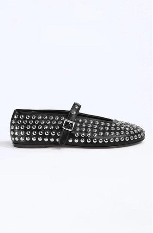 Sabrina em pele modelo mary jane com fivela e tachas metálicas.