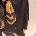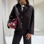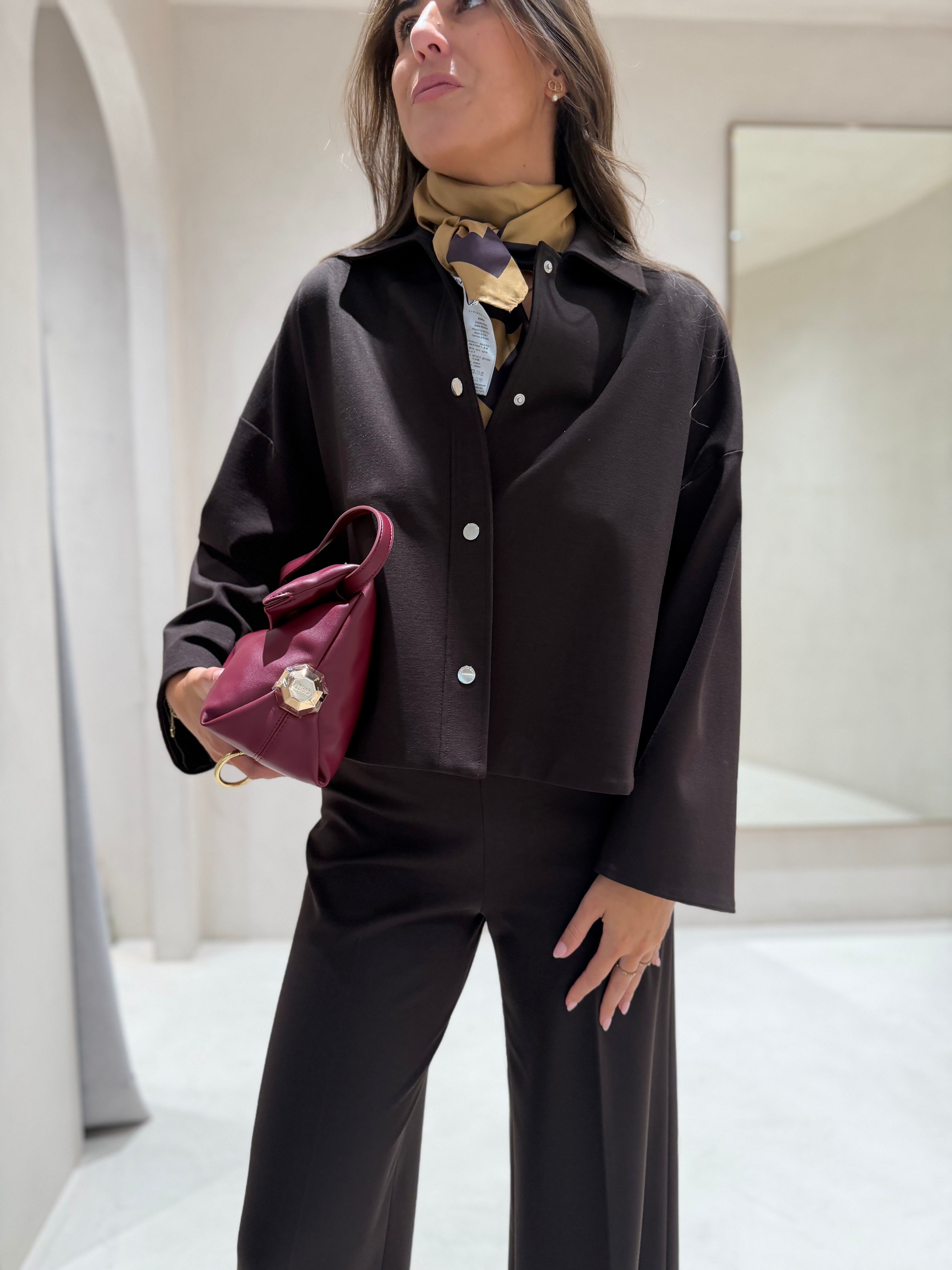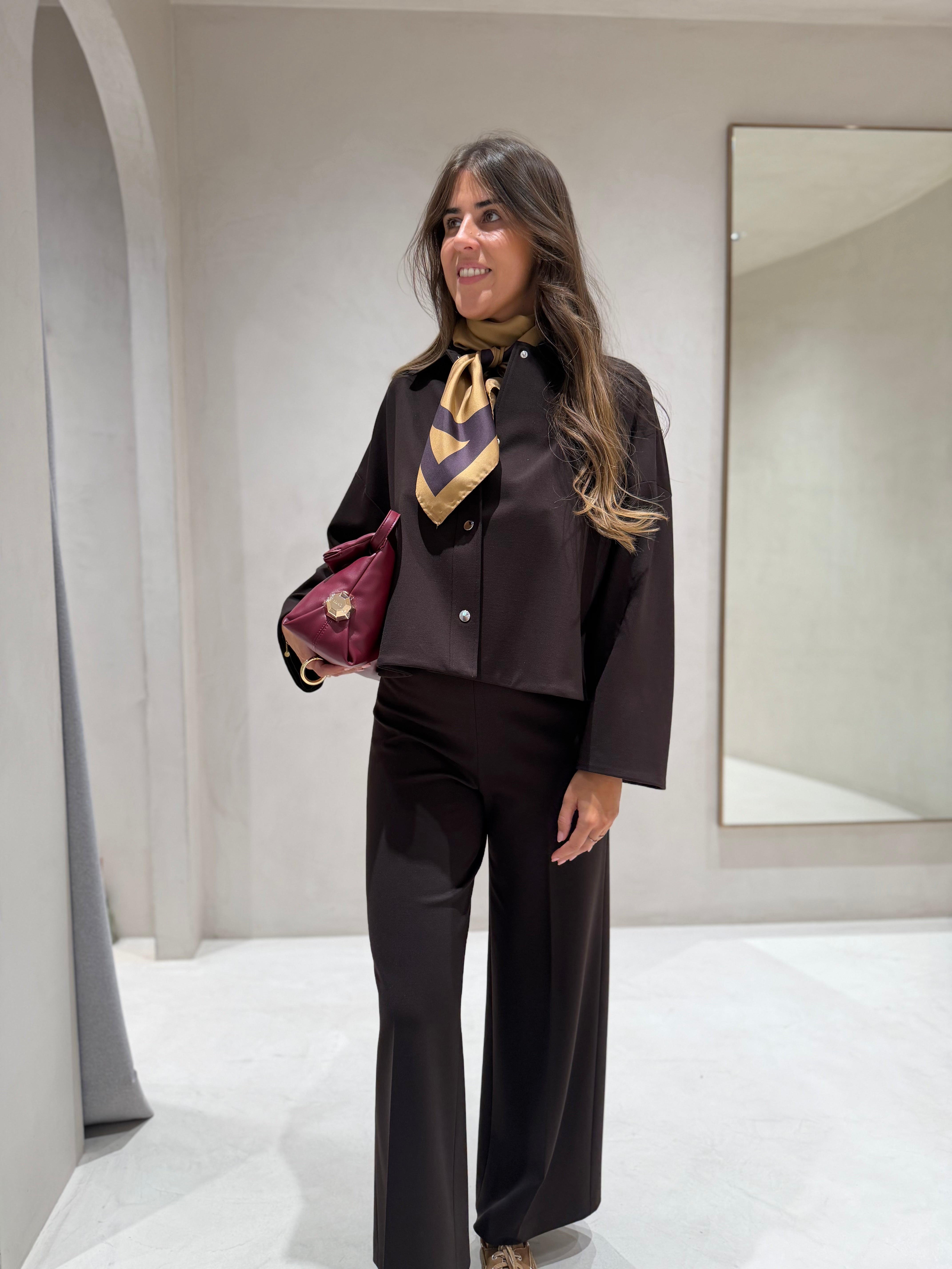 A jaqueta Sandara da Liviana Conti une elegância e atitude com seu corte cropped e mangas amplas batwing. Ideal para compor looks modernos, ela equilibra bem com peças de cintura alta e pode ser usada aberta ou fechada, adaptando-se do casual ao sofisticado. O tom castanho chocolate garante versatilidade e um styling minimalista e marcante.