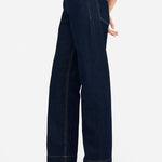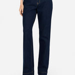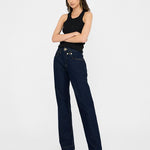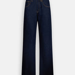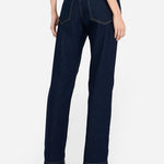 Jeans de corte straight leg, em denim “dark blue”, com cintura alta e proposta cinco bolsos clássicos .Detalhe de aplique com pérolas/pedras nas laterais acrescenta brilho e sofisticação. Fecho oculto com botão e fecho de correr.