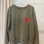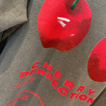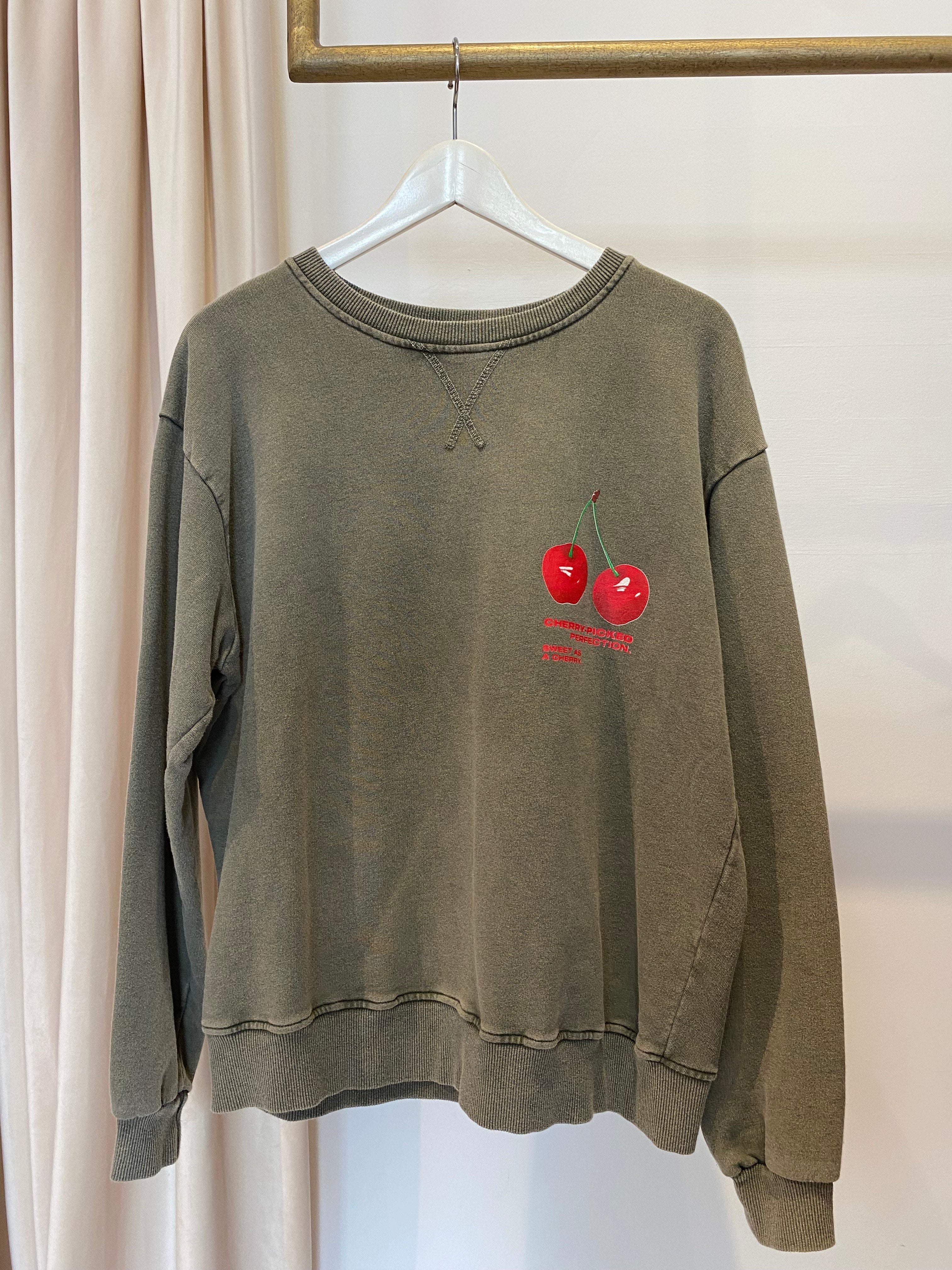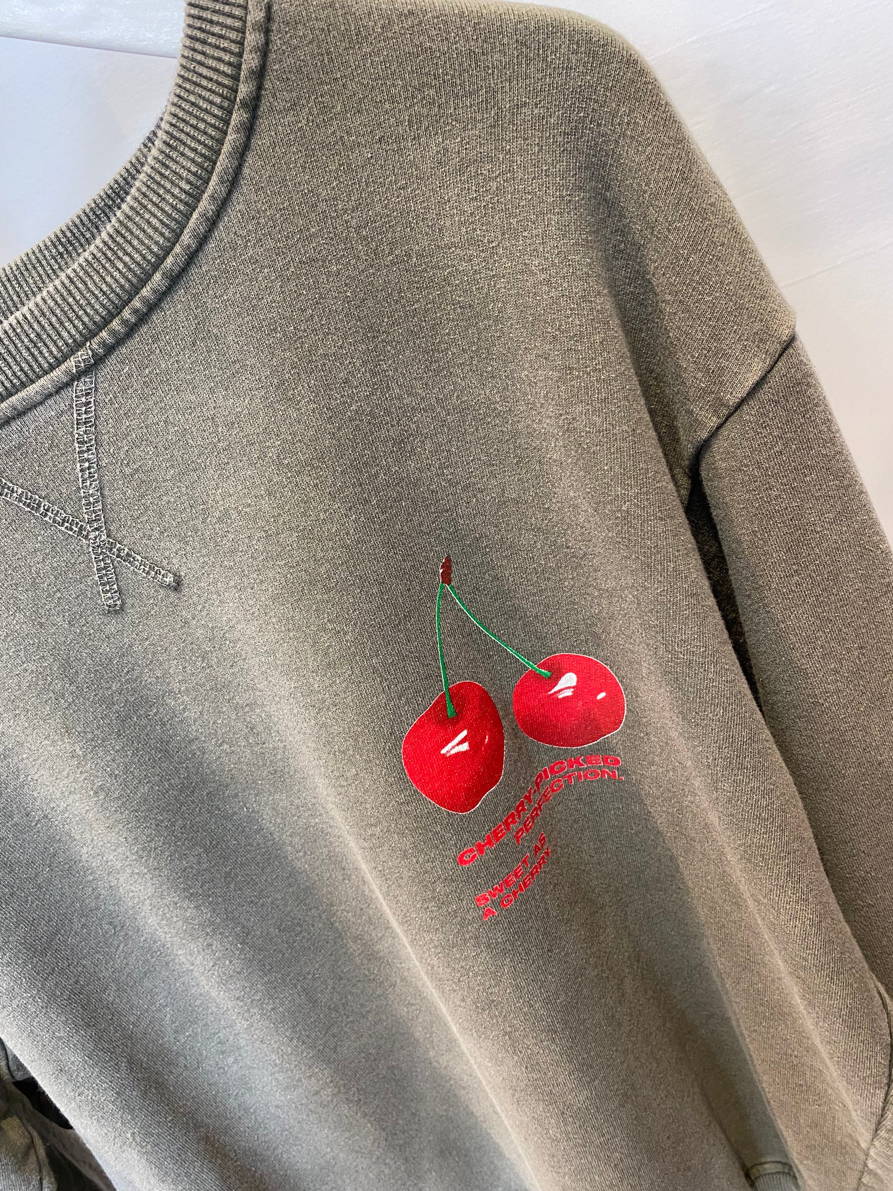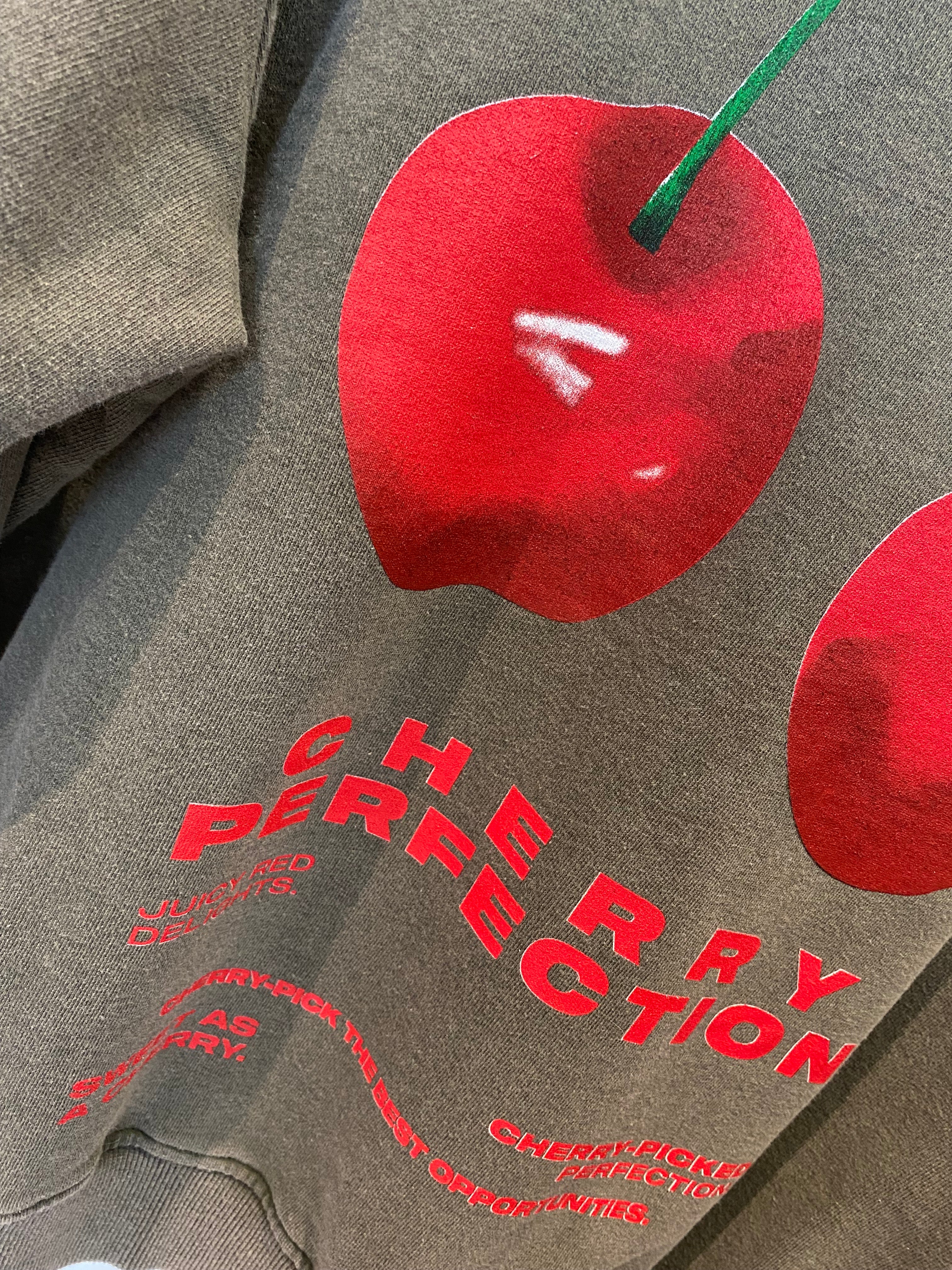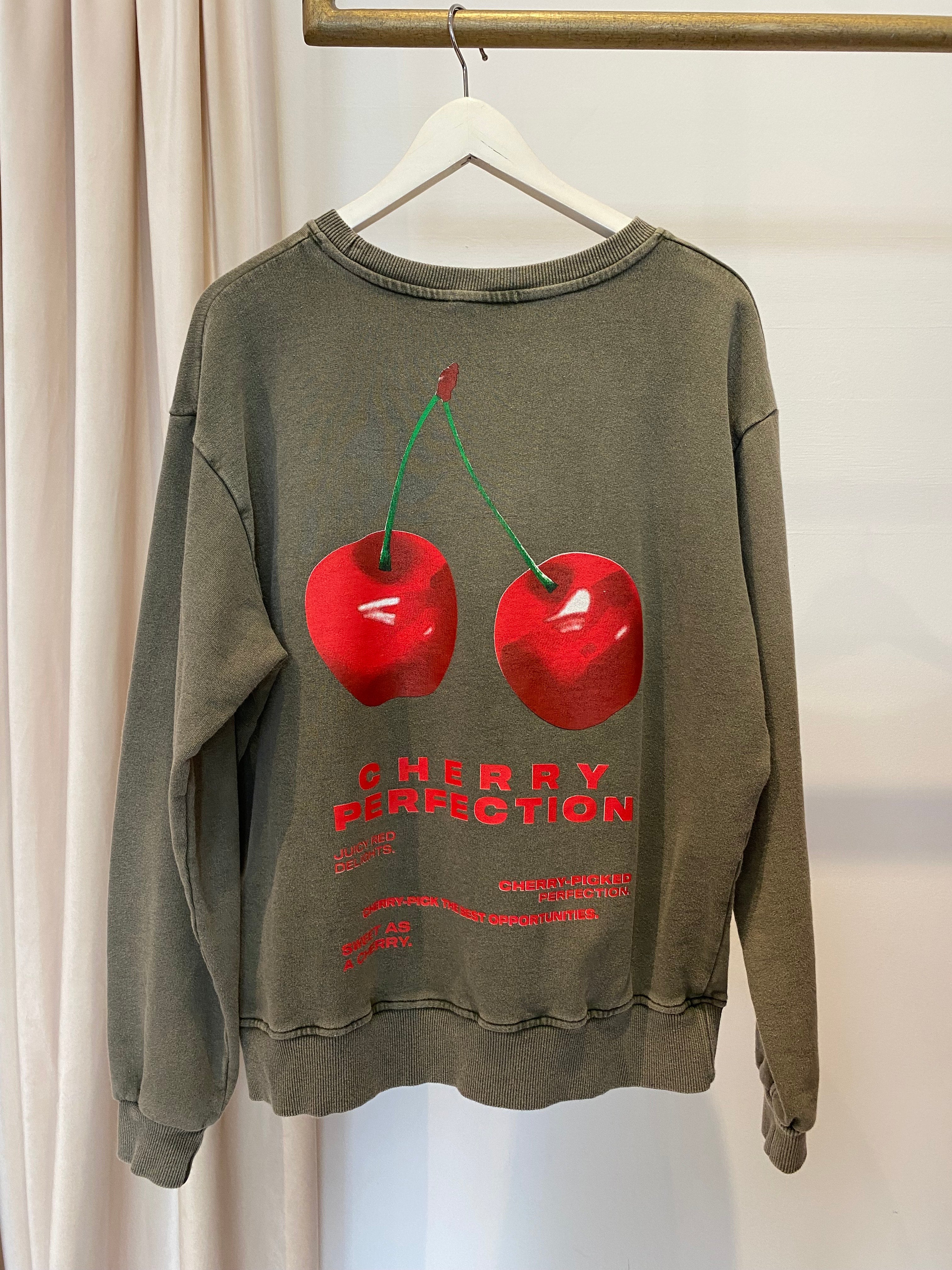 Sweatshirt oversized verde com cerejas estampadas à frente e atrás.