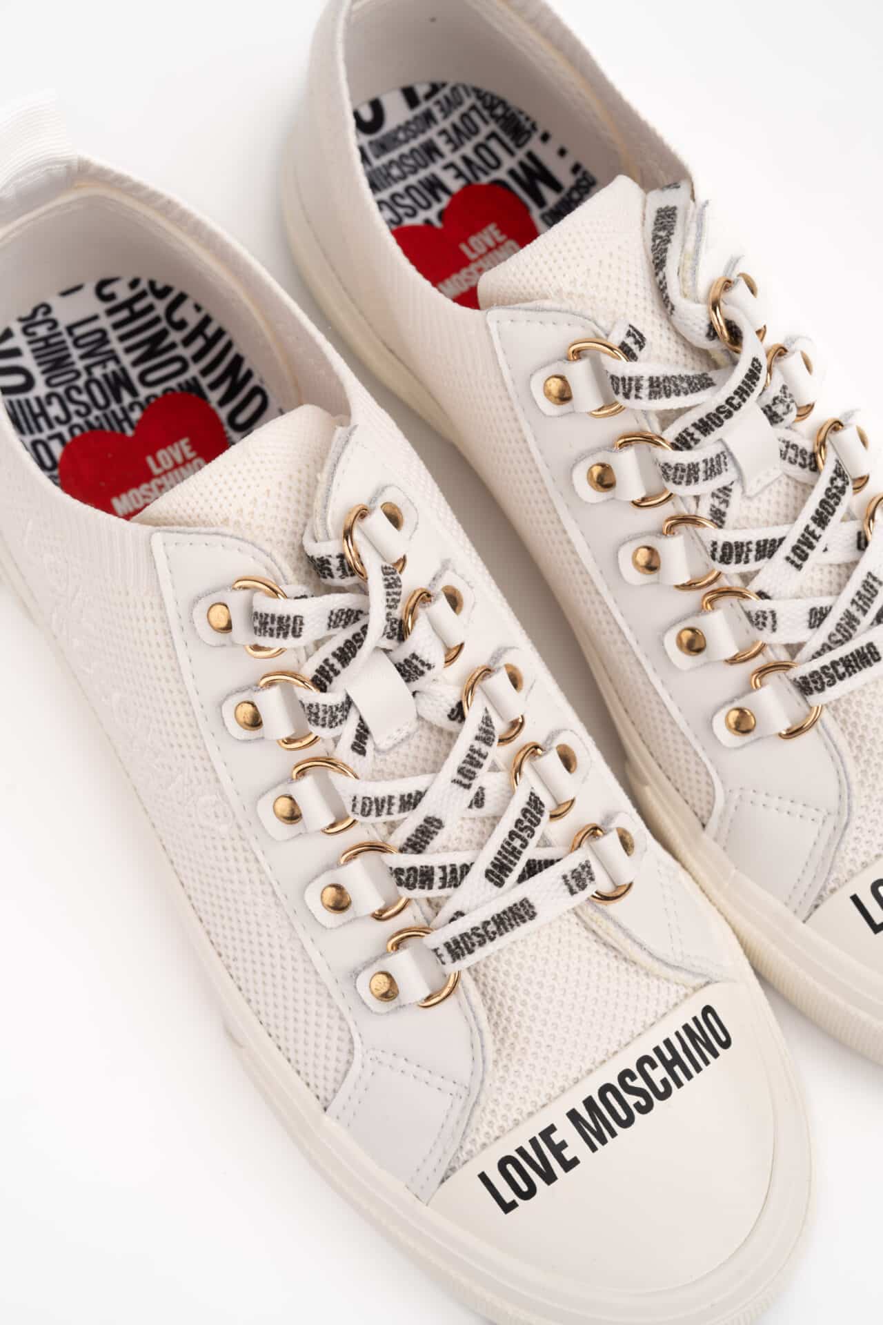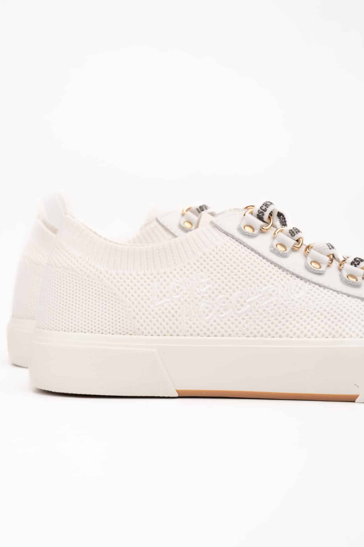 Ténis Love Moschino branco em tecido, atacadores brancos e atacadores com logotipo.