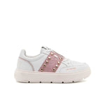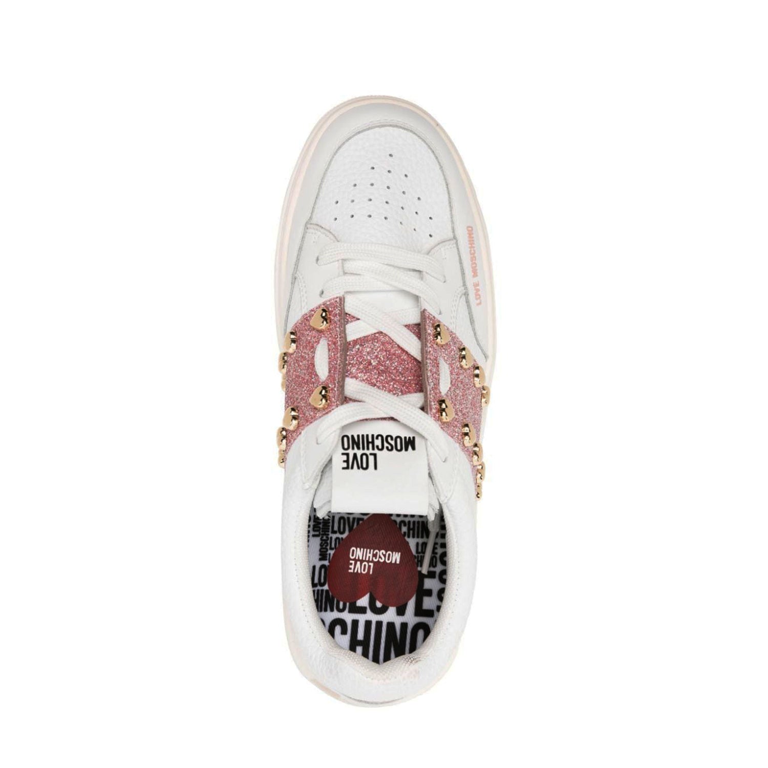 Ténis Love Moschino de plataforma em pele, branco e com uma faixa rosa com brilhantes. Detalhado com corações dourados.
