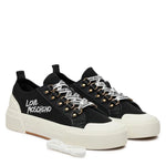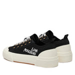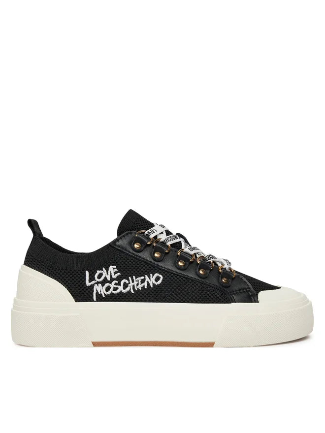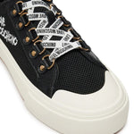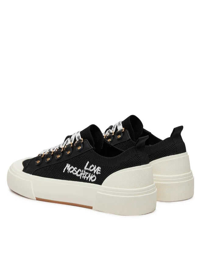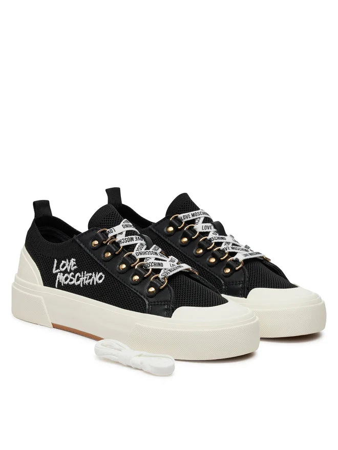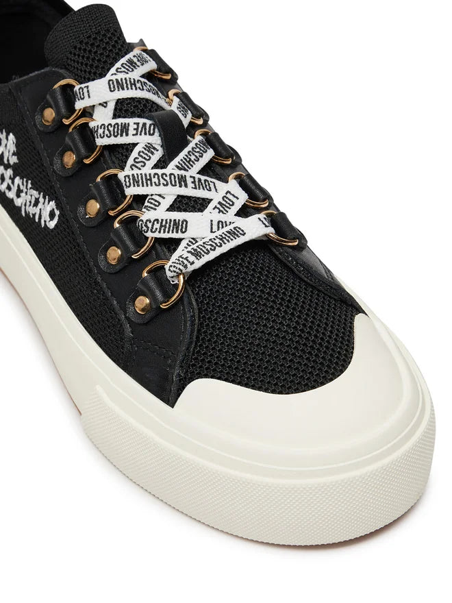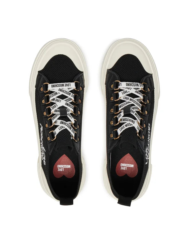 Ténis Love Moschino preto em tecido, atacadores brancos e atacadores com logotipo.
