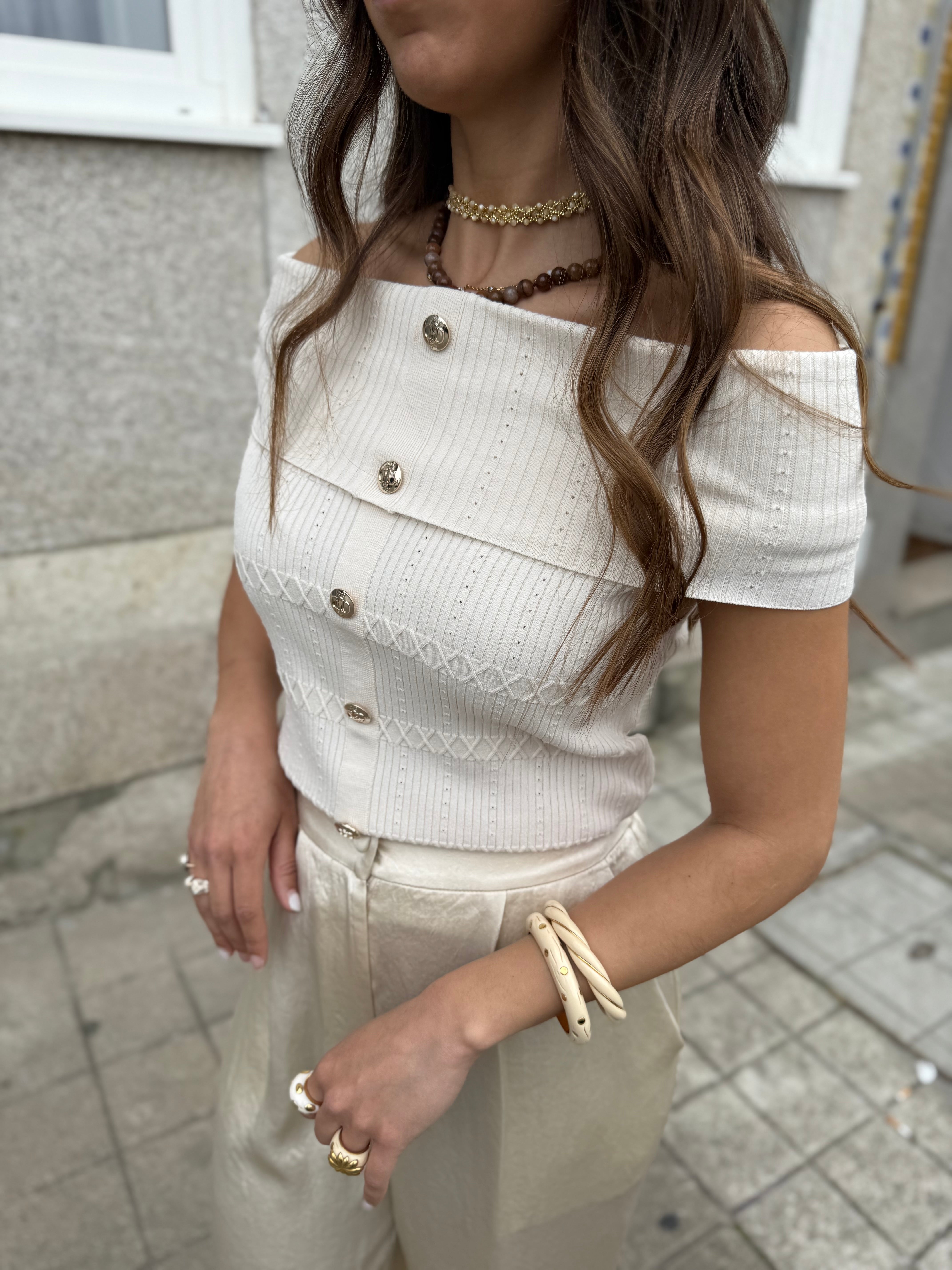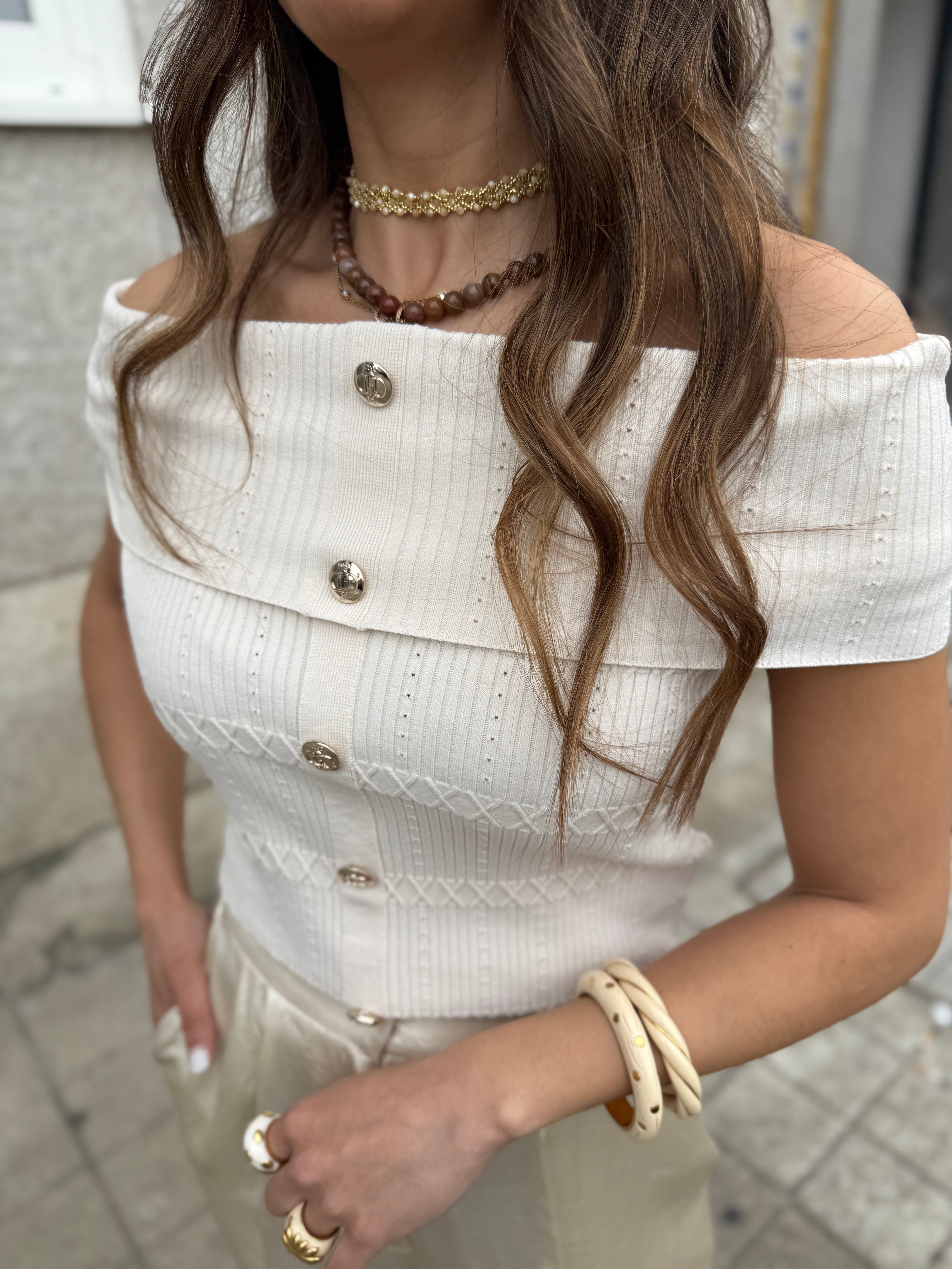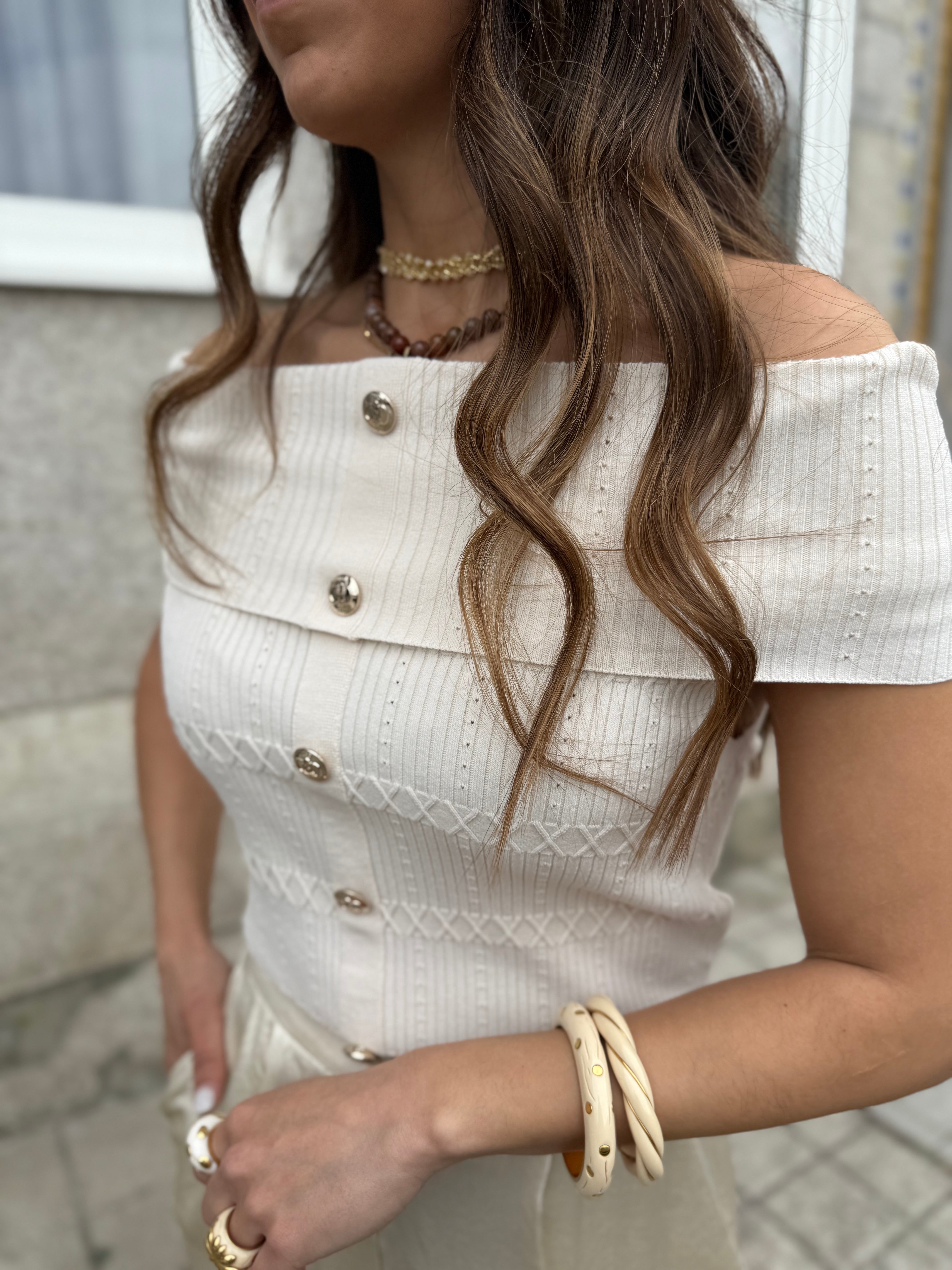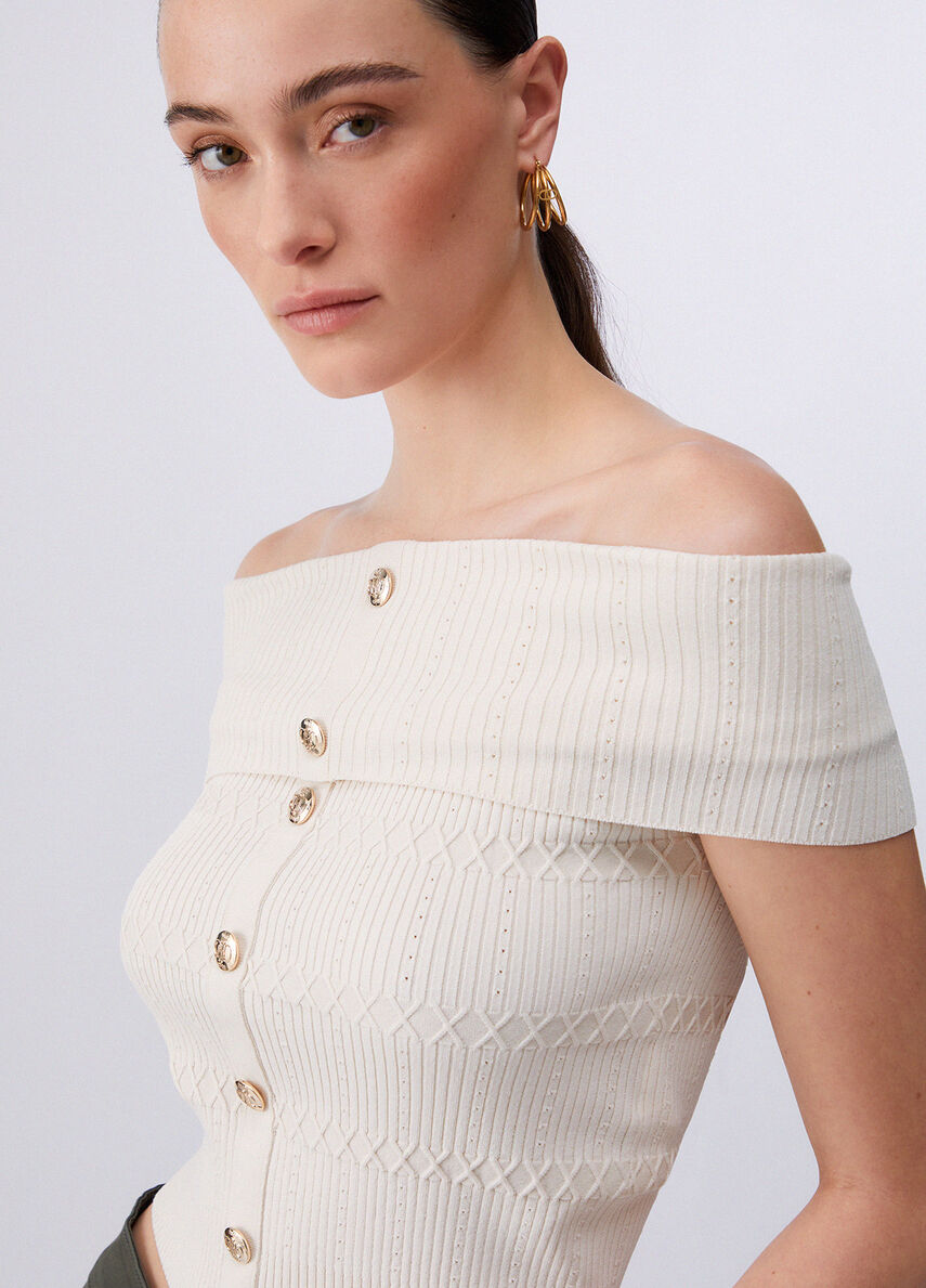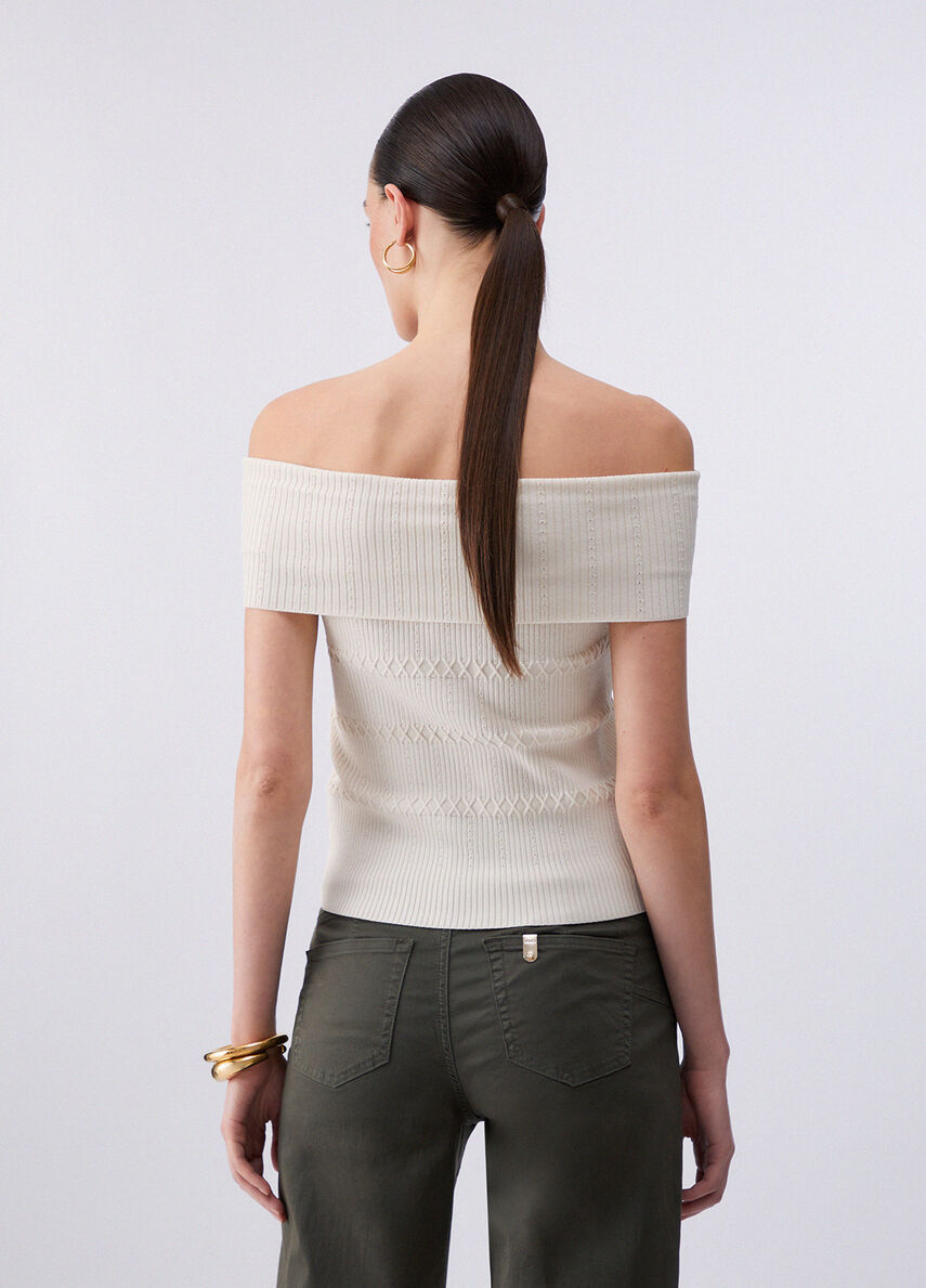 Eleva o teu guarda-roupa com o Top de Malha com Decote Bardot da Liu Jo, uma peça feminina que combina estilo contemporâneo e elegância intemporal. Confeccionado em malha suave e confortável, este top apresenta um decote Bardot amplo e marcante que valoriza os ombros, oferecendo um look ao mesmo tempo sensual e sofisticado perfeito para várias ocasiões, do dia-a-dia ao momento especial.