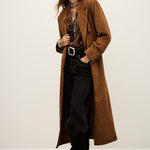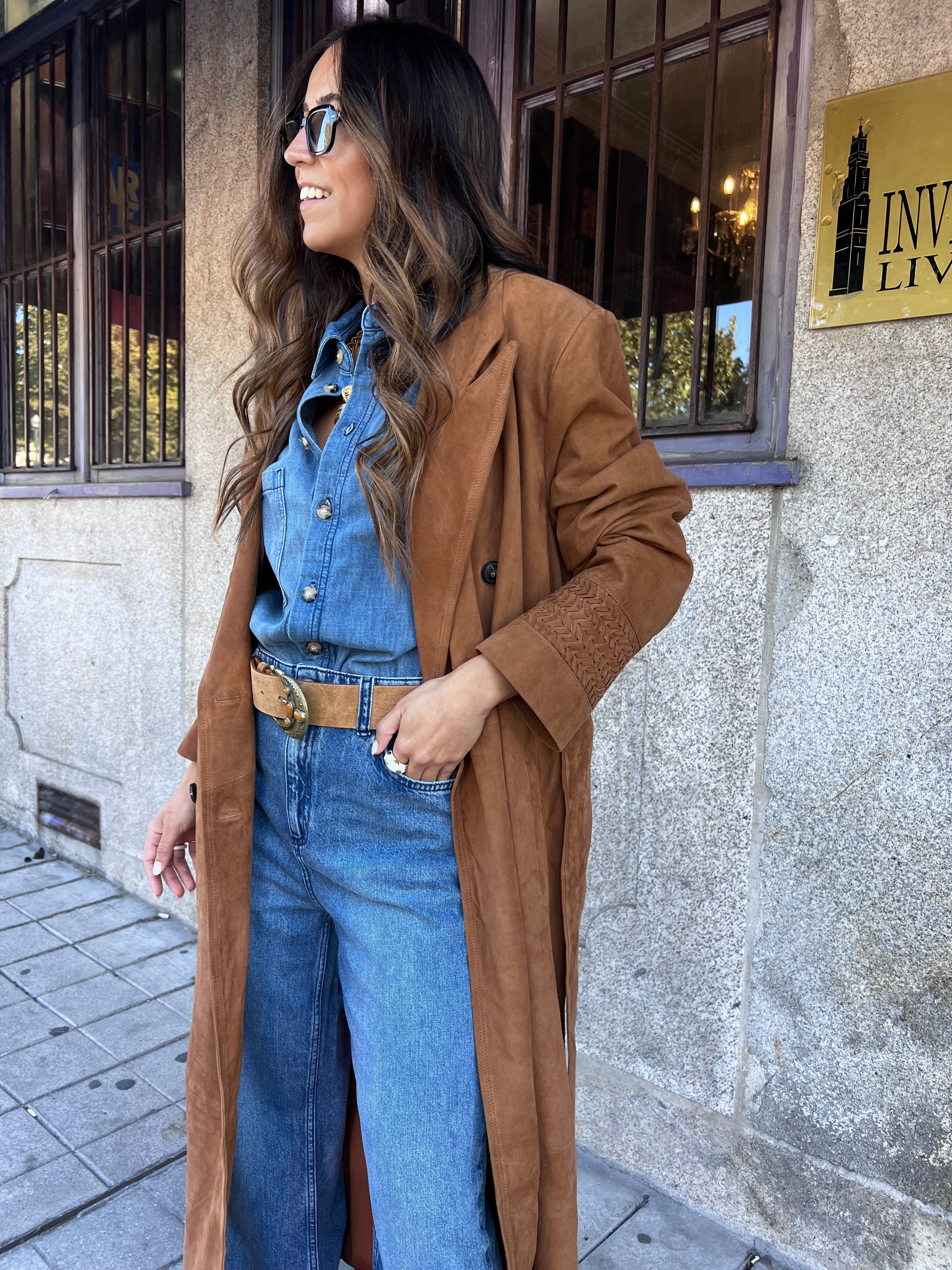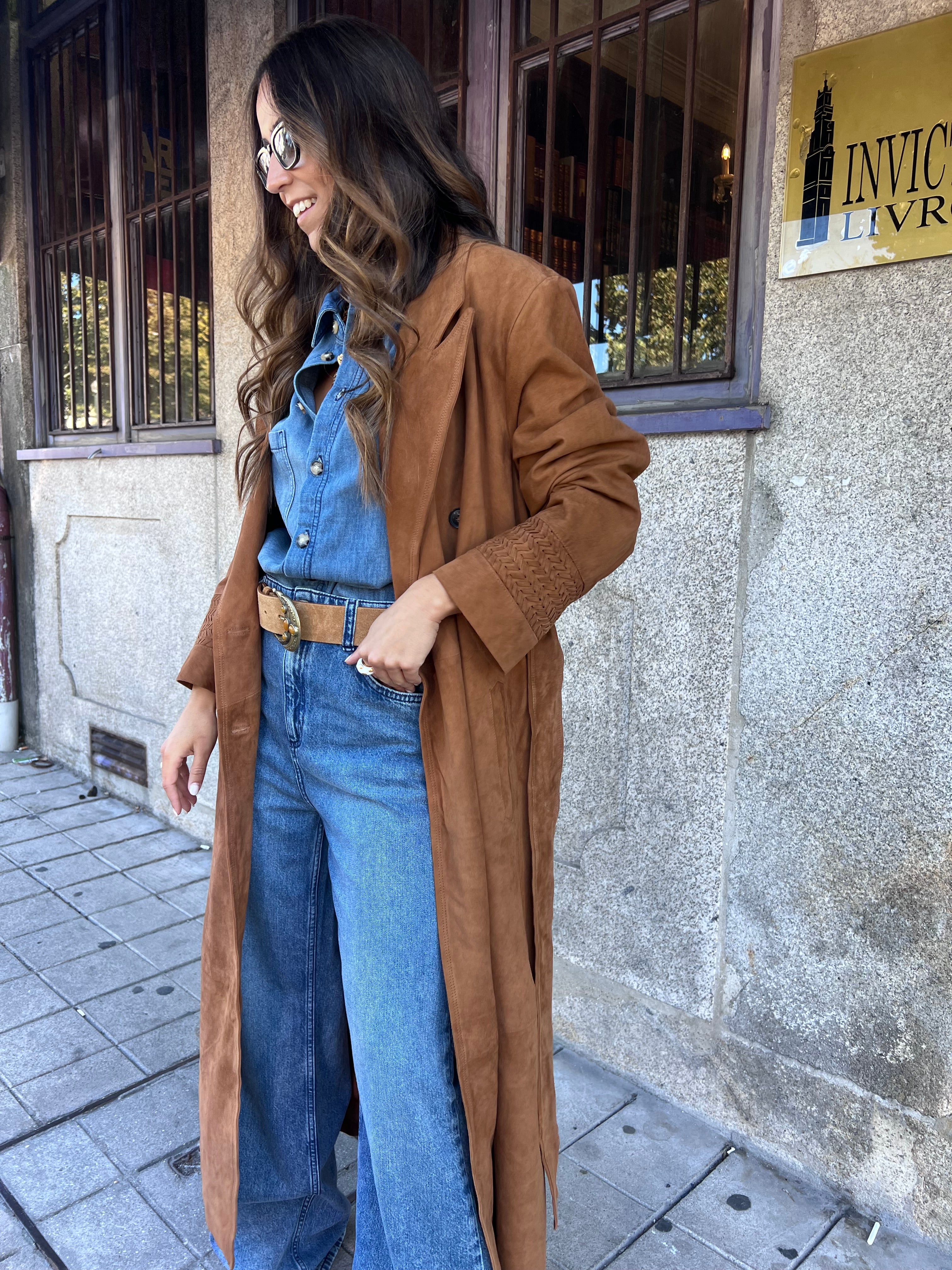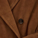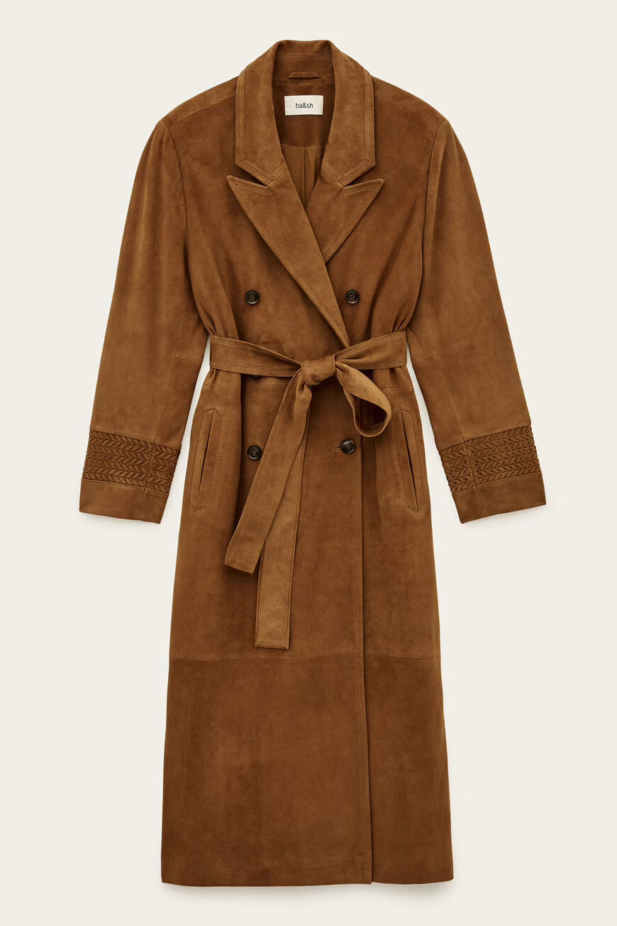 O trench‑coat Maina Camel da ba&sh traz o clássico reinventado: corte muito longo com estilo rock‑chic, em camurça de cabra (100% cuir velours de caprin), botões duplos, gola italiana e fendas generosas atrás. Com detalhes bordados nos punhos, é uma peça statement que versatiliza looks, perfeita sobre vestidos leves ou jeans estruturados para um visual sofisticado e ousado