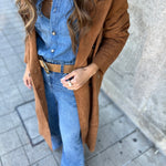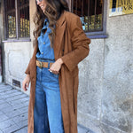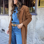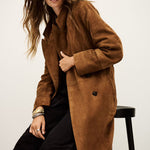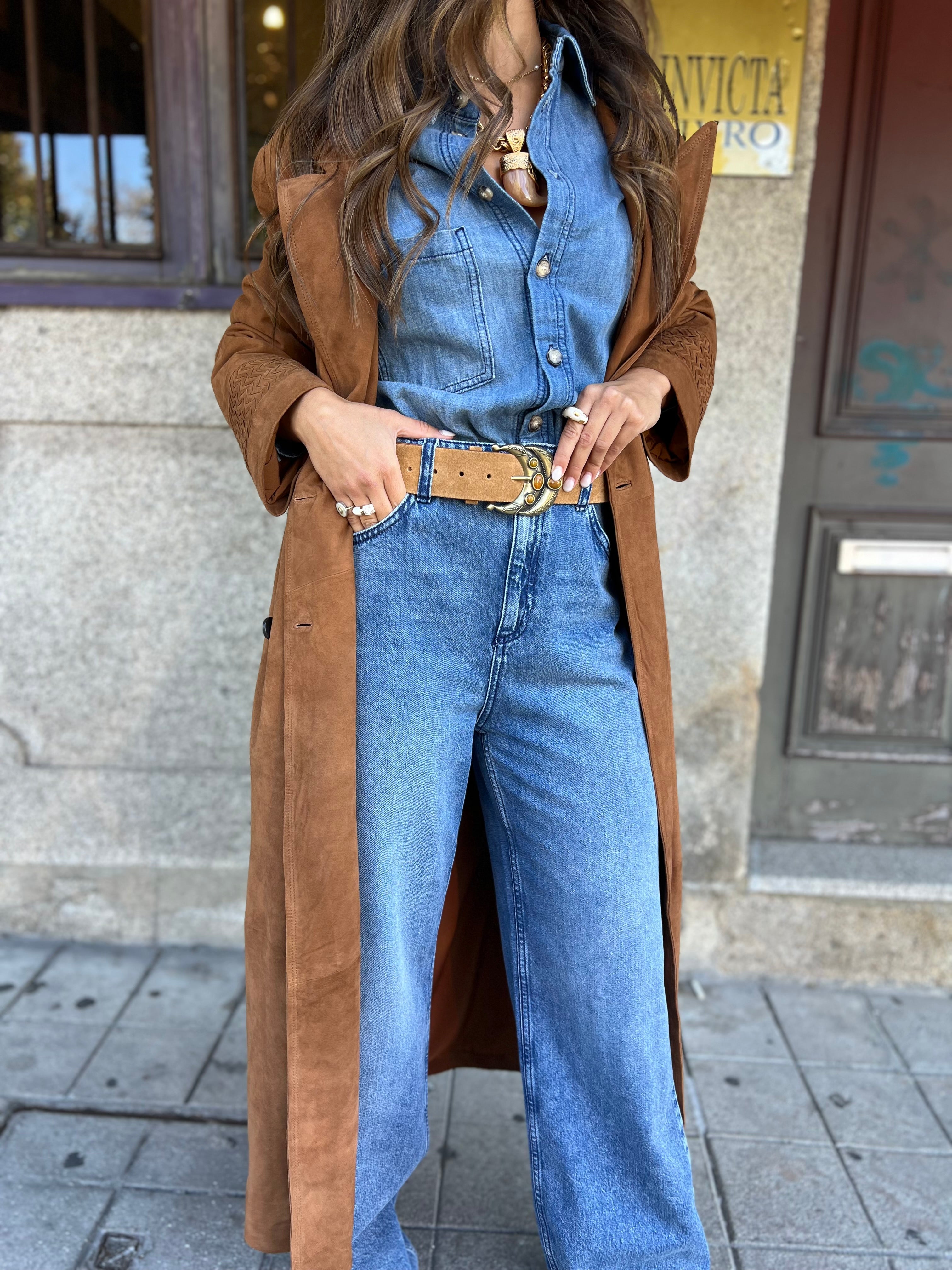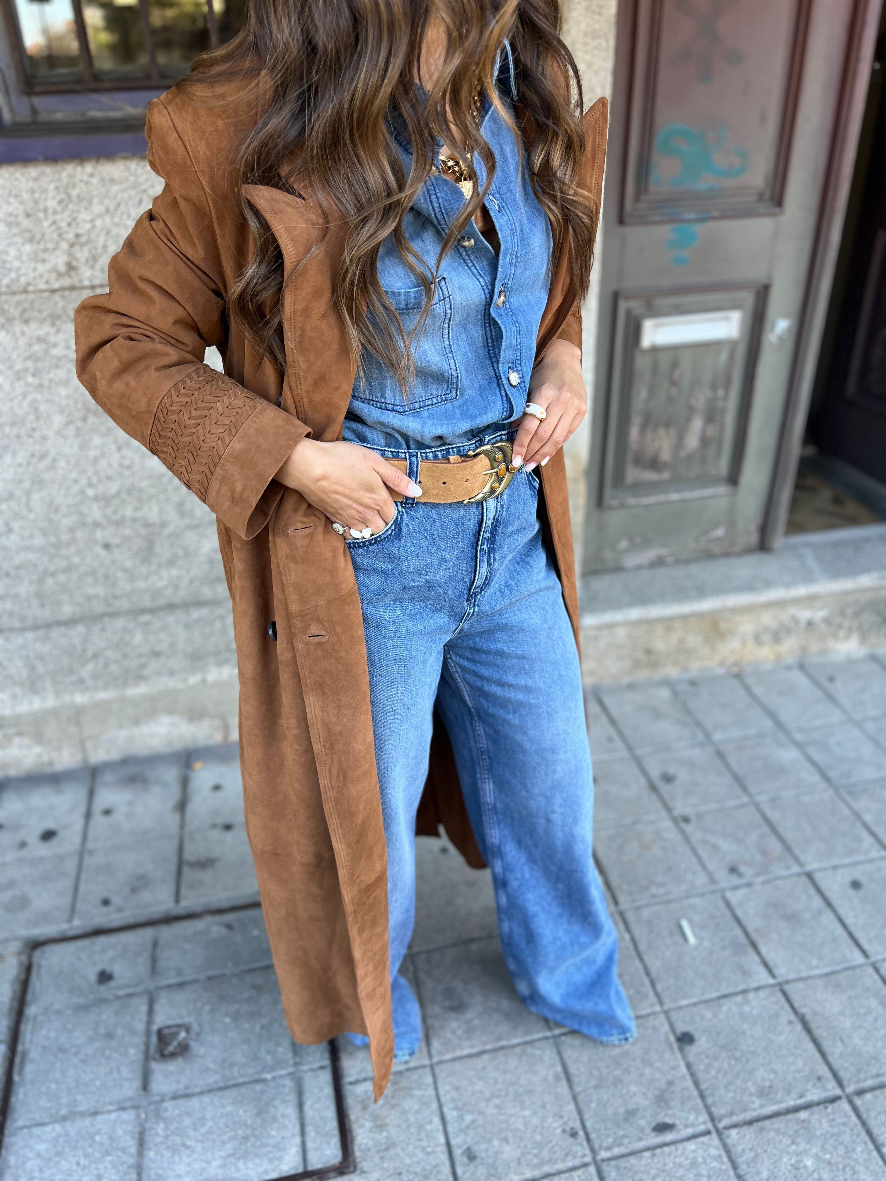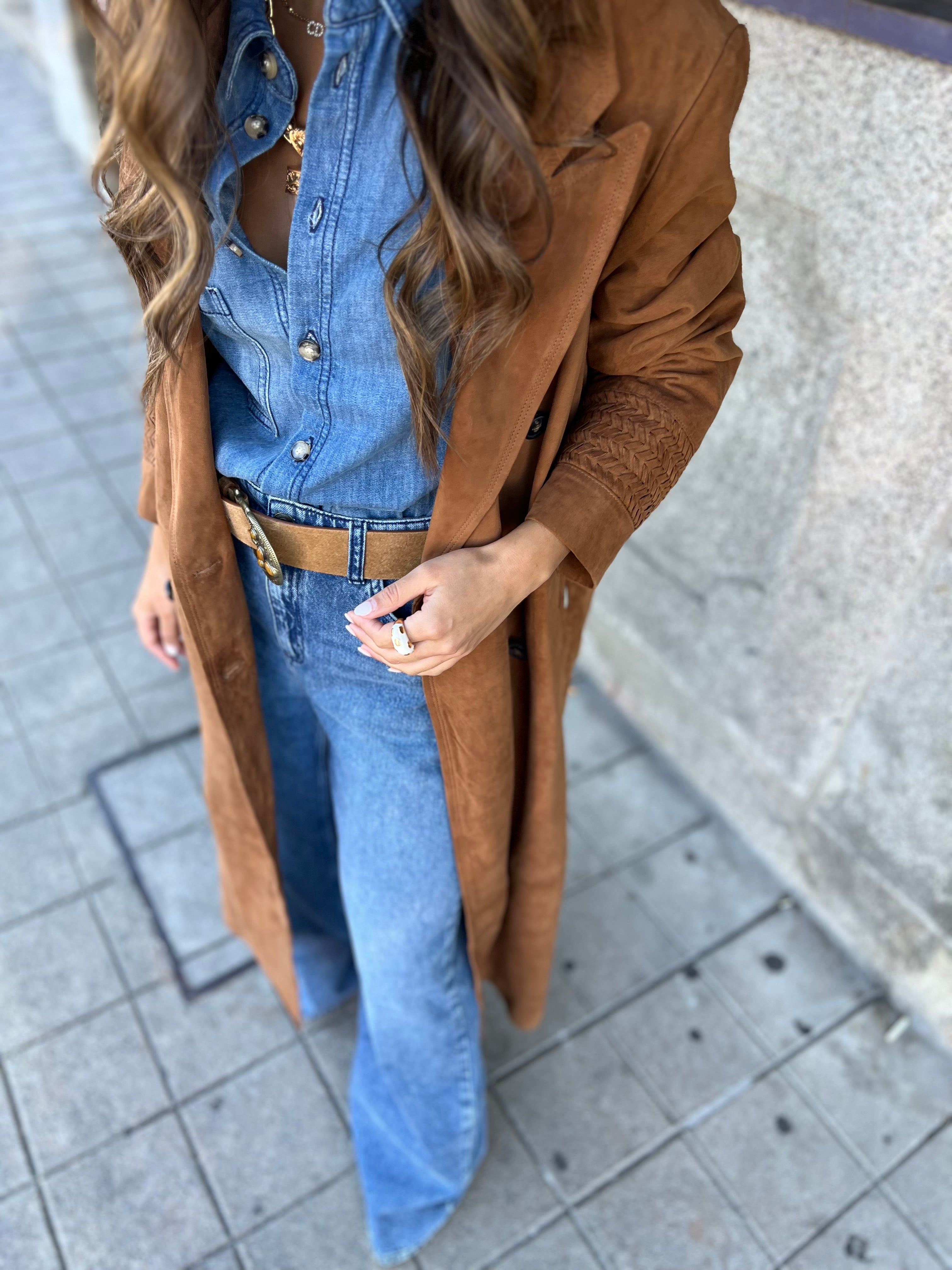 O trench‑coat Maina Camel da ba&sh traz o clássico reinventado: corte muito longo com estilo rock‑chic, em camurça de cabra (100% cuir velours de caprin), botões duplos, gola italiana e fendas generosas atrás. Com detalhes bordados nos punhos, é uma peça statement que versatiliza looks, perfeita sobre vestidos leves ou jeans estruturados para um visual sofisticado e ousado
