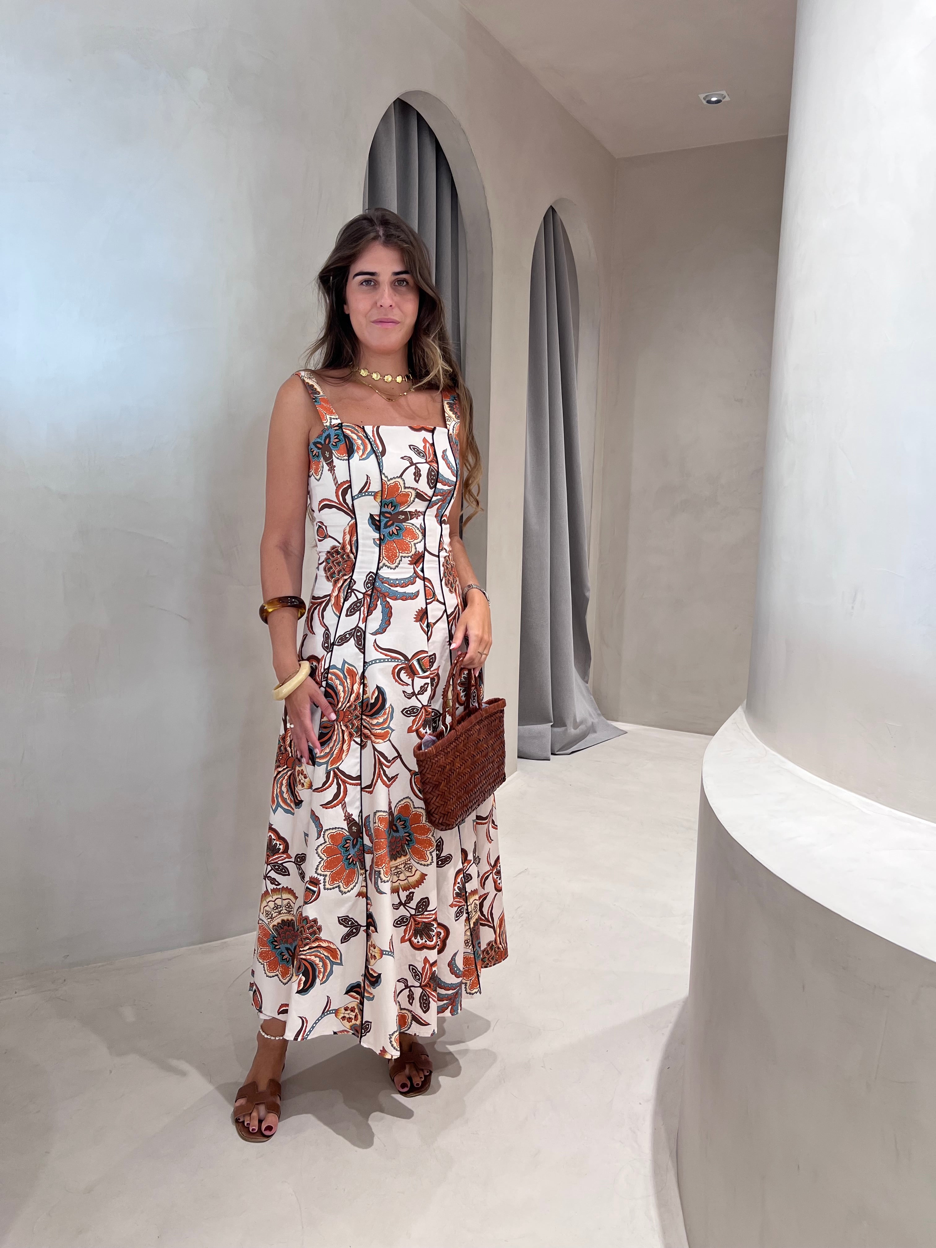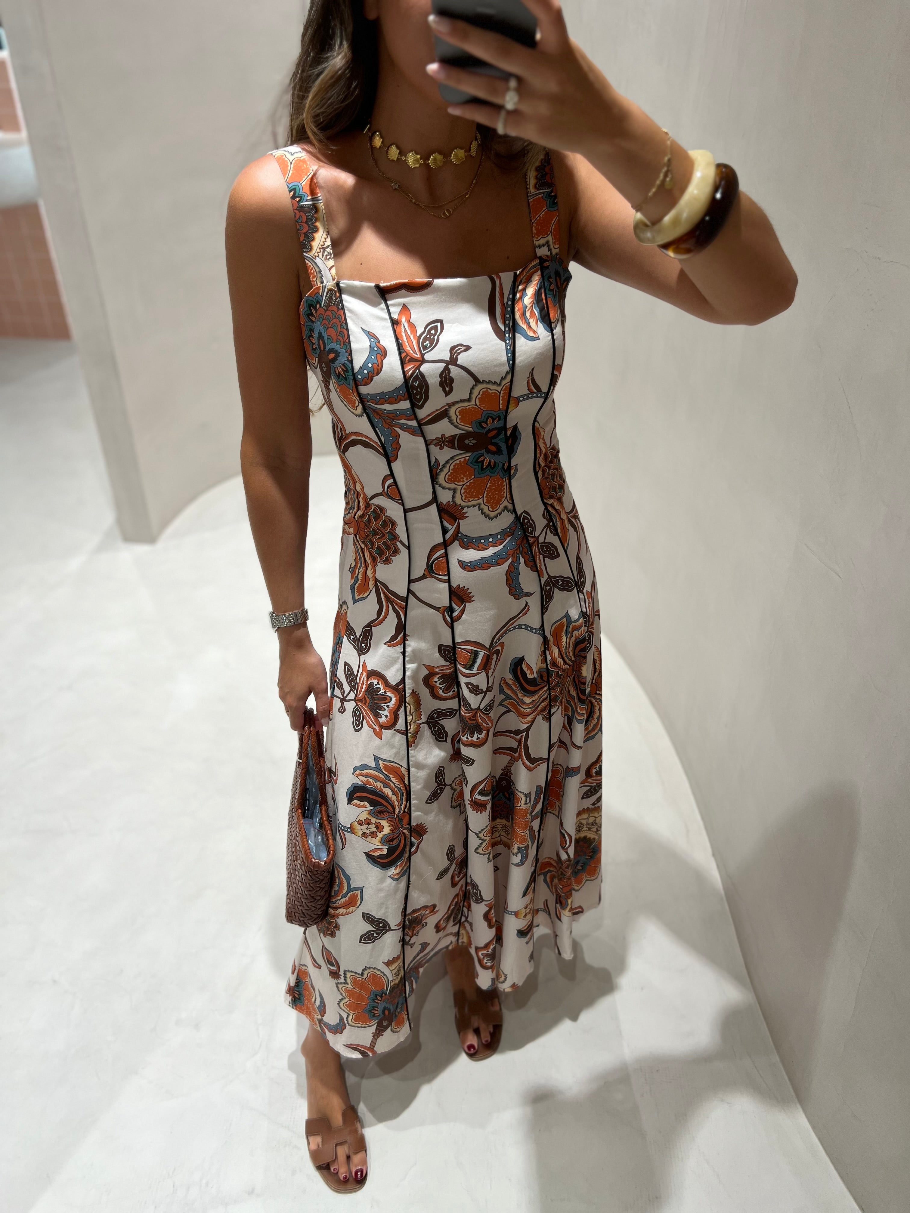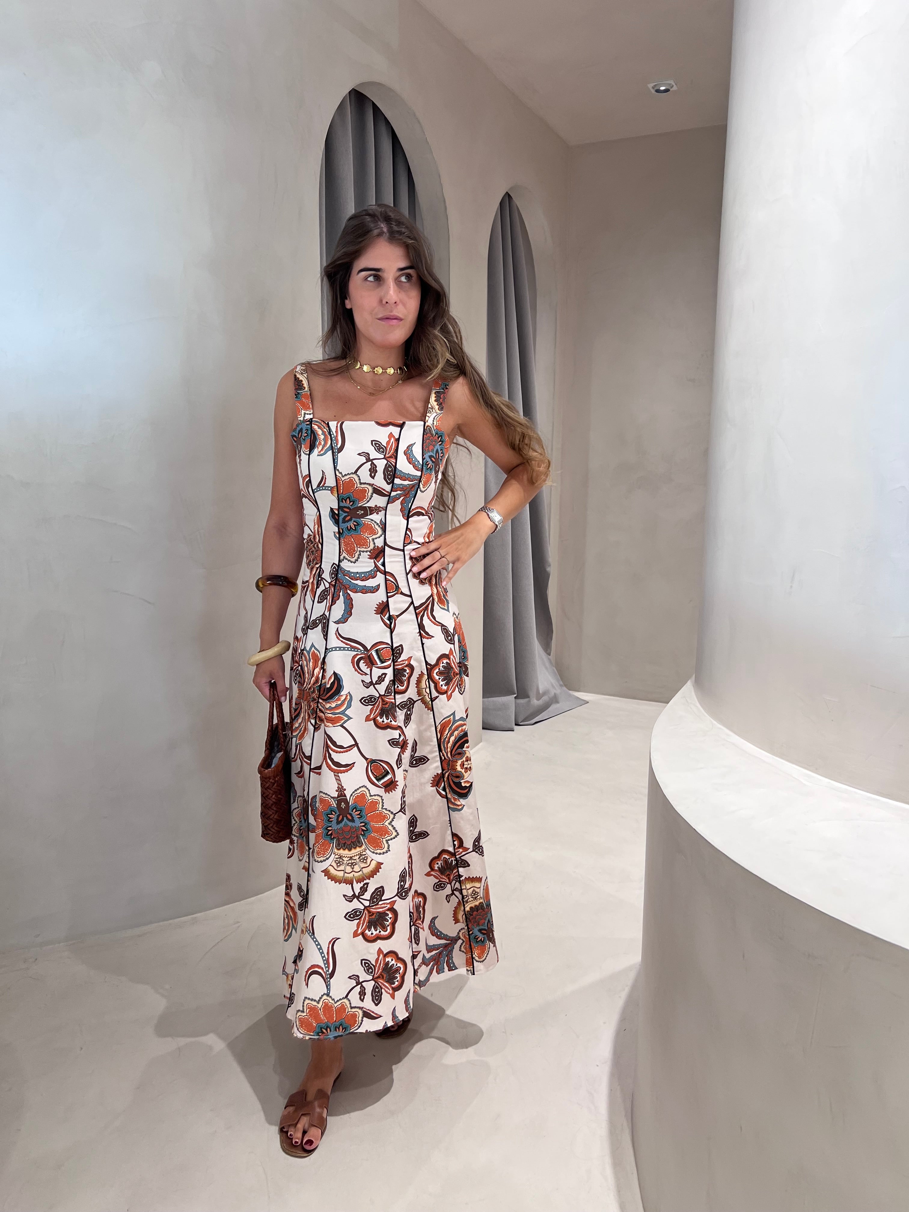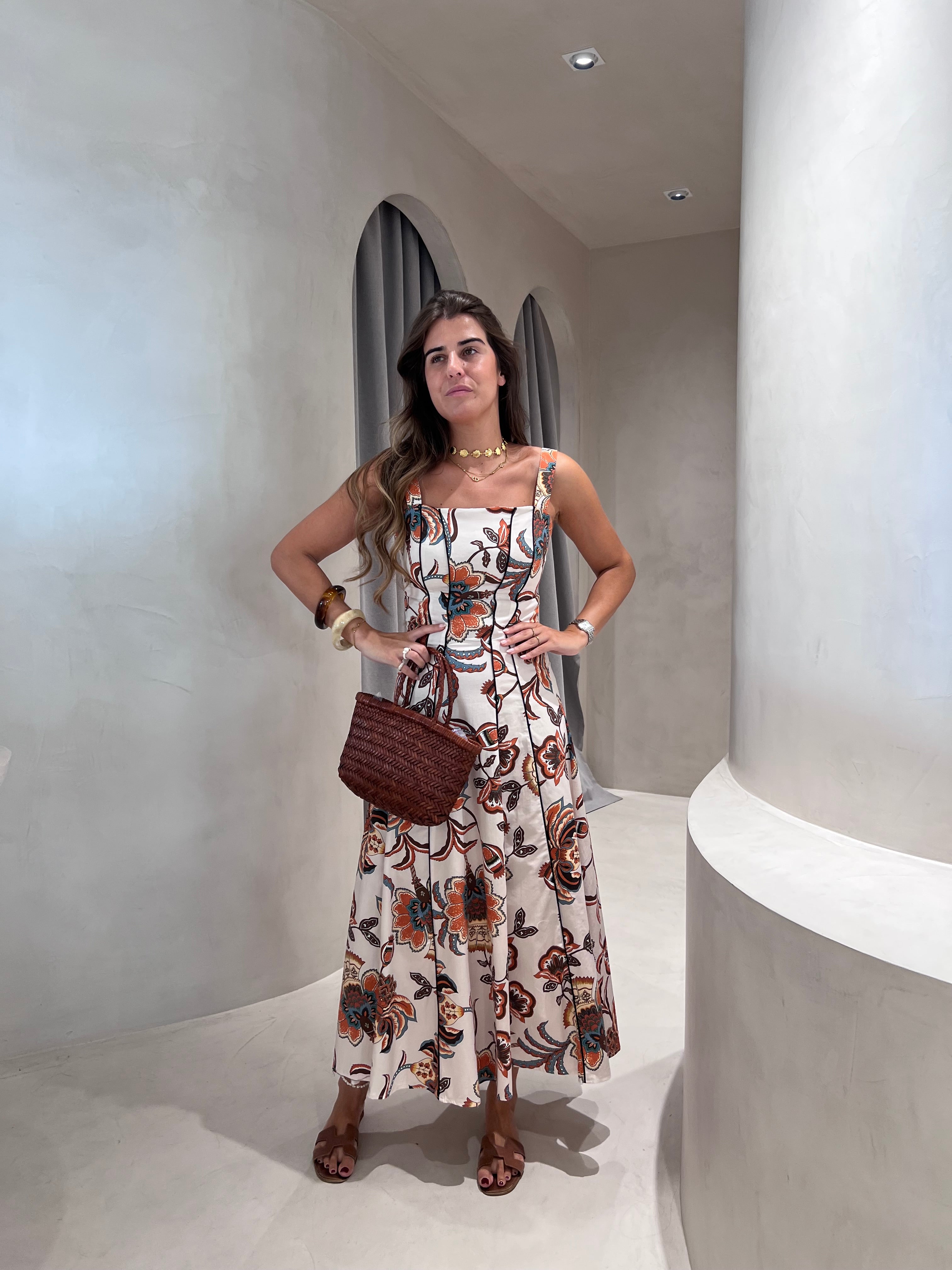 Vestido midi de alças, cintado com print floral e fecho invisível nas costas.