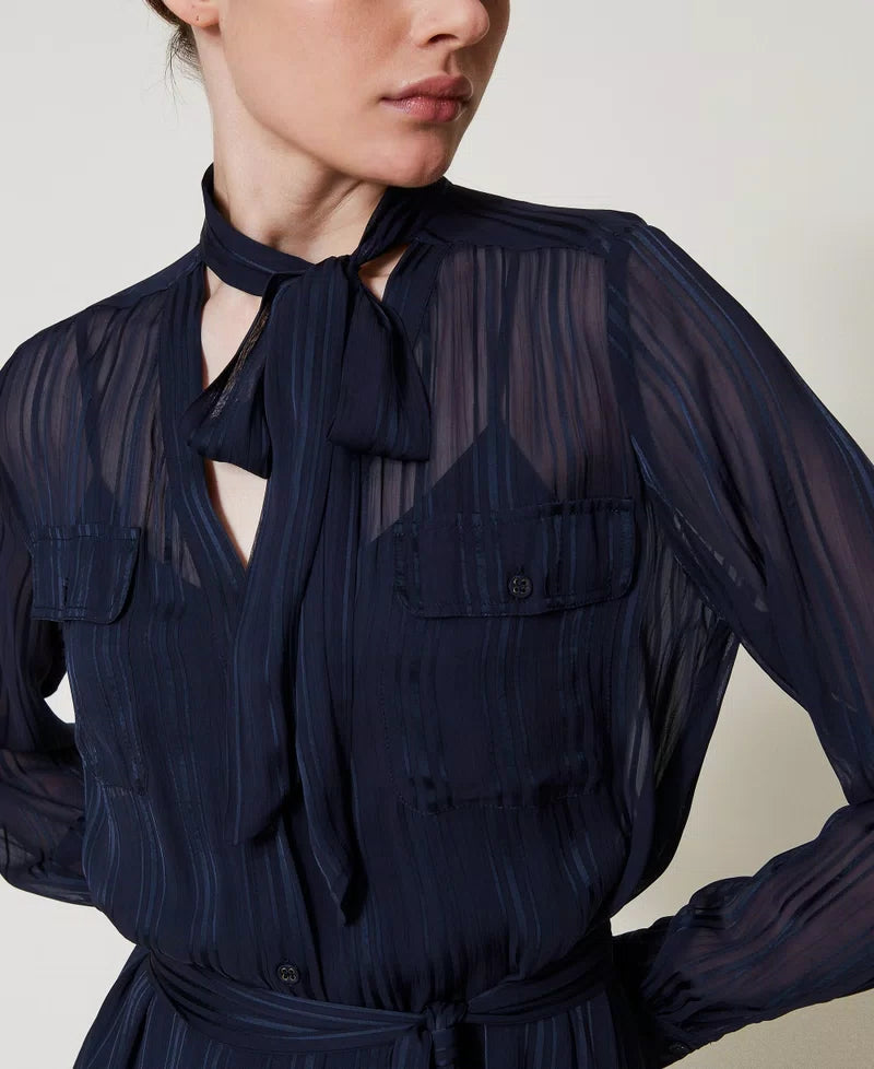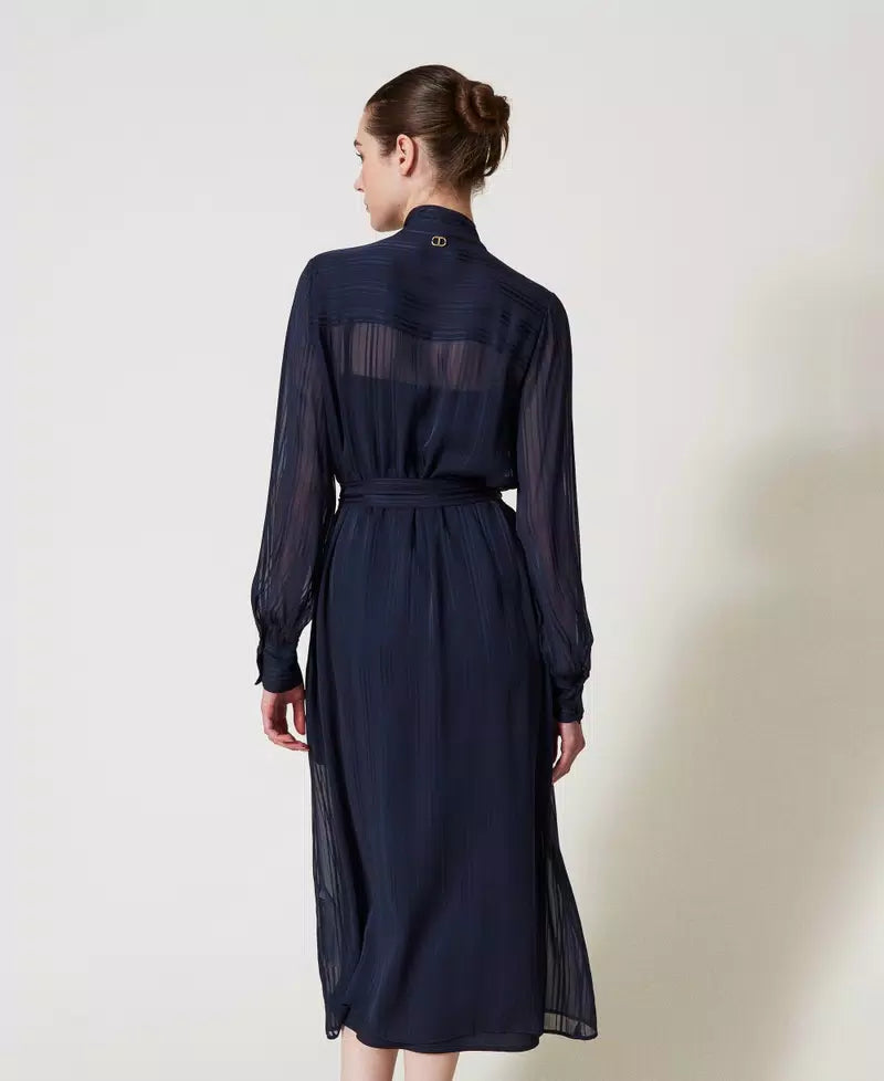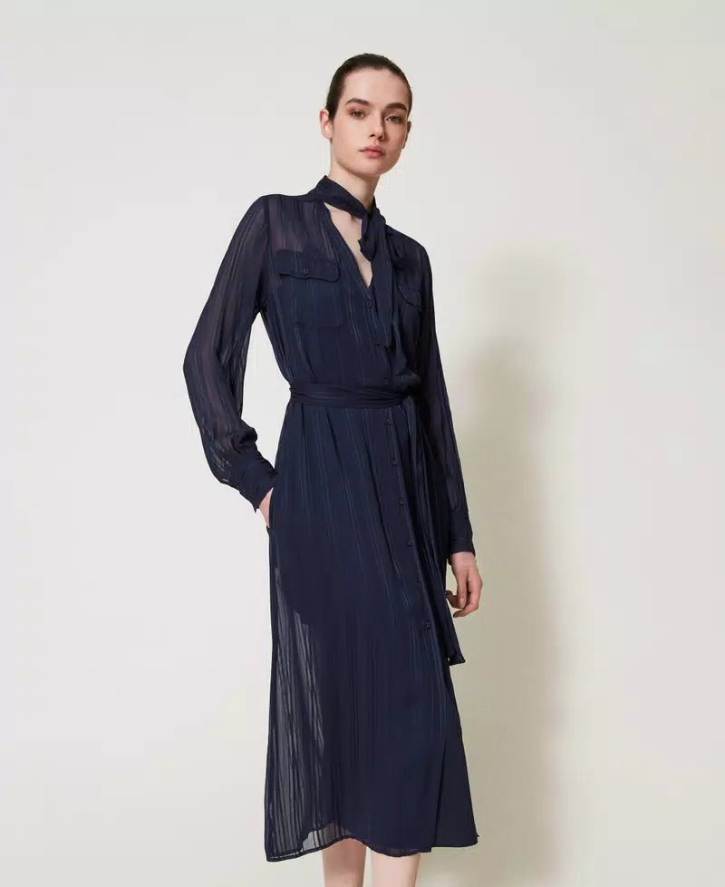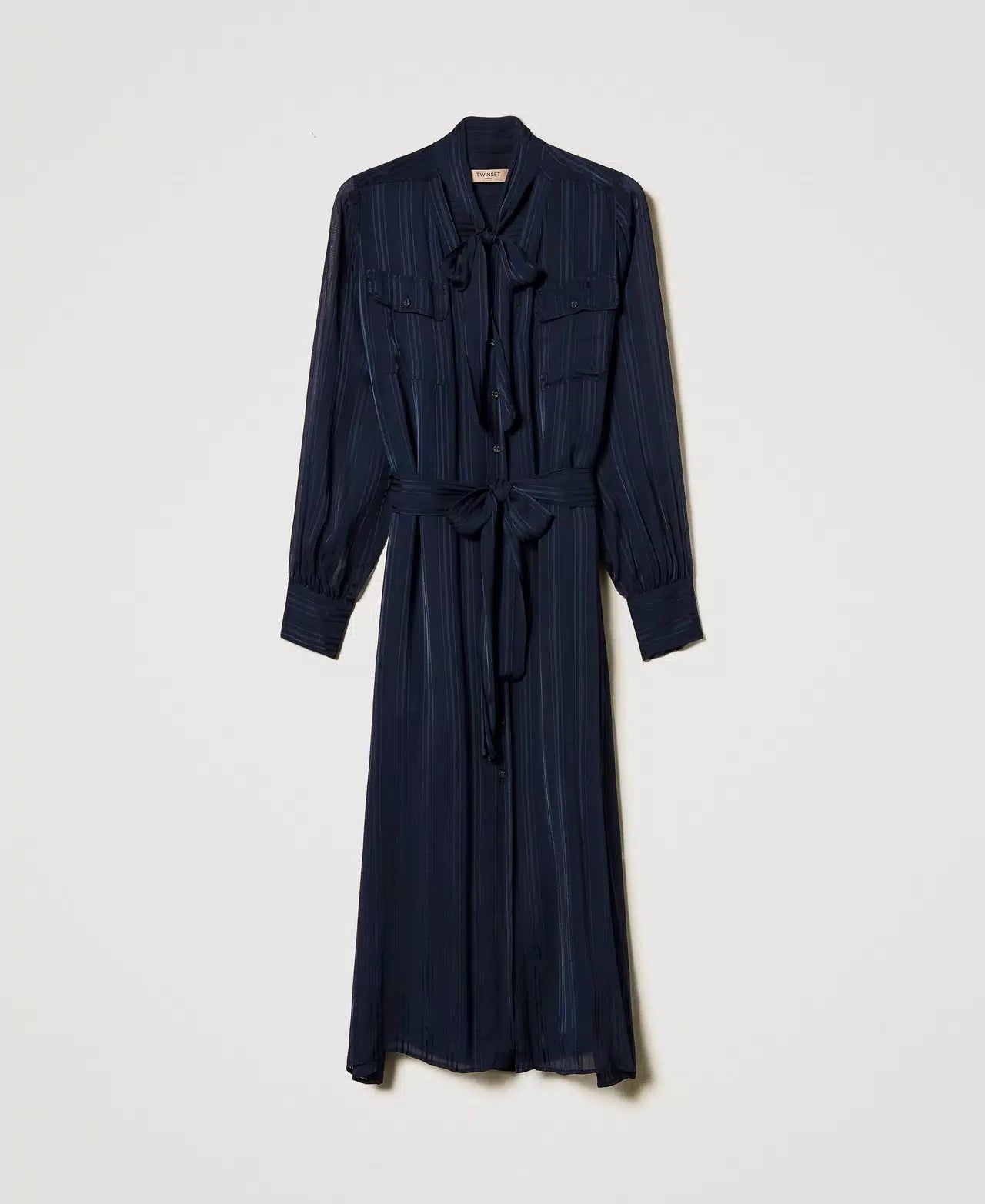 Vestido camiseiro midi acetinado TWINSET azul com decote em V, mangas compridas com punhos, fecho de botões forrados à frente, bolsos nas laterais, cinto de tecido amovível, forro interior amovível.