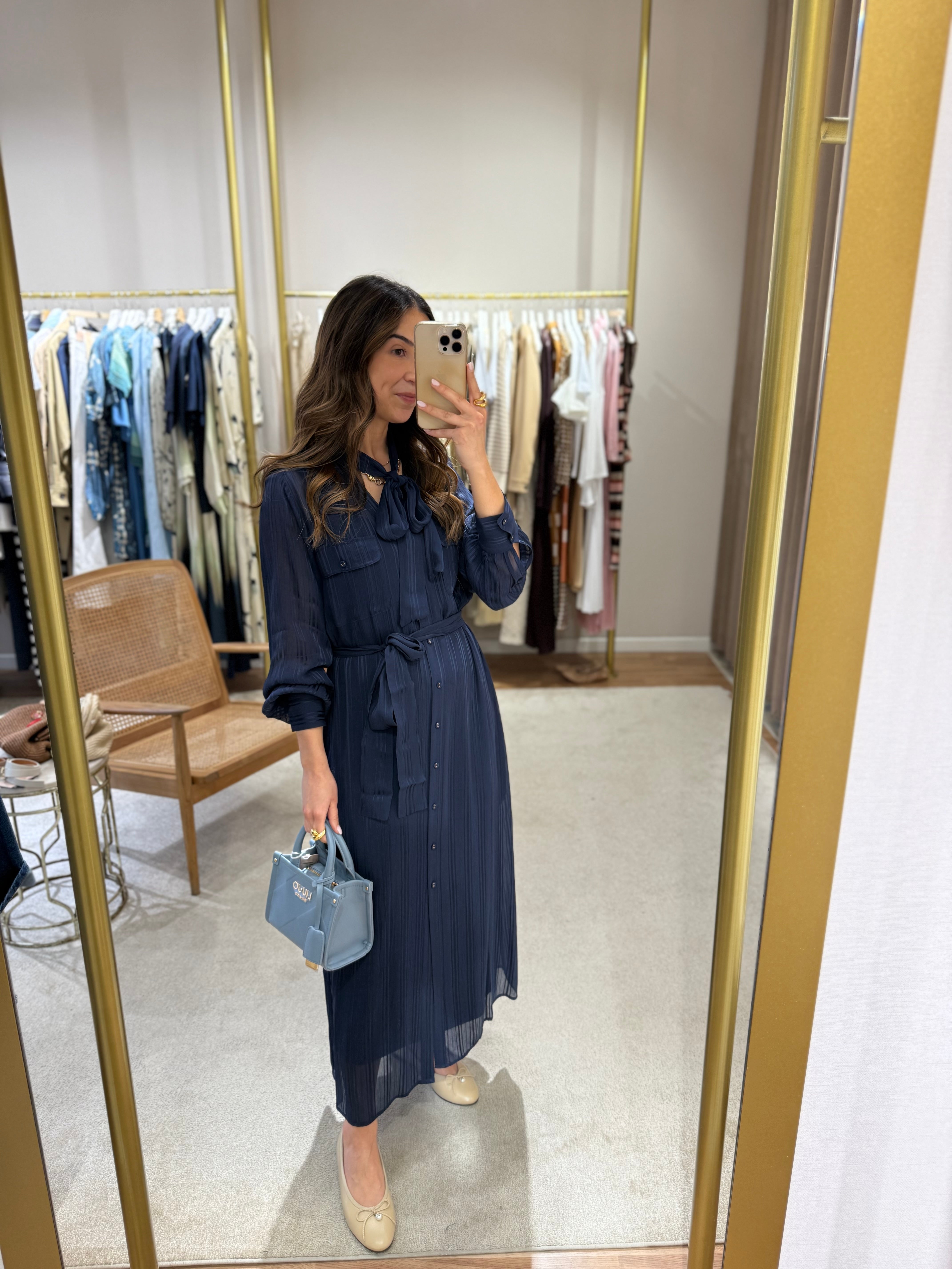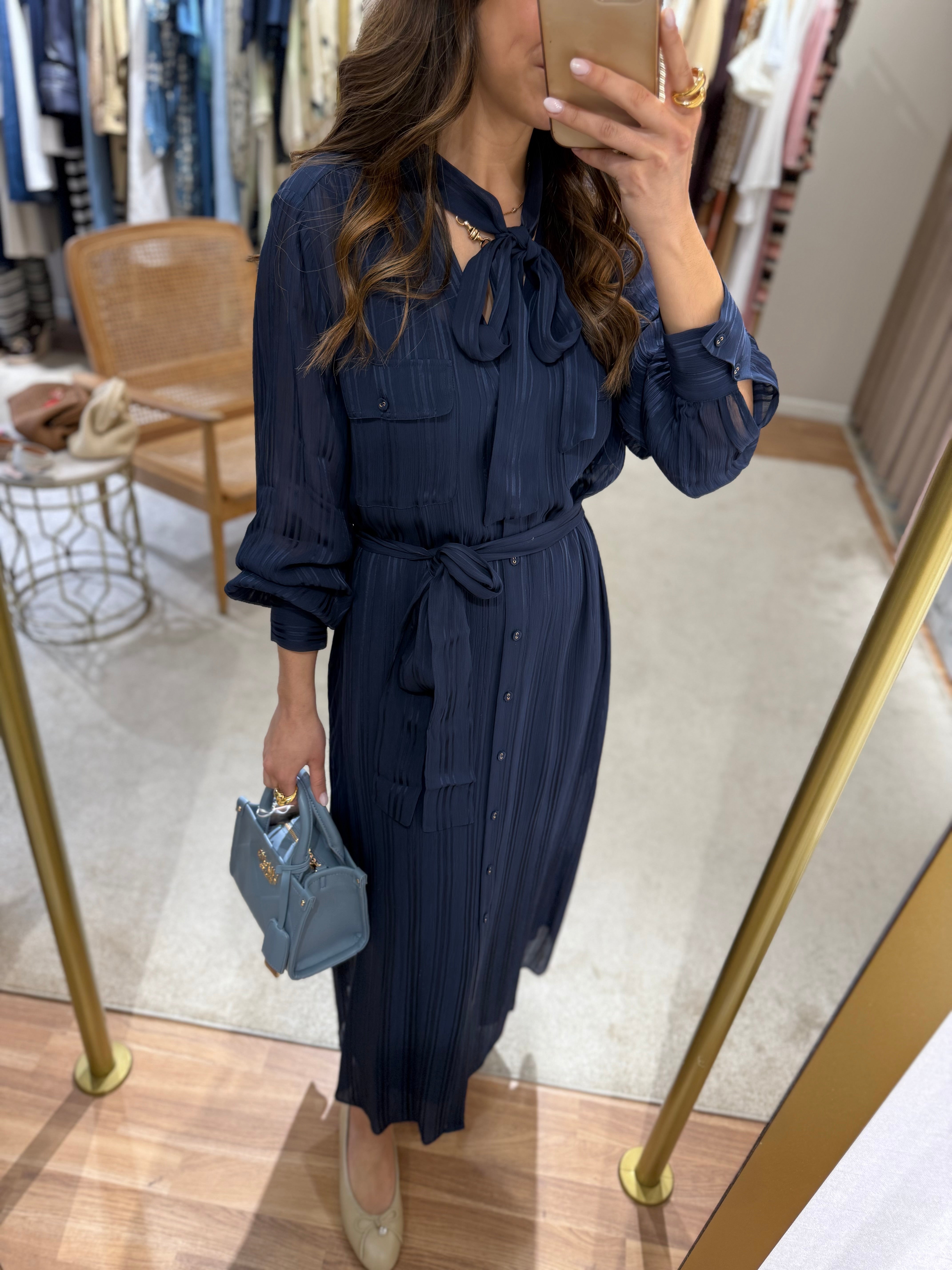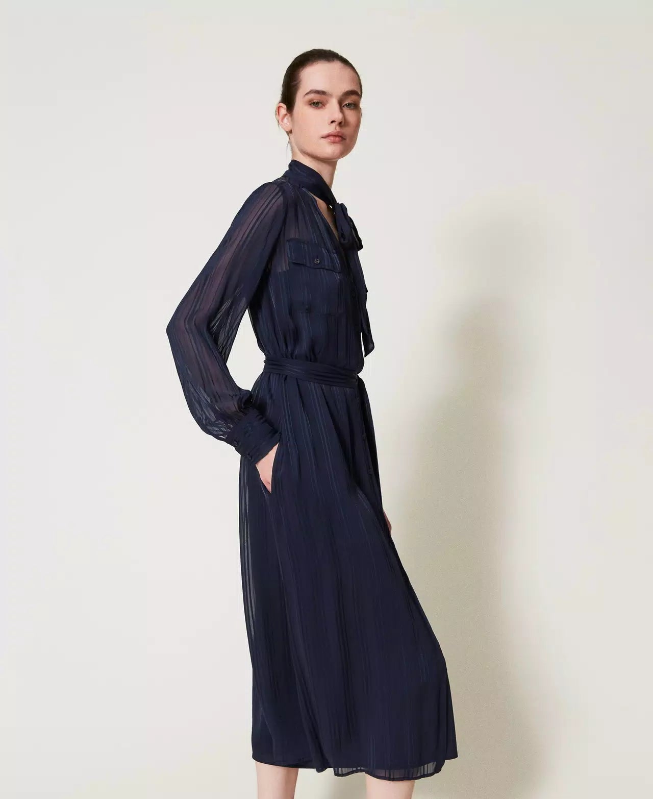 Vestido camiseiro midi acetinado TWINSET azul com decote em V, mangas compridas com punhos, fecho de botões forrados à frente, bolsos nas laterais, cinto de tecido amovível, forro interior amovível.