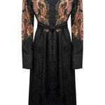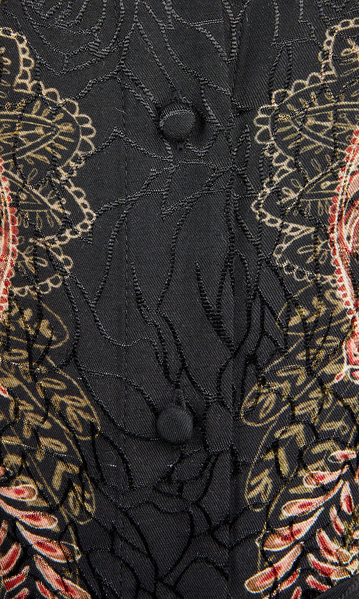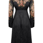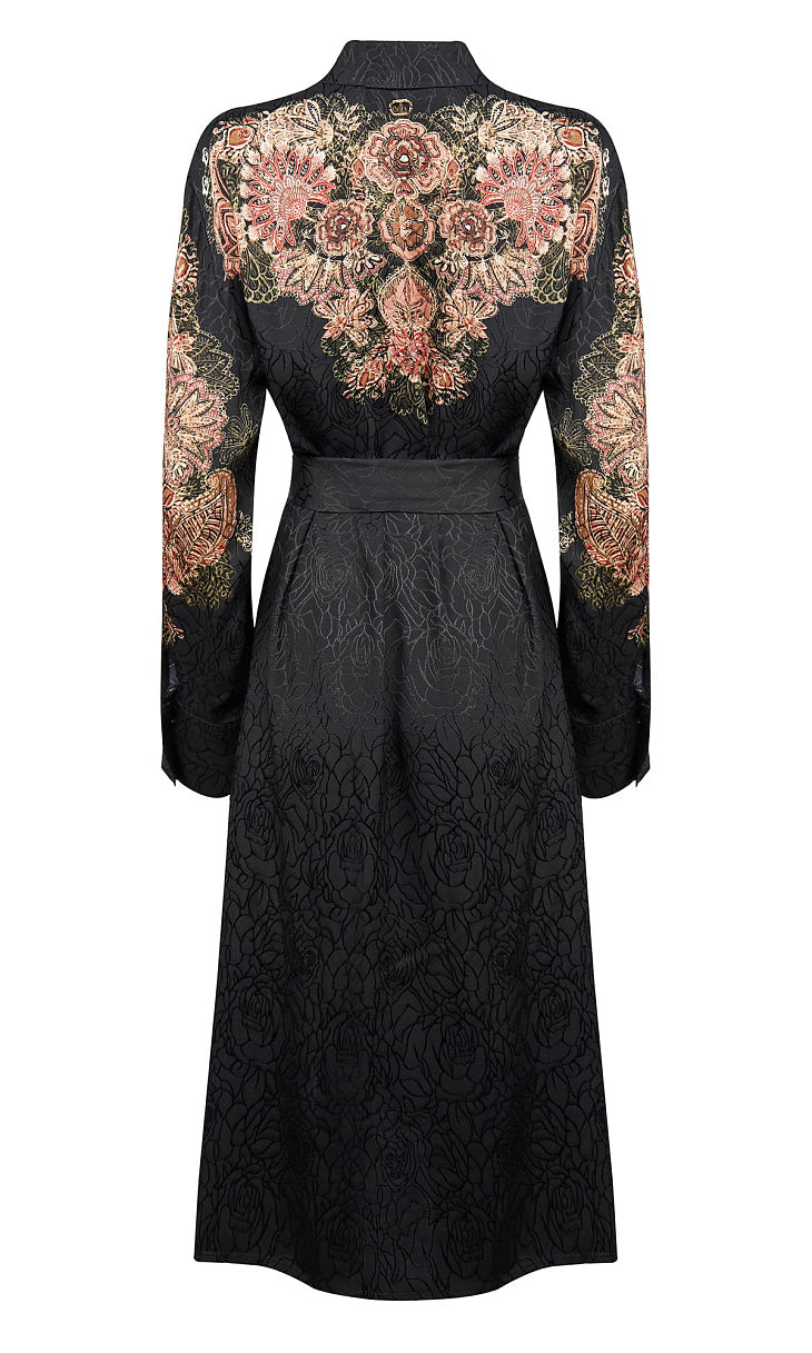 Este vestido camiseiro midi é uma aposta segura para um look elegante e descontraído. Em fundo preto com flores em tons de bordeaux e bege, apresenta gola clássica, botões frontais, mangas compridas com punhos abotoados e cinto no mesmo tecido, que marca a silhueta com subtileza. Um modelo versátil e intemporal — ideal tanto para o dia como para um jantar especial.