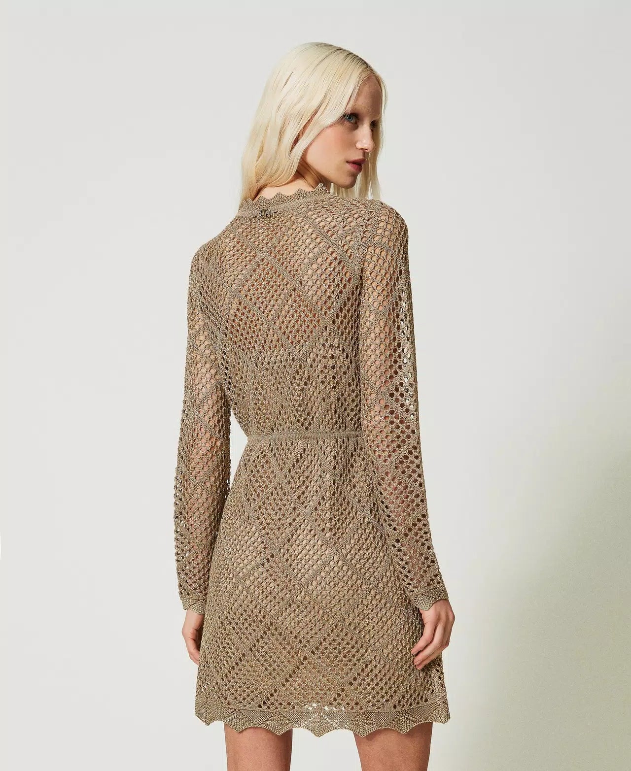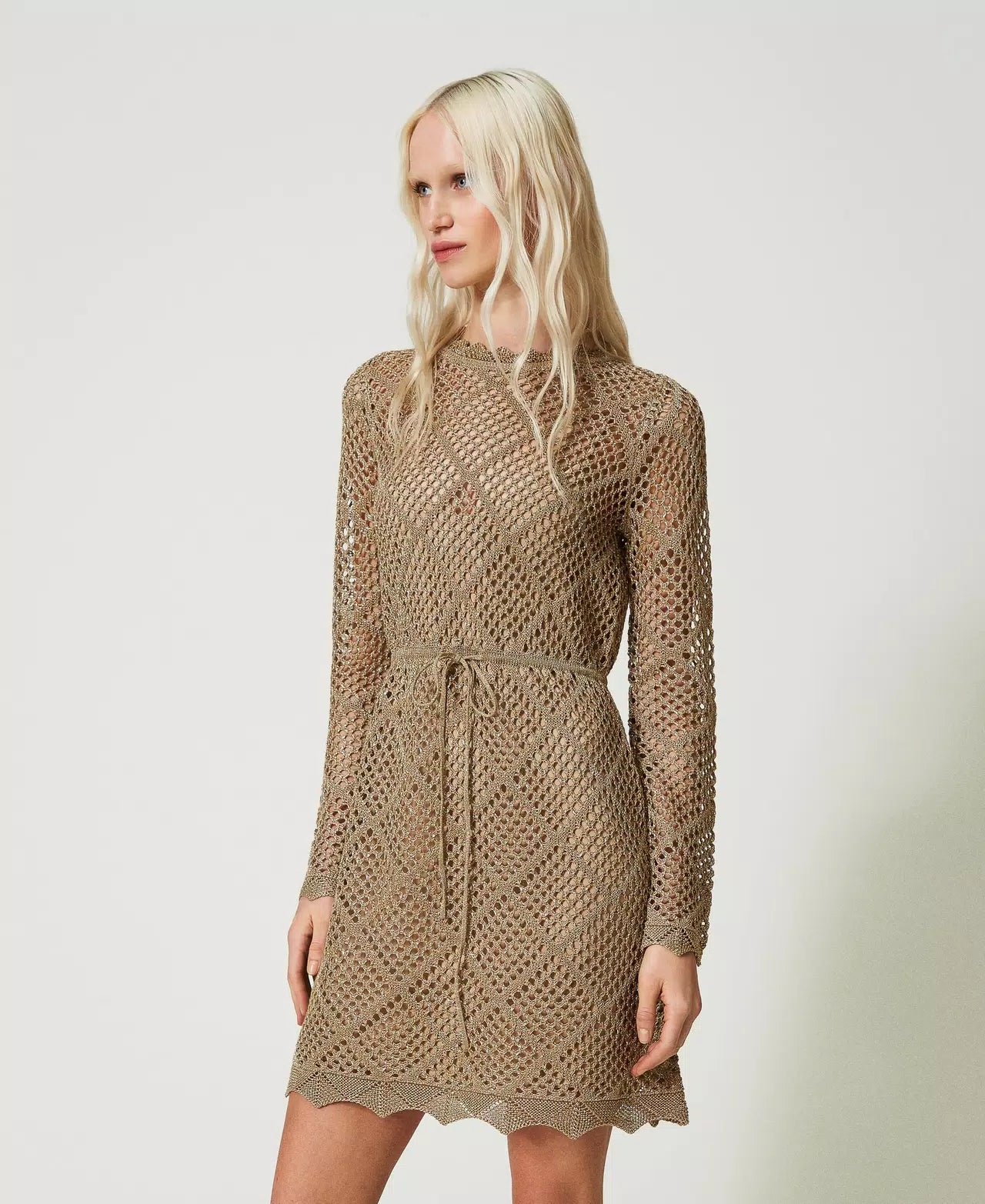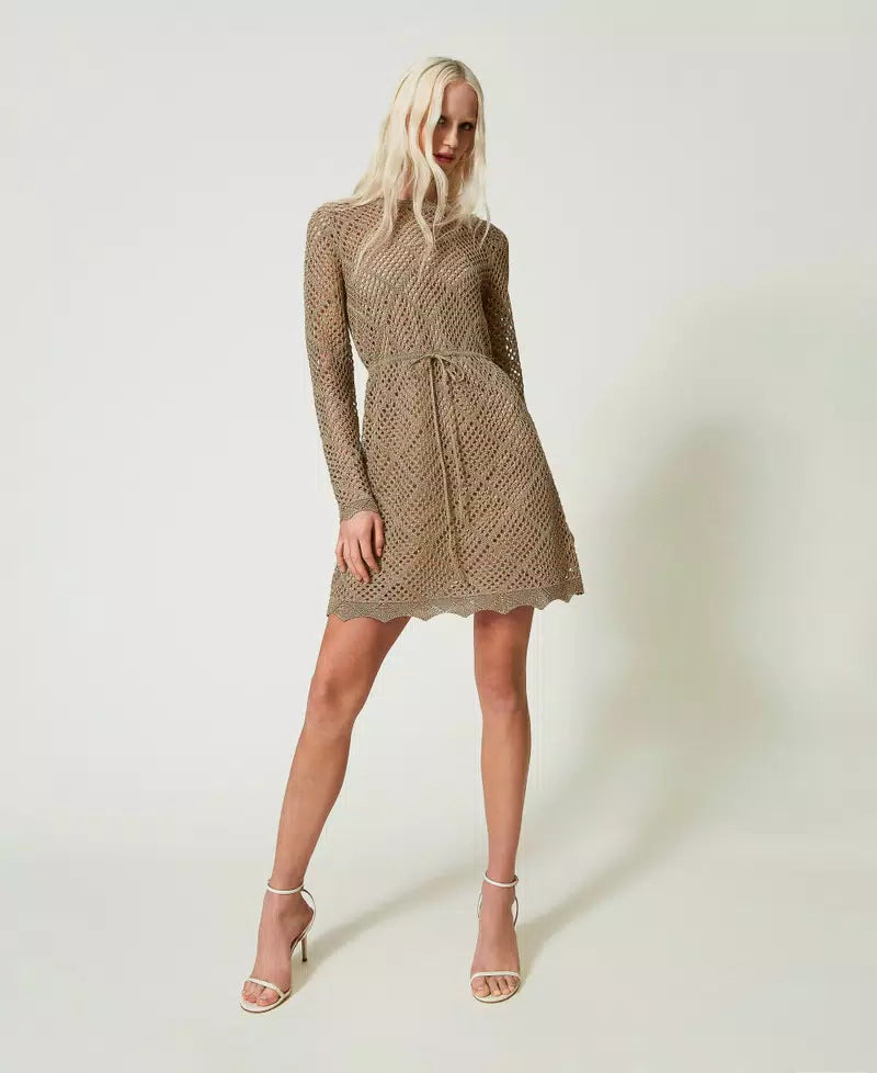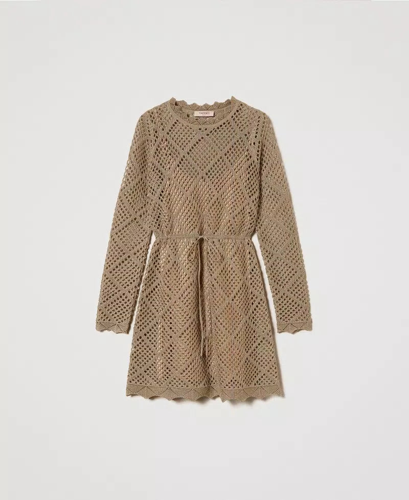 Vestido curto Twinset dourado em malha lurex tricotada, gola redonda, mangas compridas com transparência, cinto ajustável e forro amovível.